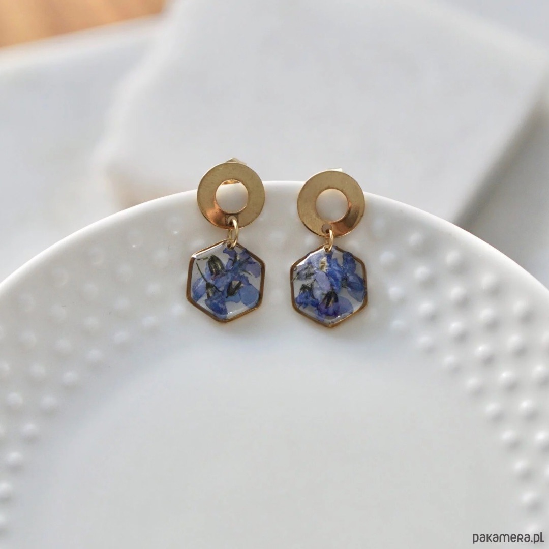 Kolczyki wiszące wykonane ręcznie – wykończone stalą chirurgiczną, suszonymi kwiatami oraz elementami ozdobnymi zatopionymi w żywicy epoksydowej. Długość całkowita kolczyków 20 mm, wielkość zawieszki 10 mm, kolor – złoty. Żywica przezroczysta (nie barwiona). Kolczyki zapinane na sztyft.