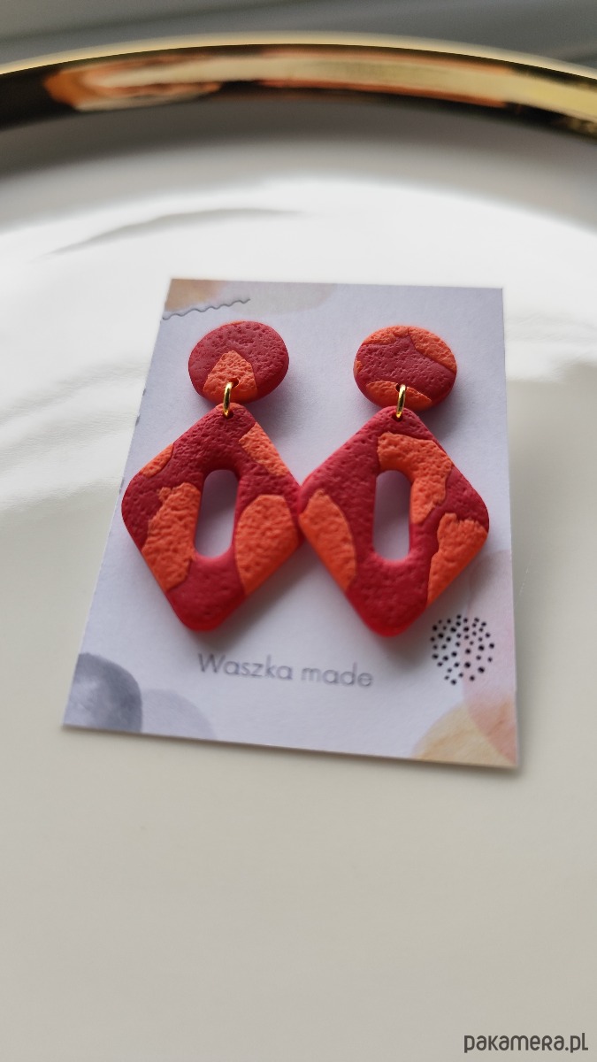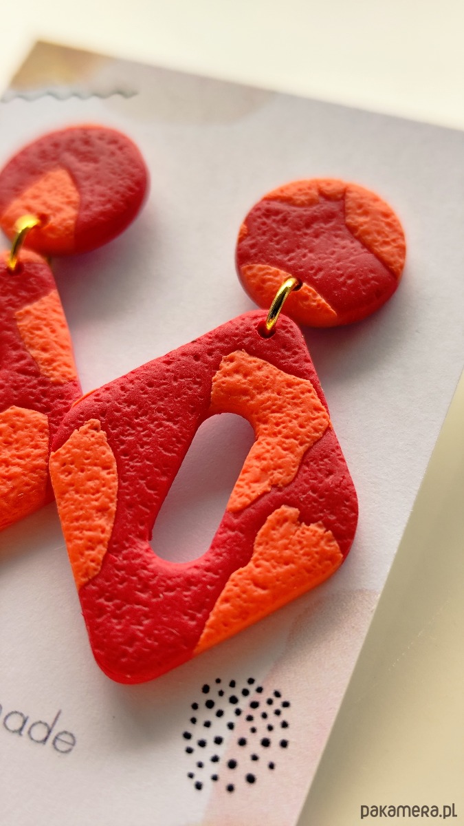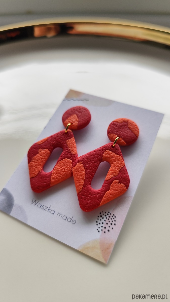 Przepiękne kolczyki w kolorze koralowym. Geometryczny wzór. Elementy metalowe to stal chirurgiczna.