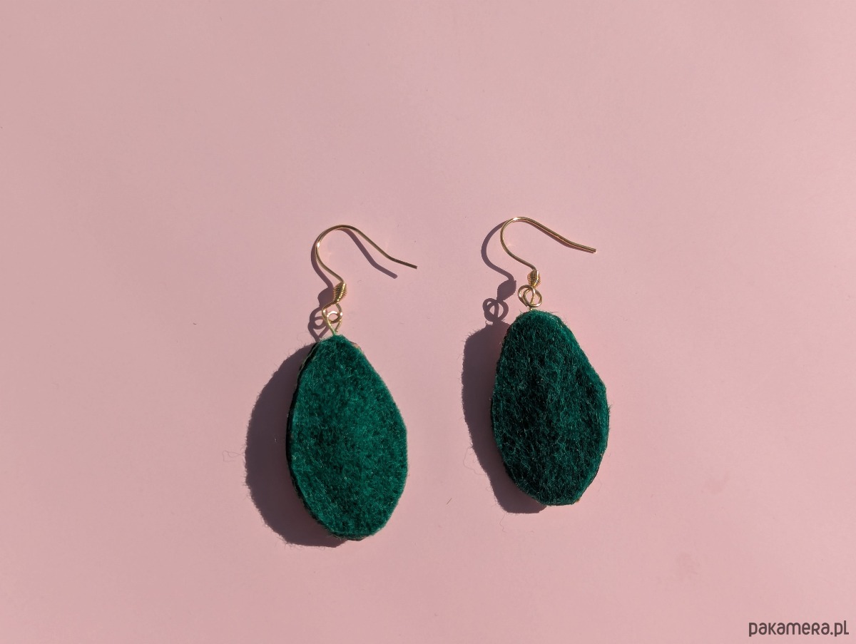 Kolczyki wyhaftowane na bawełnianym materiale przy użyciu bawełnianych nici, ozdobione szklanymi koralikami. Zawieszone na hipoalergicznych biglach ze stali chirurgicznej w kolorze złotym. Tył wykończony filcem.