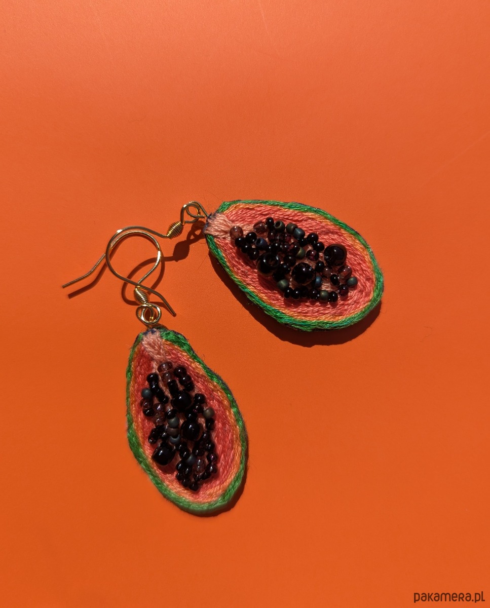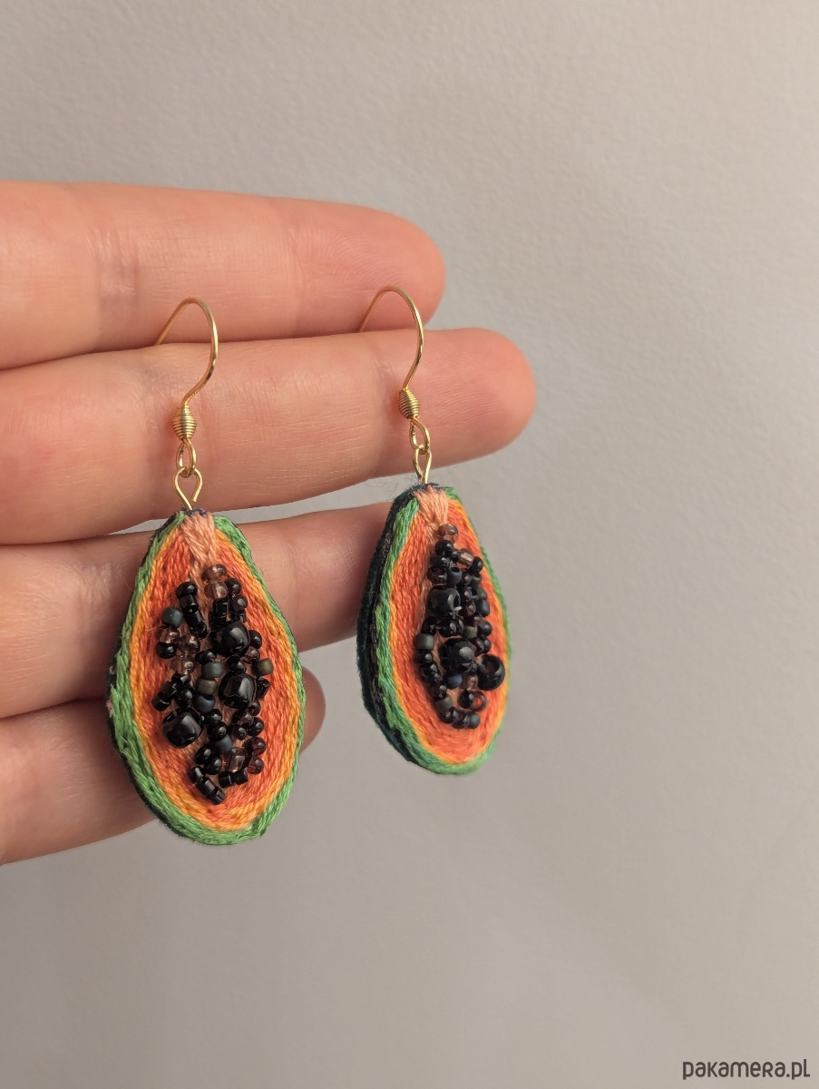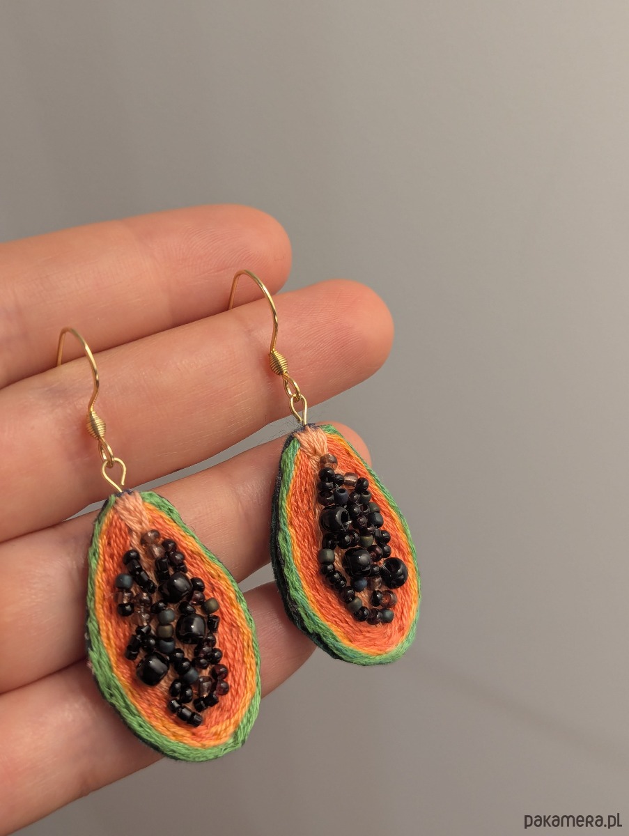 Wiszące kolczyki papaje wykonane metodą haftu ręcznego. Nasionami owocu są szklane koraliki, które dodają kolczykom wypukłości i ciekawej tekstury :)