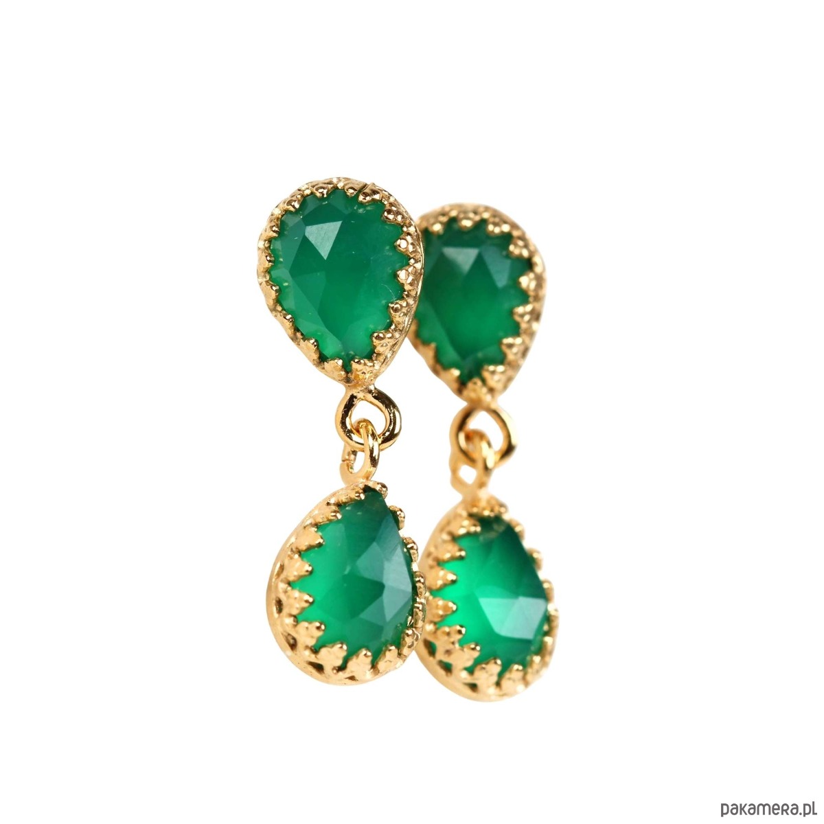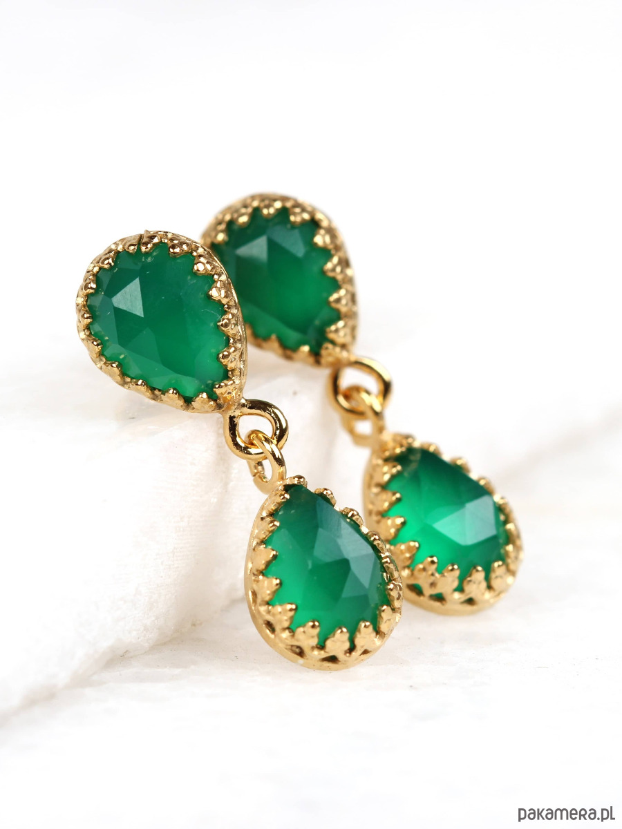 Ręcznie wykonane kolczyki ze srebra pokrytego 24-karatowym złotem z agatem zielonym. od spodu wykończone kwiecistym wzorem