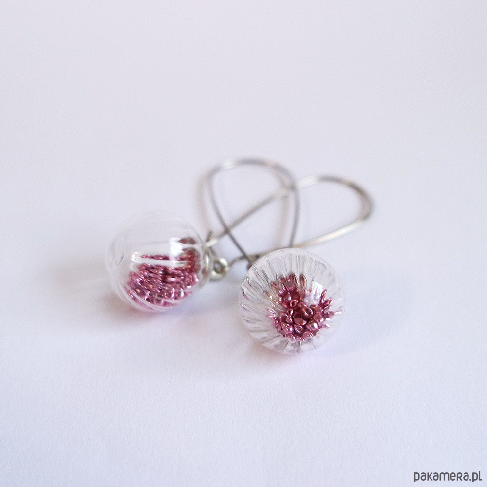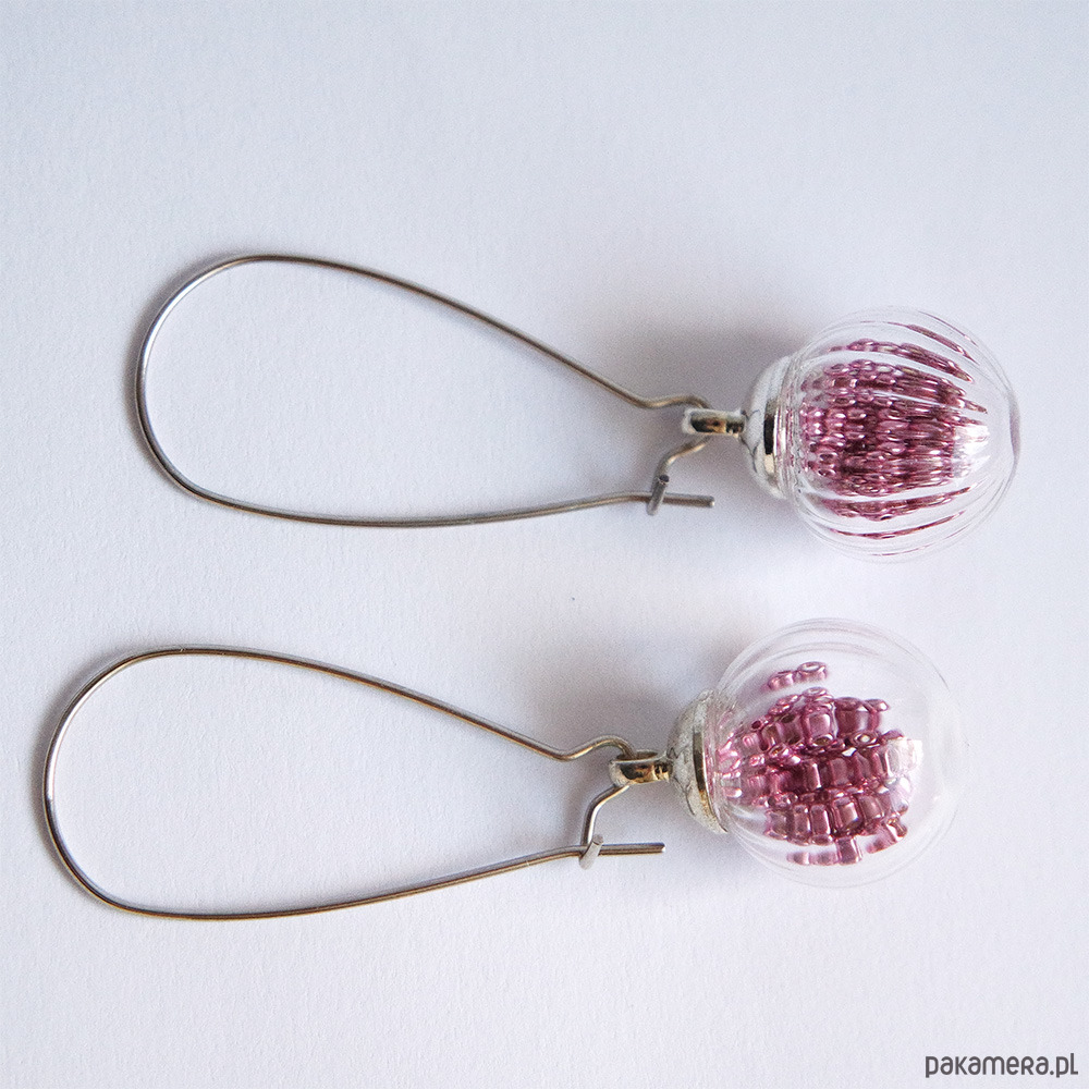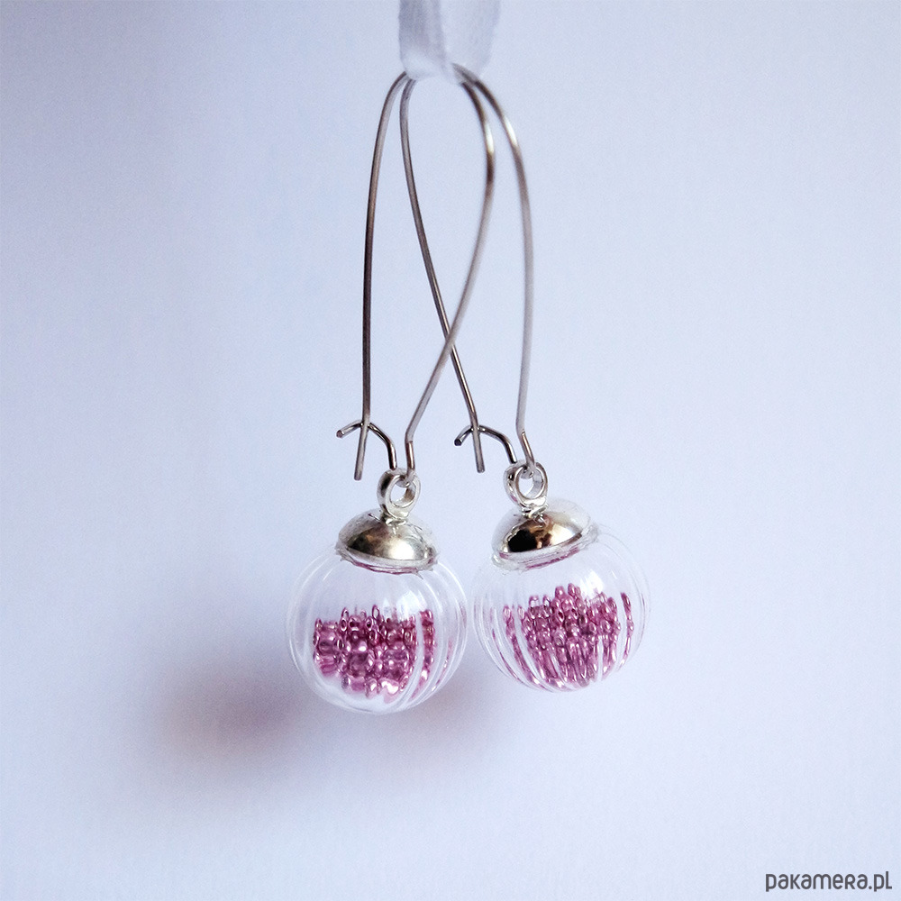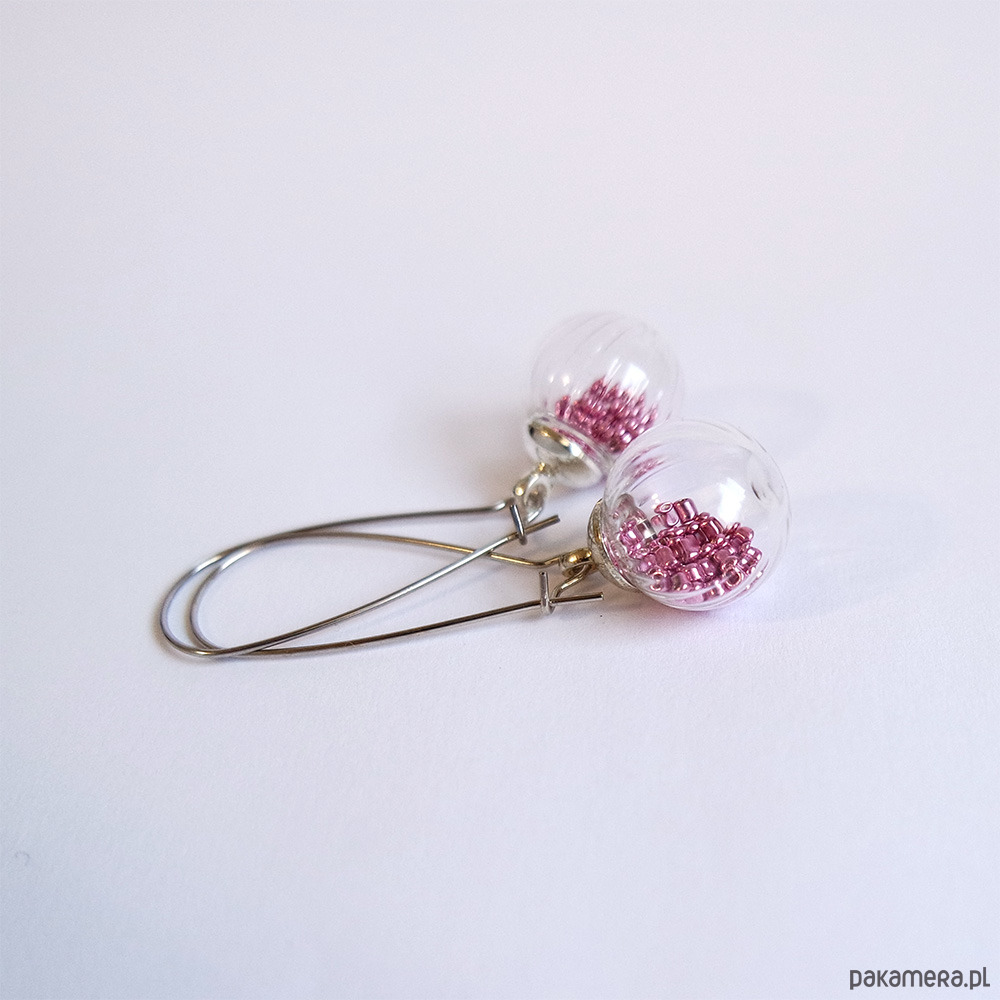 Liliowo - różowe koraliki umieszczone w delikatnie fasetowanych, szklanych bańkach o średnicy ok. 1,2 cm.
