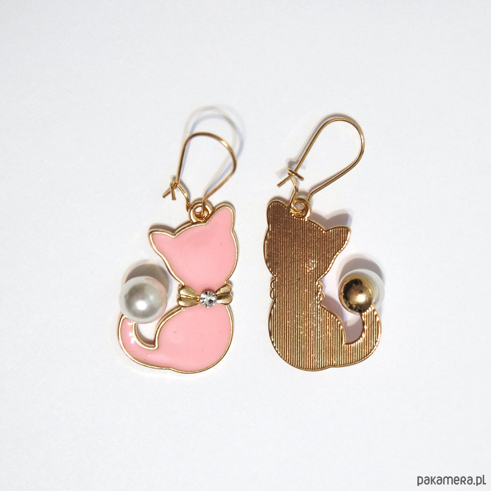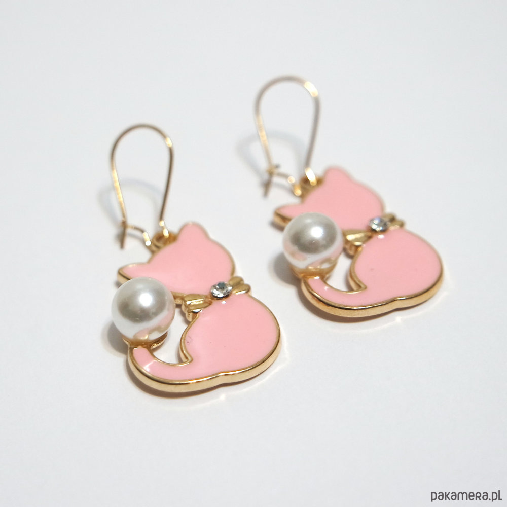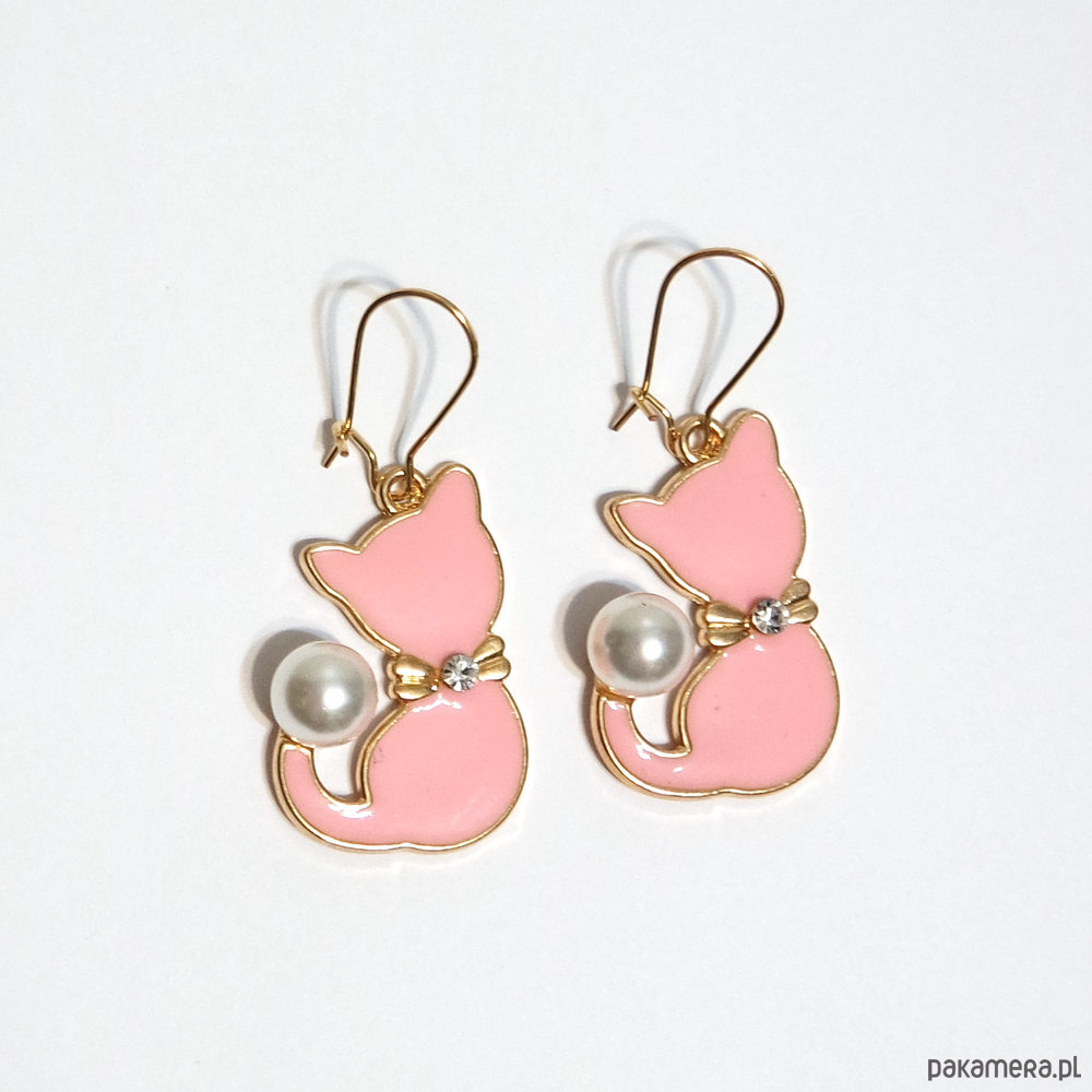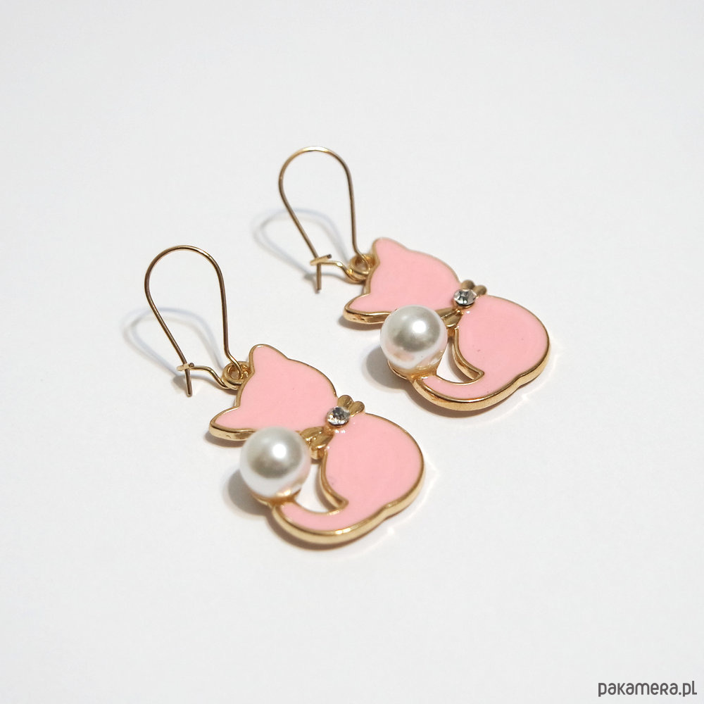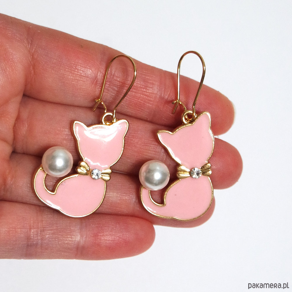 Urocze kolczyki z piękną, emaliowaną zawieszką w kształcie kotka z dodatkiem perły syntetycznej.