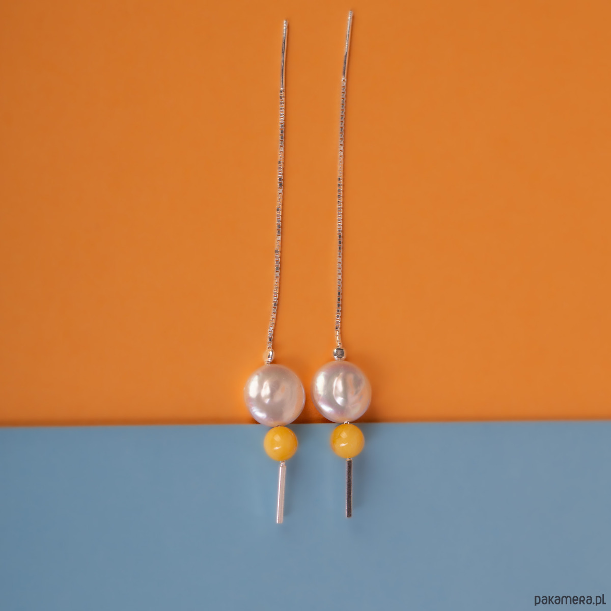 Delikatne, minimalistyczne kolczyki wiszące ze srebra próby 925. Długi, cienki łańcuszek przechodzi przez dziurkę w uchu, a na jego końcu zawieszają się dwa elementy: duża, szlachetna perła słodkowodna (dysk) oraz mała, złocista kulka bursztynu bałtyckiego. Kombinacja mlecznej bieli perły z ciepłym, miodowym bursztynem tworzy harmonijną, nowoczesną całość. To biżuteria dla osób, które cenią lekkość i elegancję.