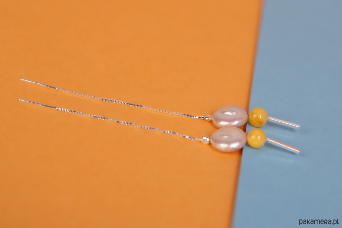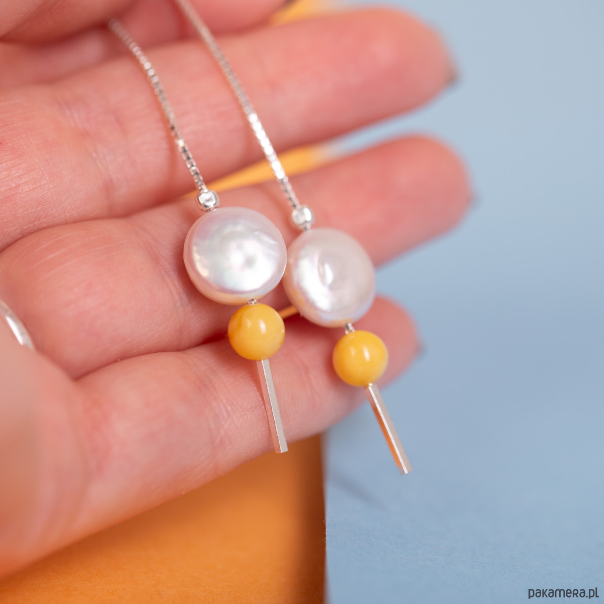 Srebro próby 925 · naturalna perła słodkowodna (dysk, średnica 1 cm) · naturalny bursztyn bałtycki (kulka, średnica 0,6 cm) · waga 2,5 g · długość 7,4 cm + sztyft · kolczyki przeciągane (łańcuszkowe) · ręczna praca autorska