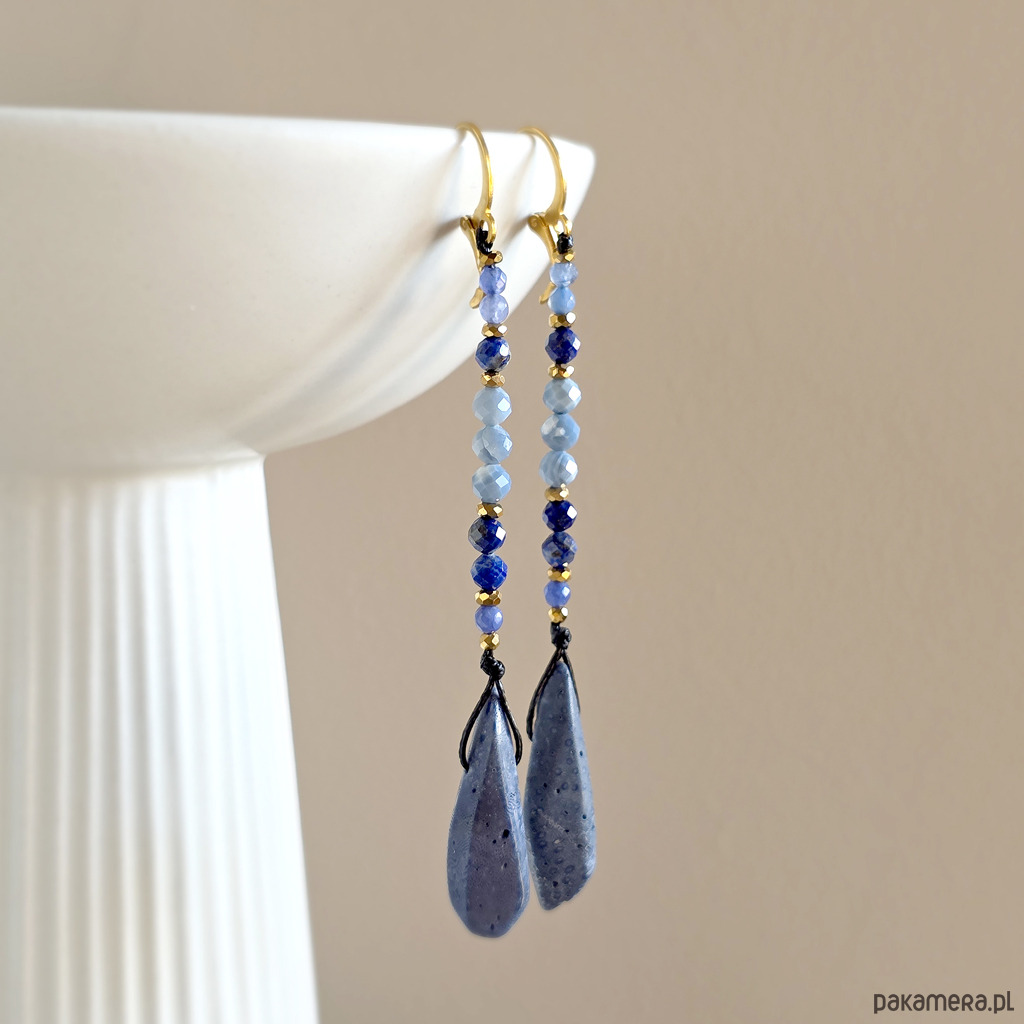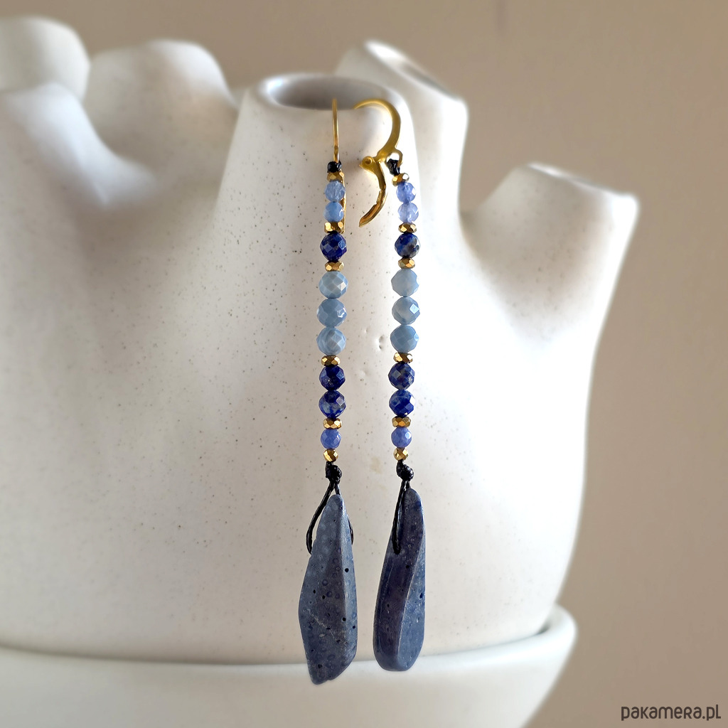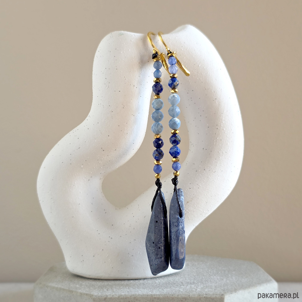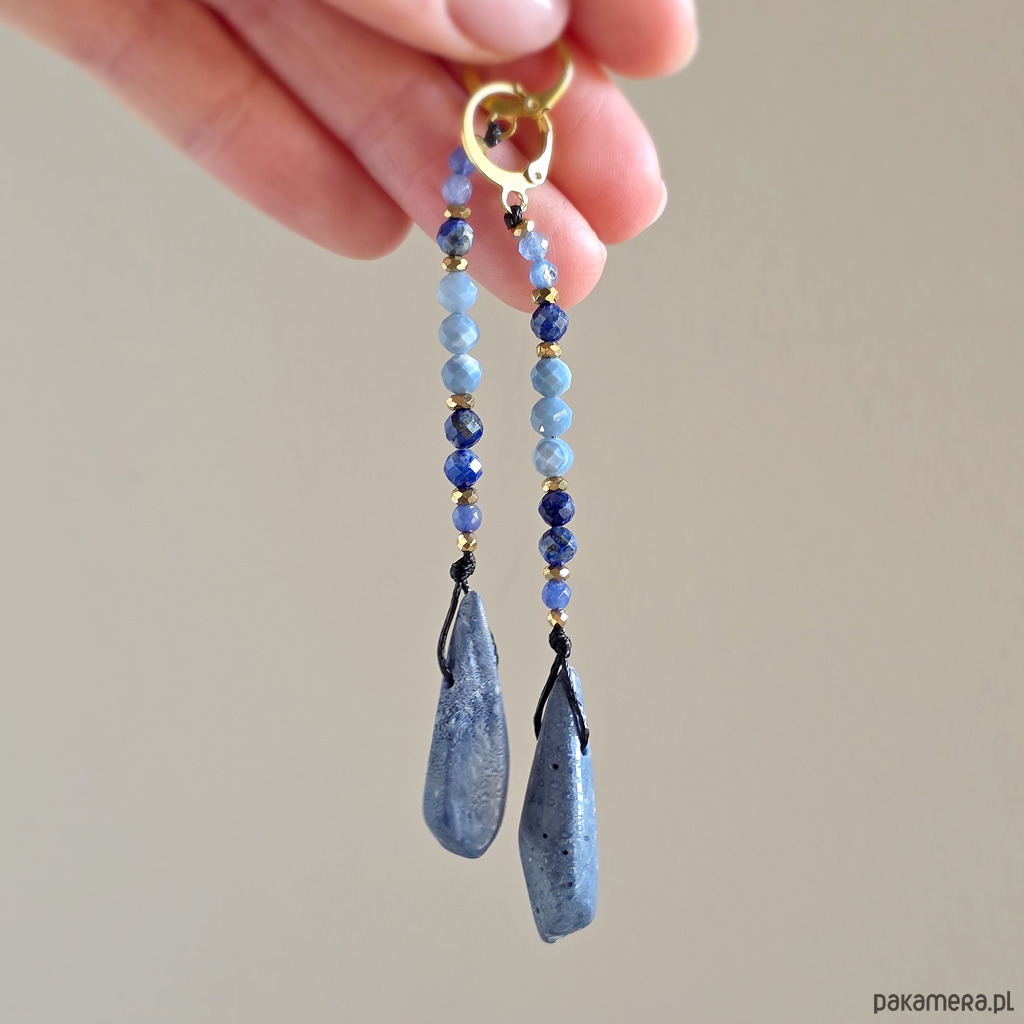 Kolczyki zostały ręcznie wykonane z wysokiej jakości elementów ze stali chirurgicznej, naturalnego niebieskiego korala oraz kamieni naturalnych: niebieskiego agatu, lapisu lazuli i niebieskiego opalu. Całość dopełniają złote przekładki z hematytu, które dodają biżuterii elegancji i energetycznej równowagi.