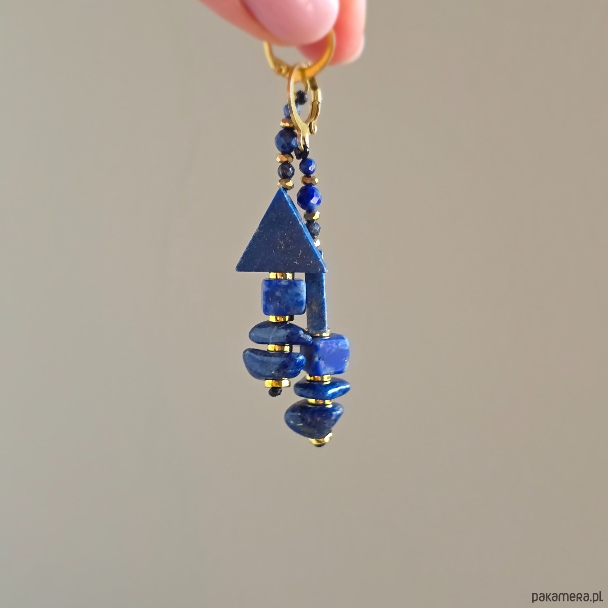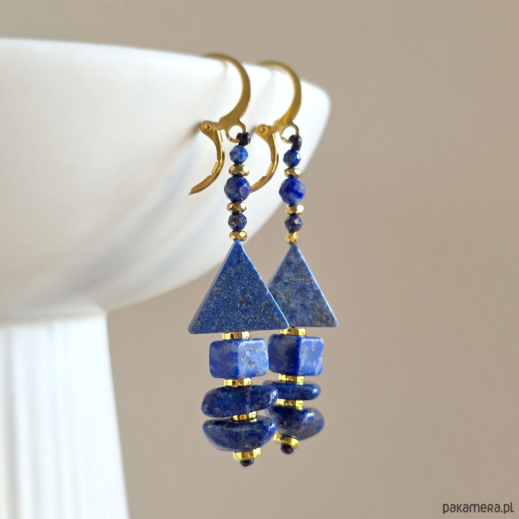 Kolczyki są ręcznie wykonane z wysokiej jakości elementów ze stali chirurgicznej oraz naturalnego lapisu lazuli. Całość dopełniają złote przekładki z hematytu, które dodają biżuterii elegancji i energetycznej równowagi.