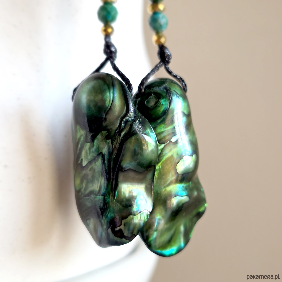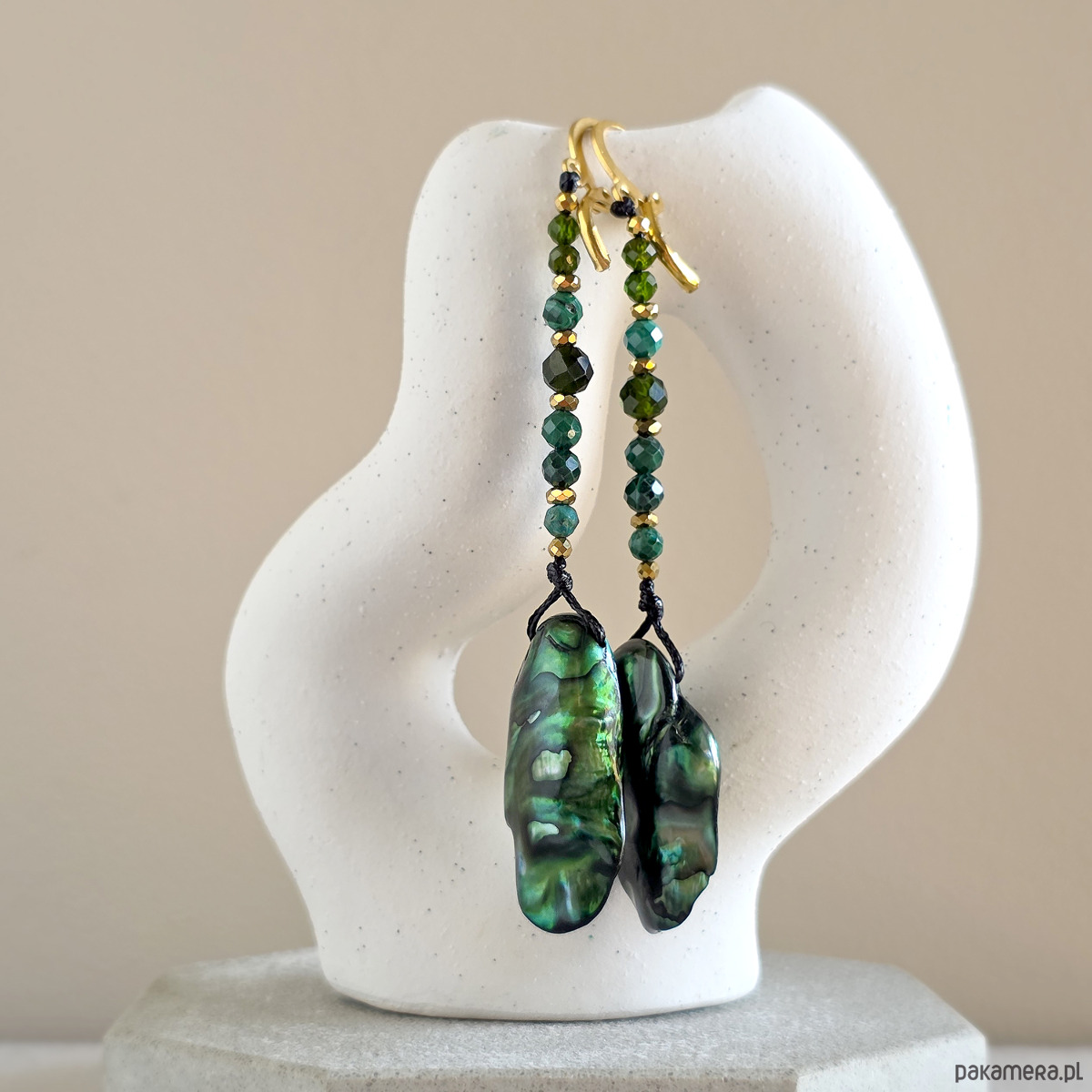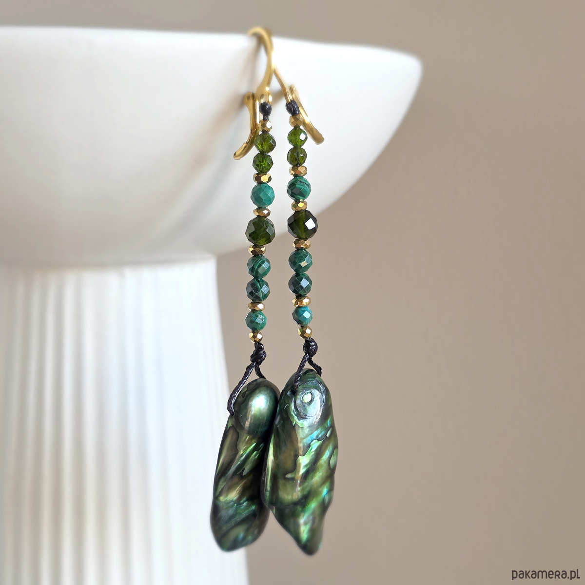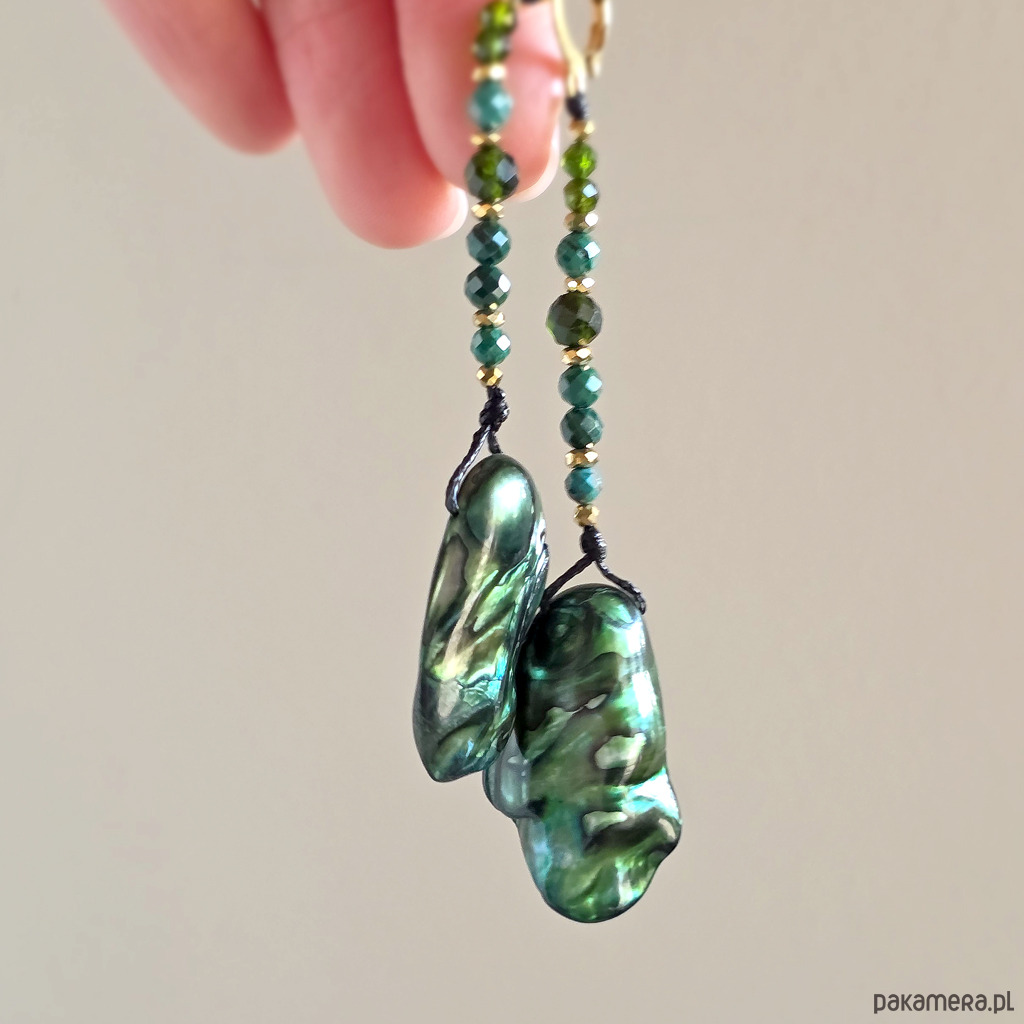 Kolczyki wiszące UNIKAT macica perłowa, malachit, diopsyd