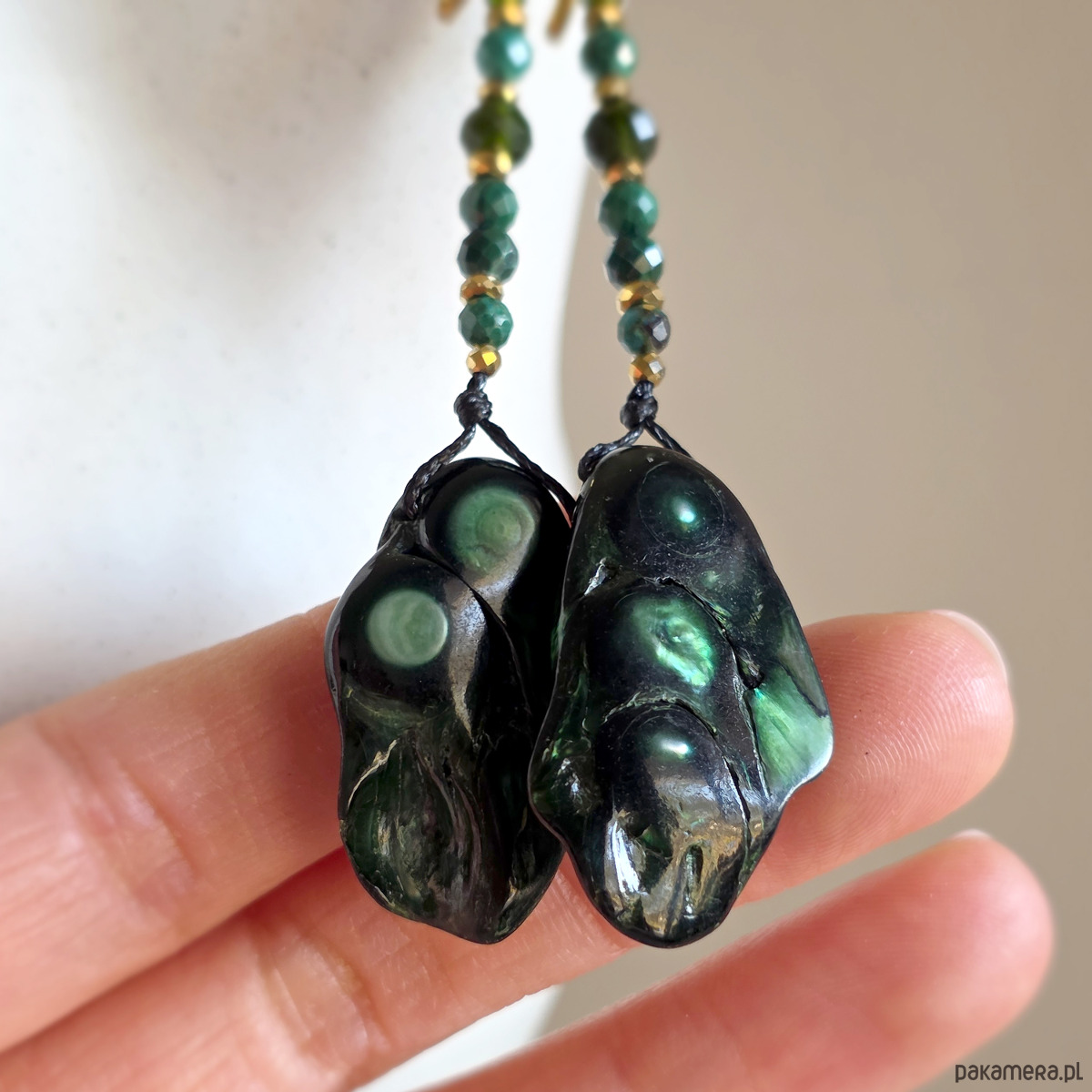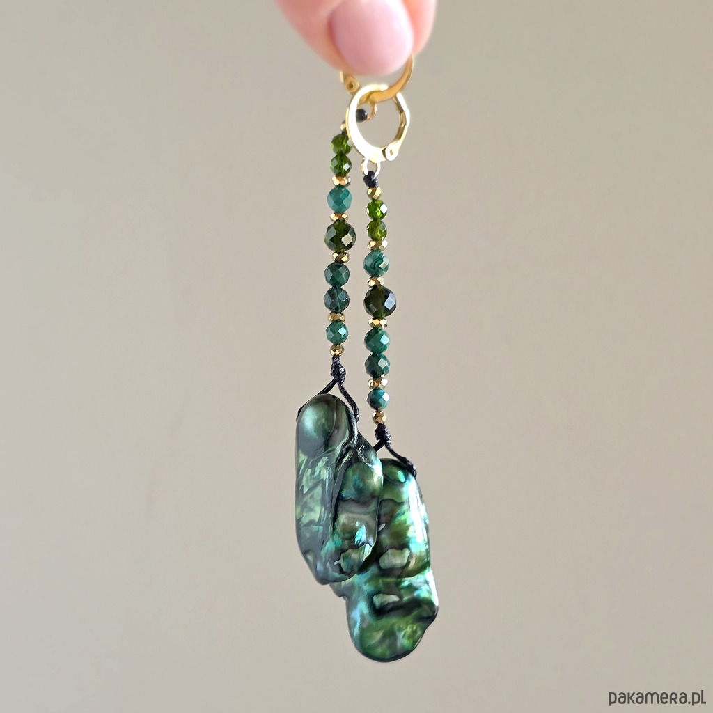 Kolczyki zostały ręcznie wykonane z wysokiej jakości elementów ze stali chirurgicznej, macicy perłowej oraz kamieni naturalnych: malachitu i diopsydu chromowego. Całość dopełniają złote przekładki z hematytu, które dodają biżuterii elegancji i energetycznej równowagi.