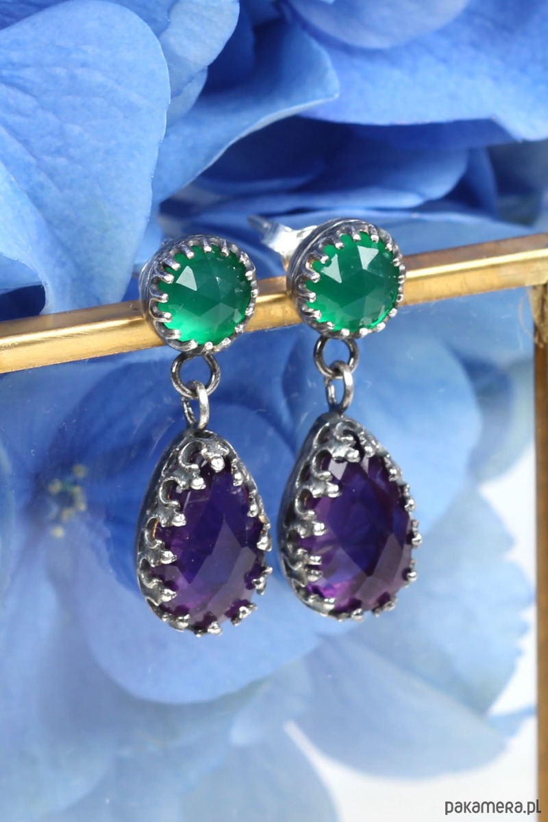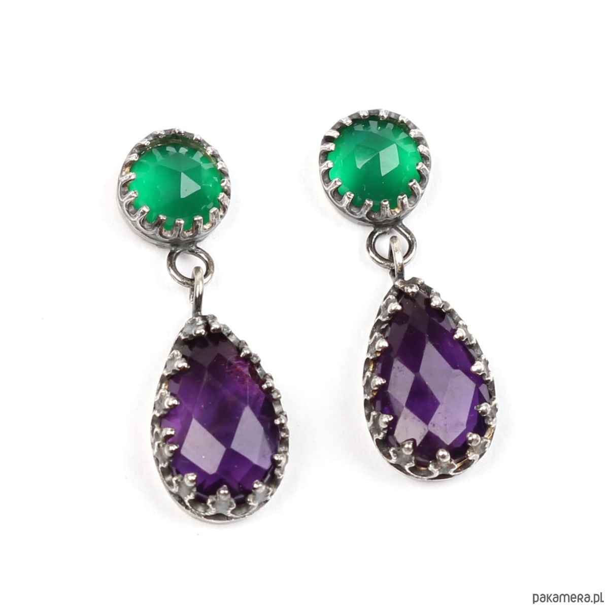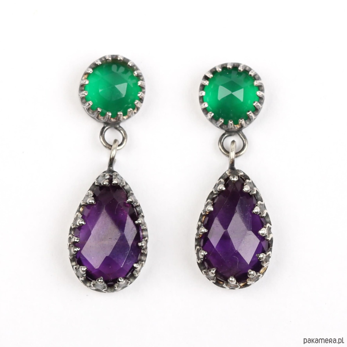Ręcznie wykonane kolczyki ze srebra pokrytego oksydą z ametystem i zielonym agatem