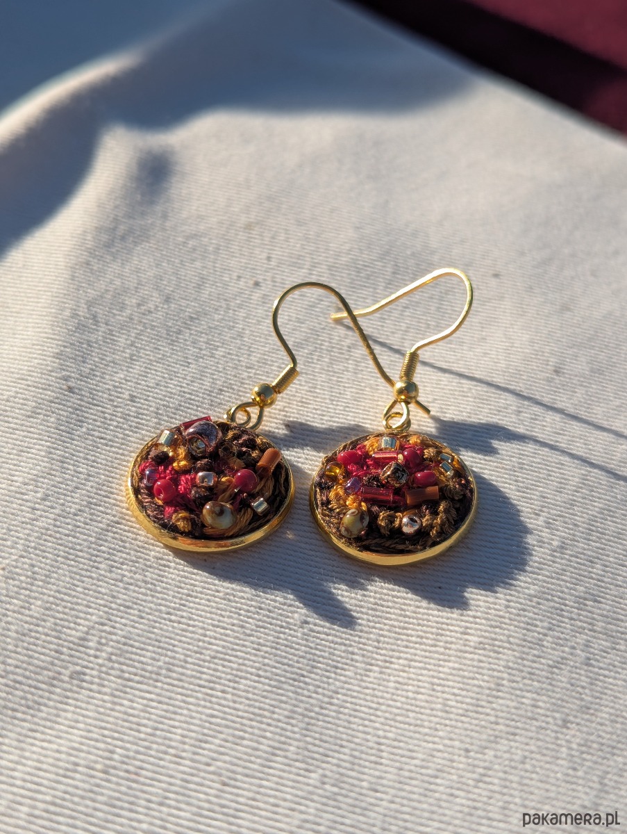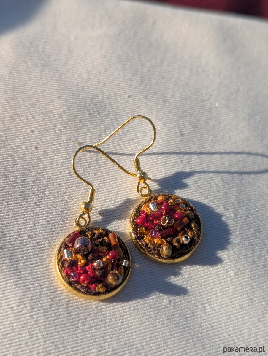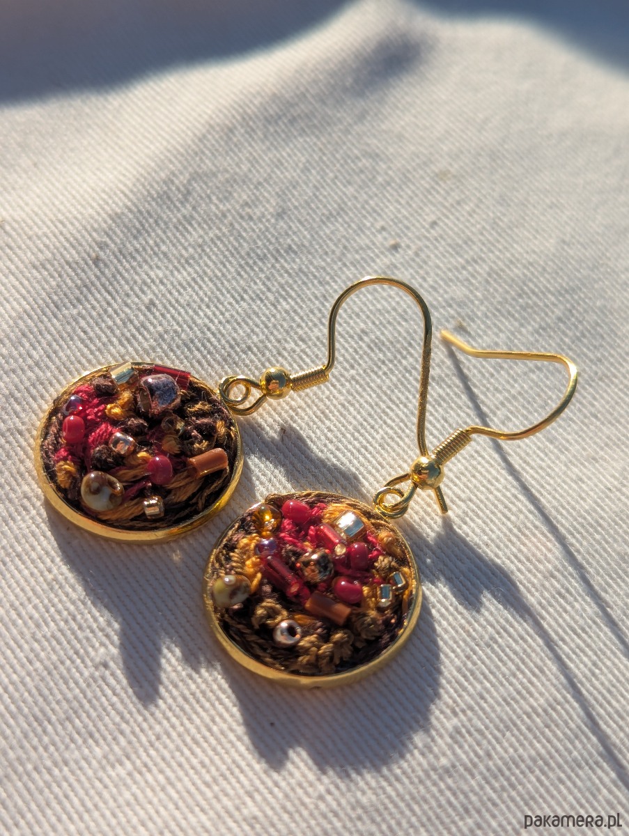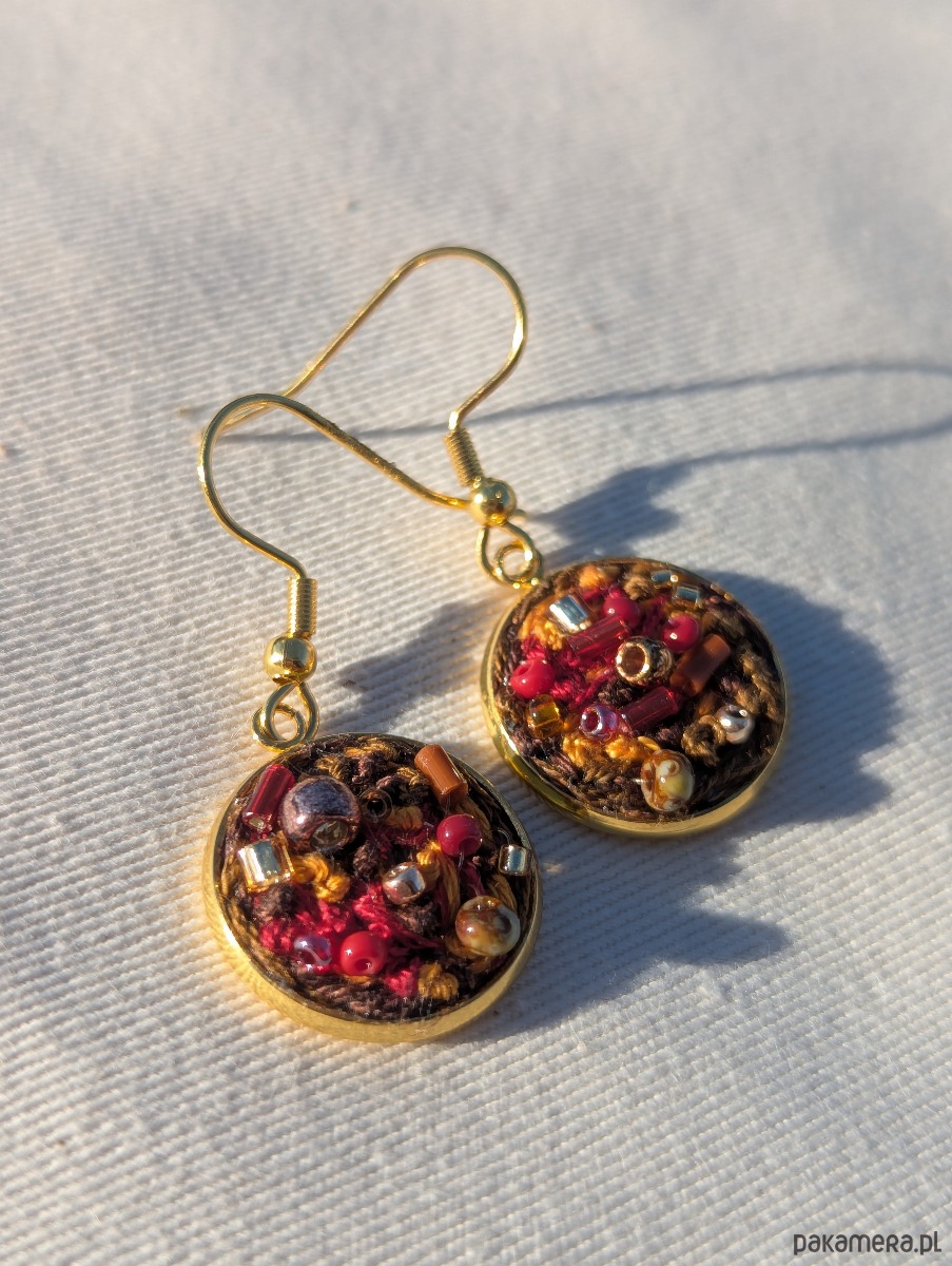 Te wyjątkowe ręcznie haftowane kolczyki powstały z miłości do jesiennych barw - ciepłych brązów, głębokich czerwieni, delikatnych żółci i subtelnych pomarańczy. Osadzone na bazie w kolorze złota, dodają stylizacji elegancji, jednocześnie zachowując lekkość i naturalny charakter.
