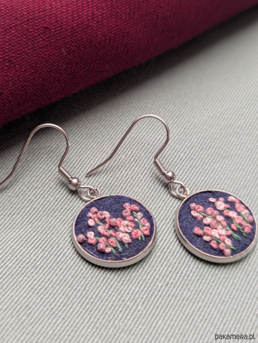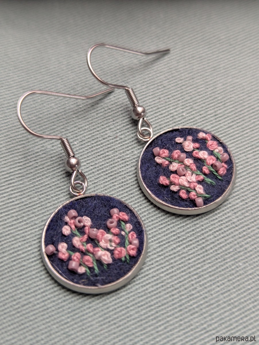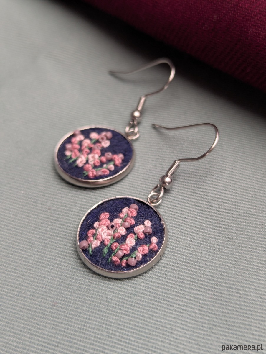 Te urokliwe kolczyki ozdobiłam haftem wykonanym na granatowym filcu. Na ich powierzchni rozkwitają drobne różowe kwiaty - część z nich została wyszyta nitką, a część uformowana z maleńkich szklanych koralików, które dodają całości subtelnego blasku i delikatnej przestrzenności.