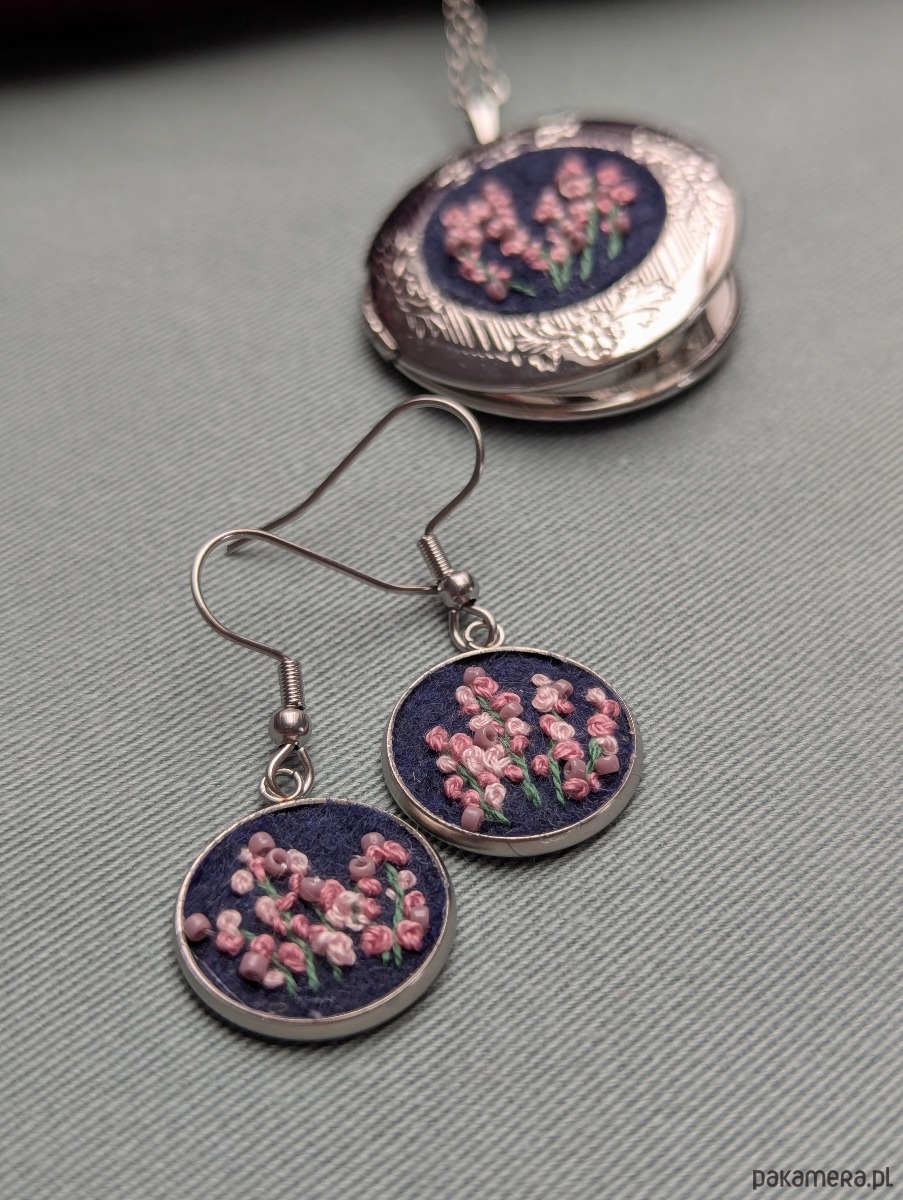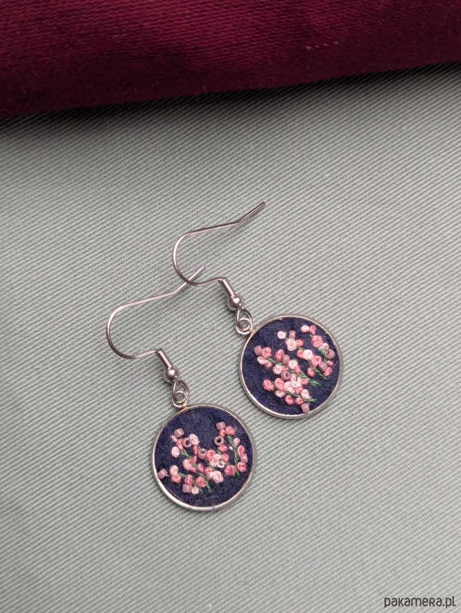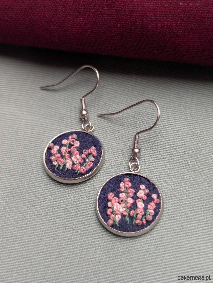 Te urokliwe kolczyki ozdobiłam haftem wykonanym na granatowym filcu. Na ich powierzchni rozkwitają drobne różowe kwiaty - część z nich została wyszyta nitką, a część uformowana z maleńkich szklanych koralików, które dodają całości subtelnego blasku i delikatnej przestrzenności.