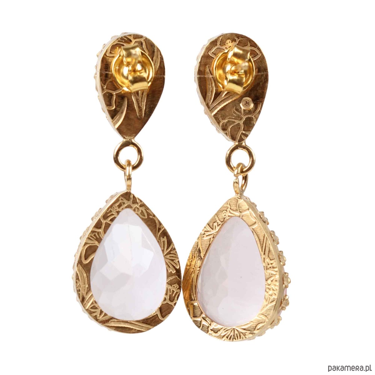 Ręcznie wykonane kolczyki ze srebra pokrytego 24-karatowym złotem z kwarcem różowym i kamieniem księżycowym. Od spodu wykończone kwiecistym wzorem.