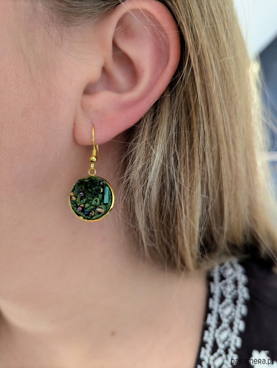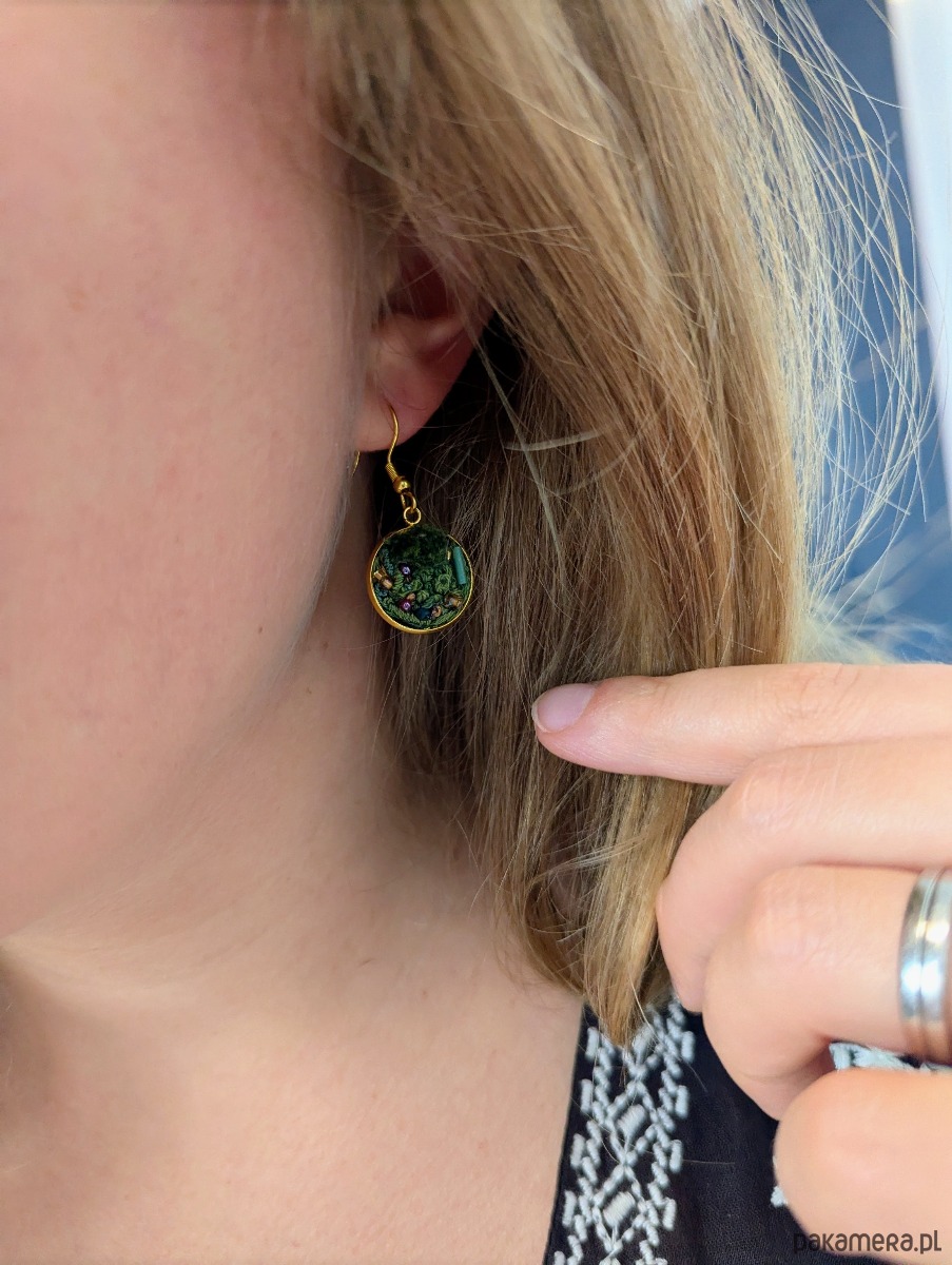Te wiszące kolczyki to małe leśne światy zamknięte w złotej bazie.