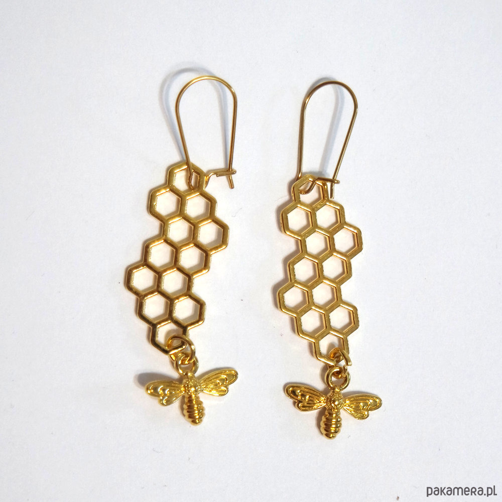 Kolczyki wiszące, złote - Plaster miodu, pszczoła
