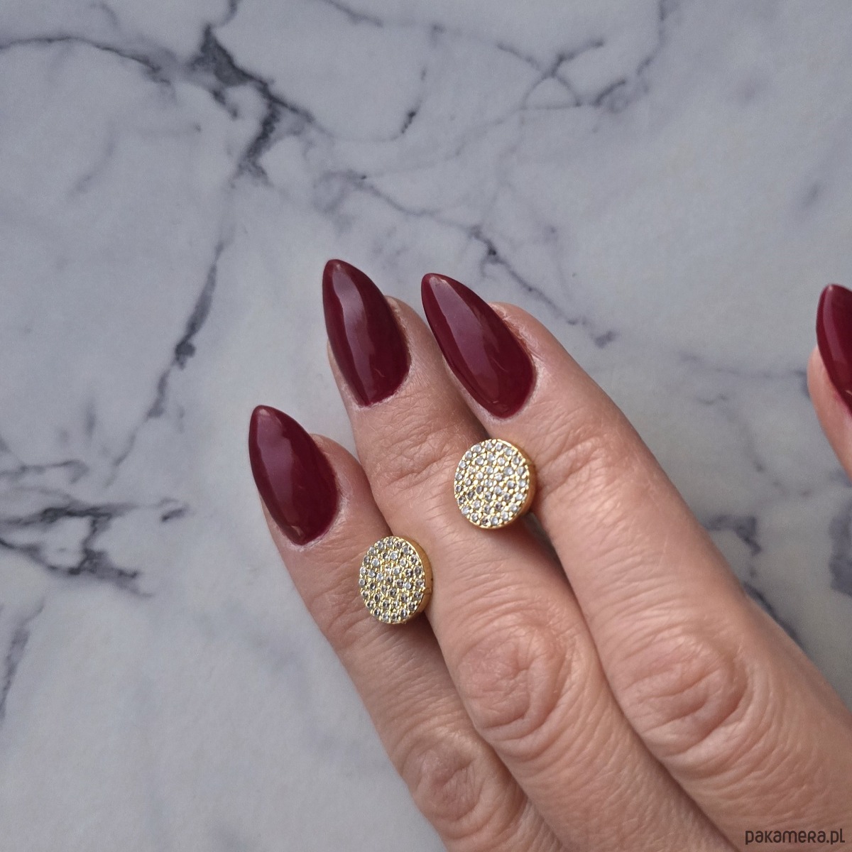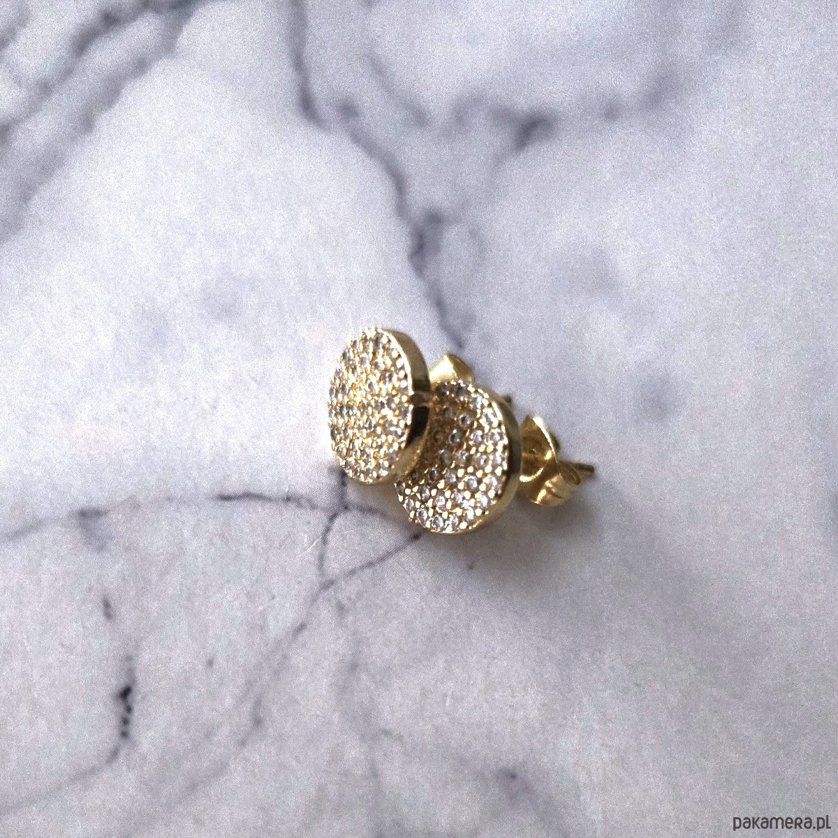 Kolczyki wkrętki w postaci kółeczek wysadzanych maleńkimi cyrkoniami, zapinane na baranki. Wykonane z mosiądzu pozłacanego w połączeniu z elementami stali szlachetnej. Kolczyki prezentują się delikatnie i klasą. Idealne do noszenia na co dzień, jak i do wieczorowych stylizacji.