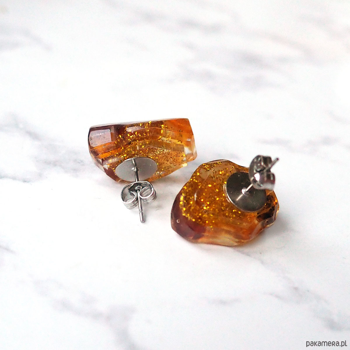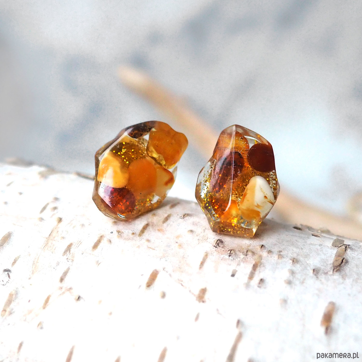 Minimalistyczne kolczyki - małe nieregularne bryłki z bursztynami, złotymi płatkami i mini kuleczkami, zatopionymi w żywicy.