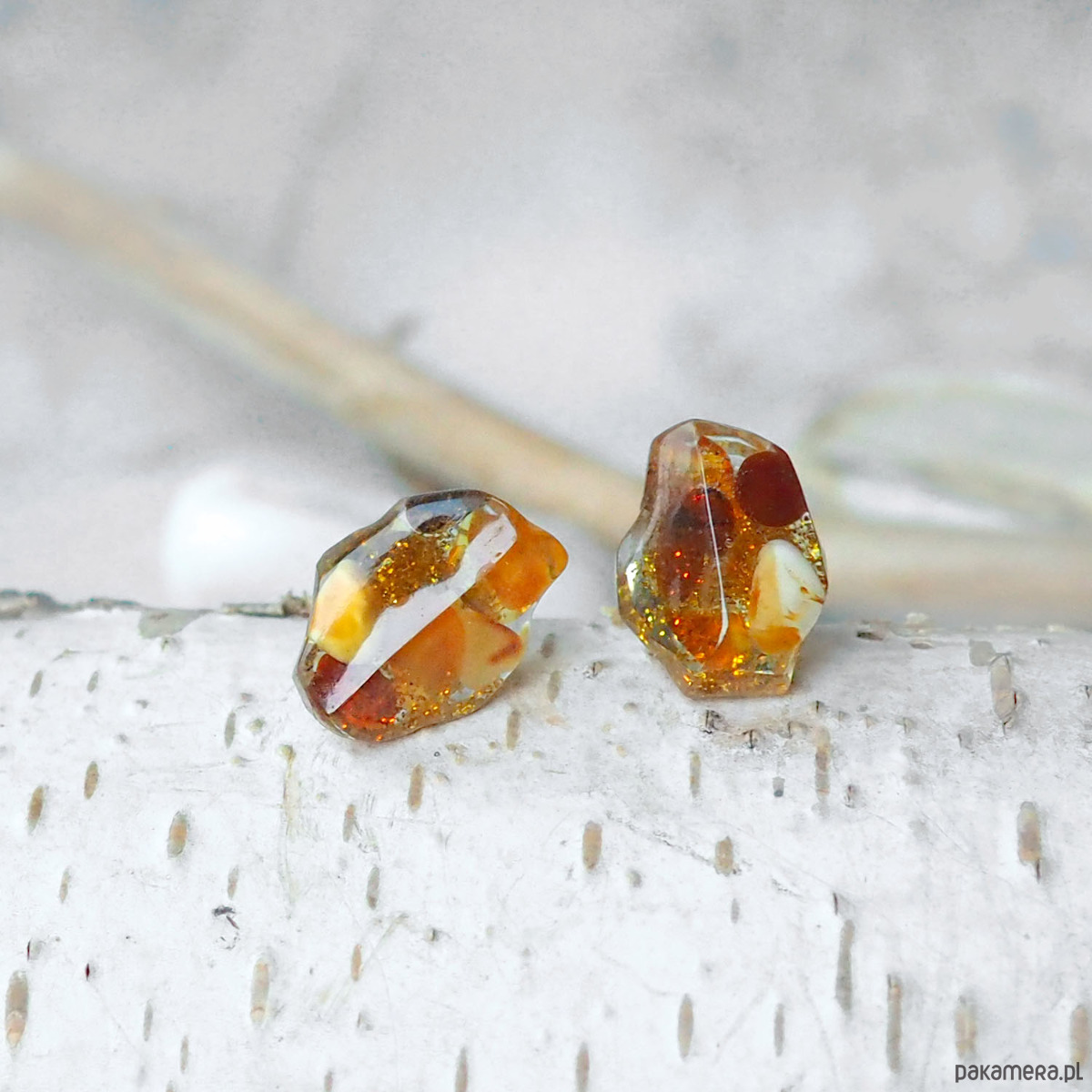 KOLCZYKI WKRĘTKI z bursztynem w żywicy unikatowe