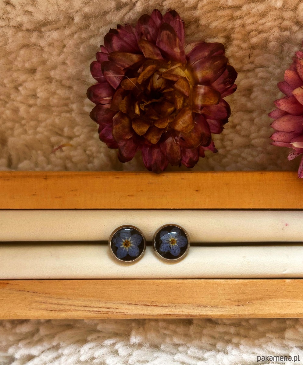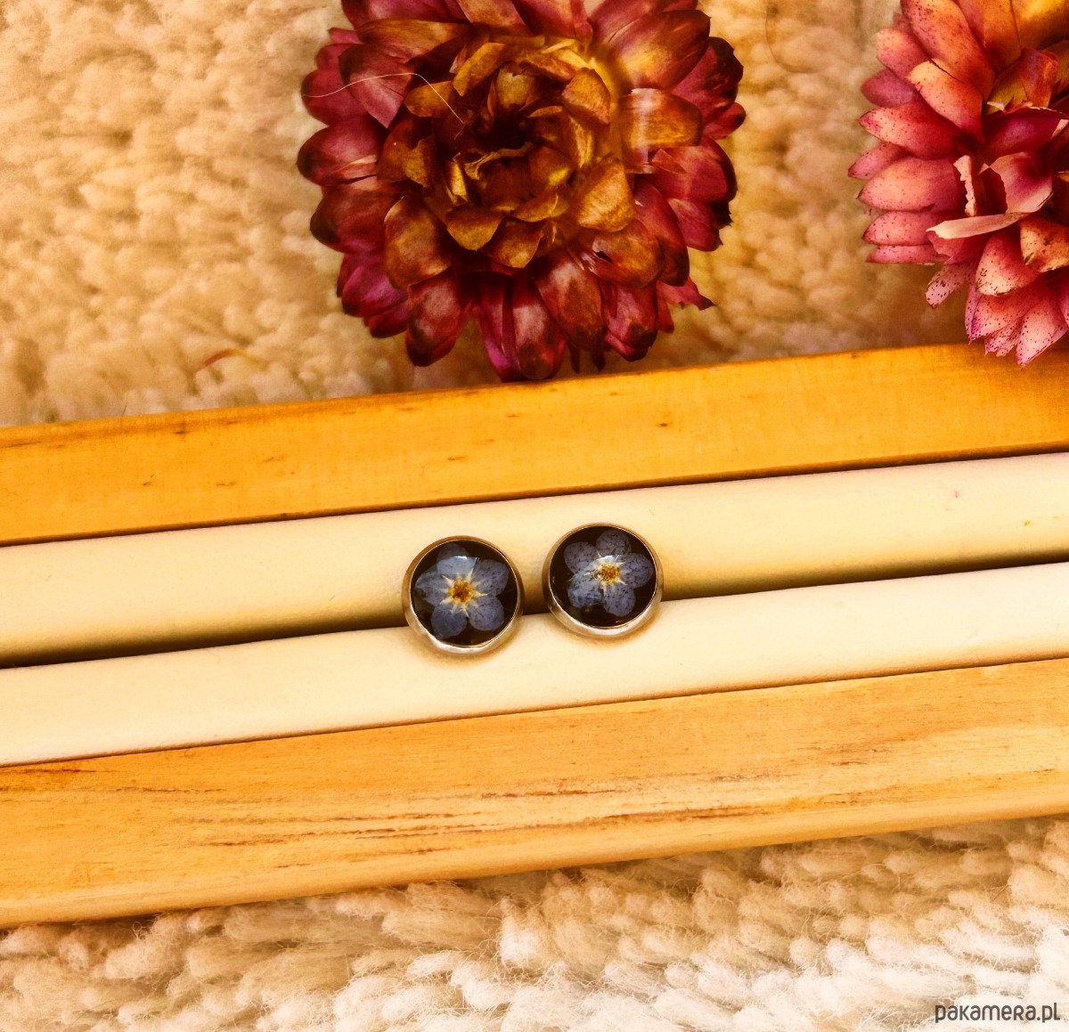Kolczyki z prawdziwymi niezapominajkami zatopionymi w żywicy. Średnica wkrętek 0,8cm