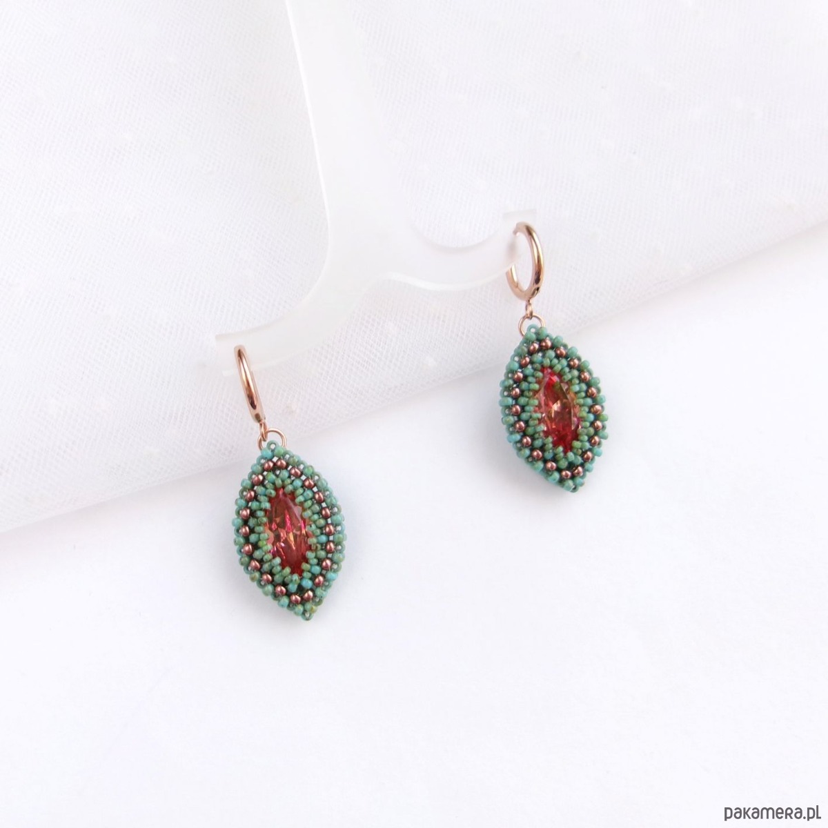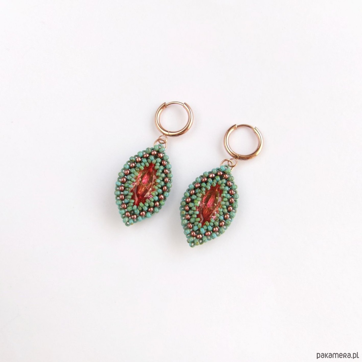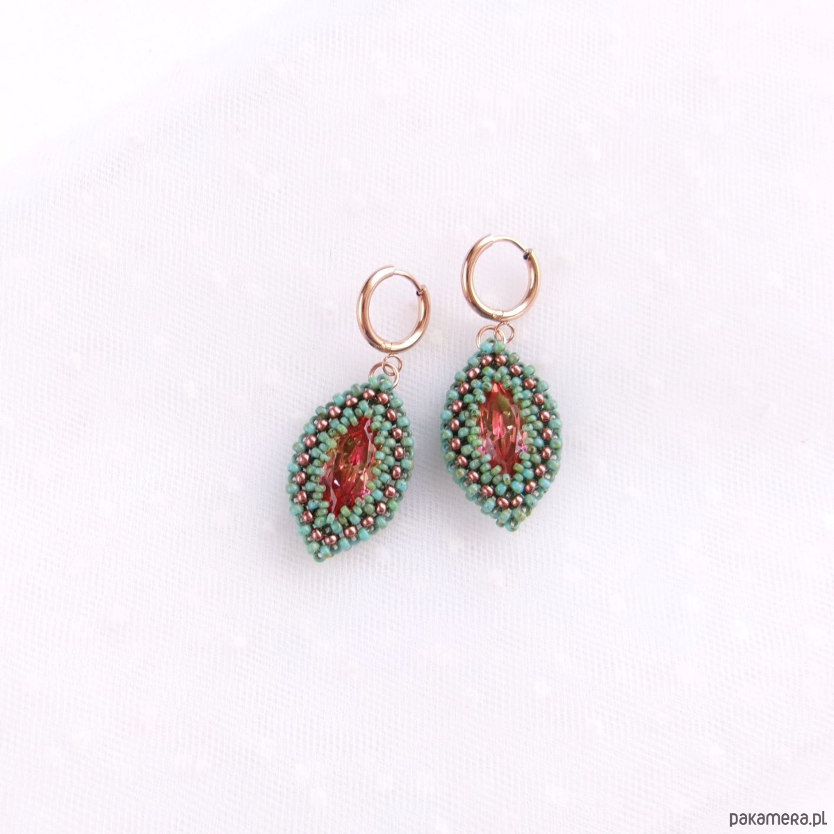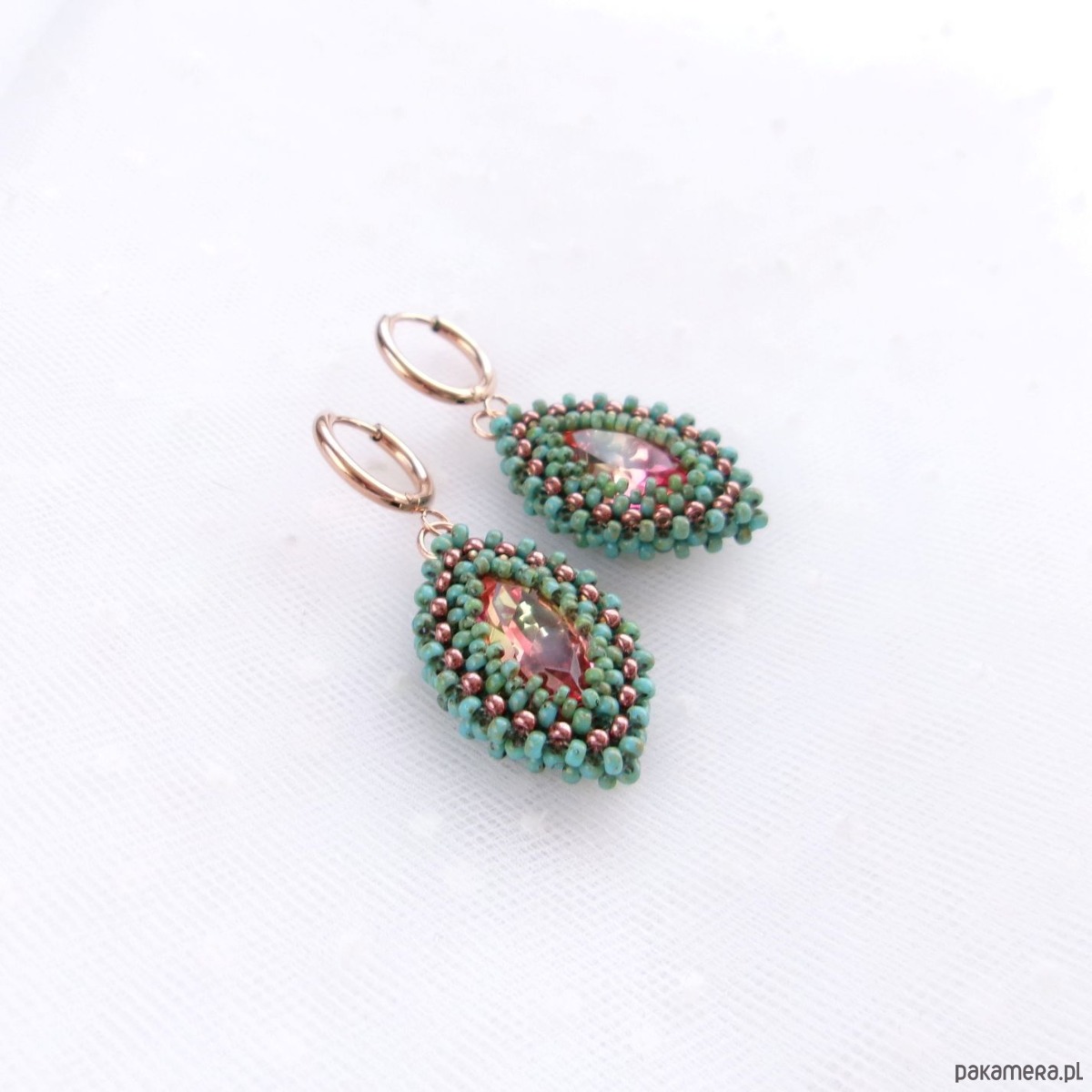 Ręcznie wyplecione kolczyki w kształcie wrzeciona w kolorze turkusowym z odrobiną brązu, z oryginalnymi kryształkami w kolorze malinowo-cytrynowym. Kolczyki zawieszone na biglach ze stali chirurgicznej w kolorze różowego złota.