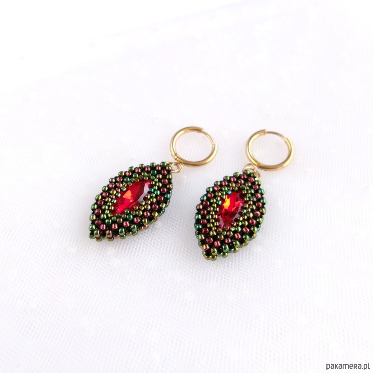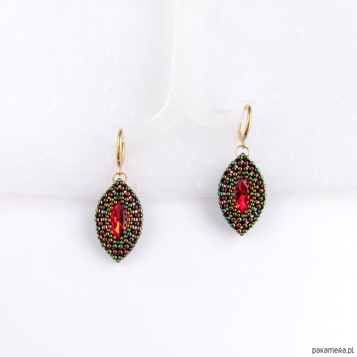 Ręcznie wyplecione kolczyki w kształcie wrzeciona w odcieniach zieleni i brązu, z ogniście czerwonymi kryształkami. Kolczyki zawieszone na biglach ze stali chirurgicznej w kolorze złota.