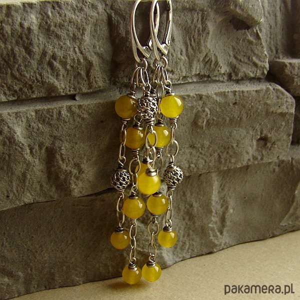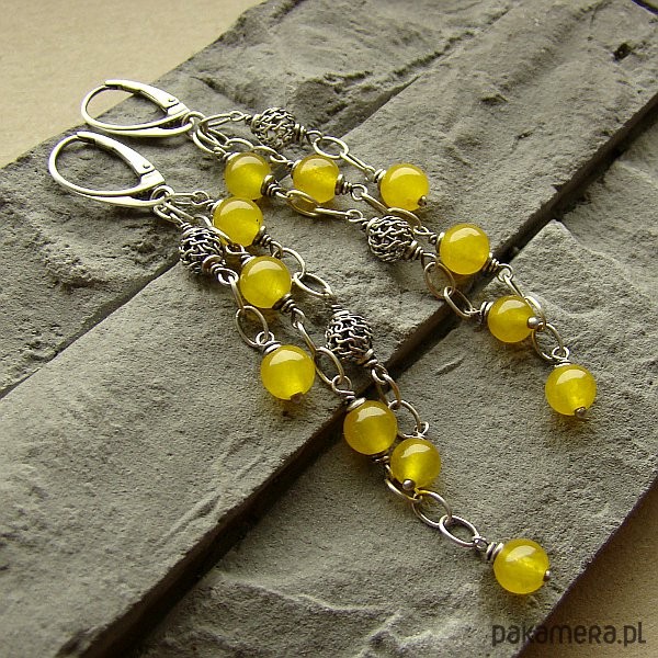 Efektowne, długie i oryginalne kolczyki na co dzień i nie tylko. Wykonane w całości z oksydowanego srebra próby 925 oraz kulek żółtego jadeitu wielkości 6 mm. W mojej galerii bransoletka do kompletu. Na życzenie mogę wykoać podobe kolczyki z inymi kaminiami:) Całkowita długość kolczyków to ok. 9 cm. Ozdobnie zapakowane.