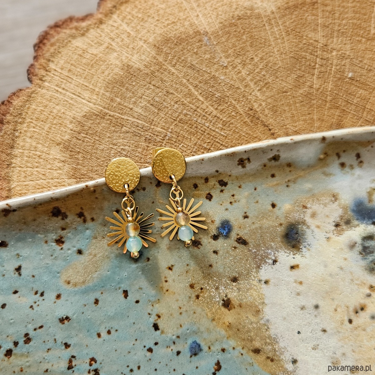 Kolczyki, w których gra świateł wydobywa z minerałów to co najpiękniejsze! Wyjątkowo wybarwione agaty łączą w sobie błękit i bursztynowe akcenty, co w połączeniu z zawieszką w kolorze złotym przypomina barwy zjawiskowego zachodu słońca. Całość osadzona została na delikatnych biglach o ciekawej fakturze.