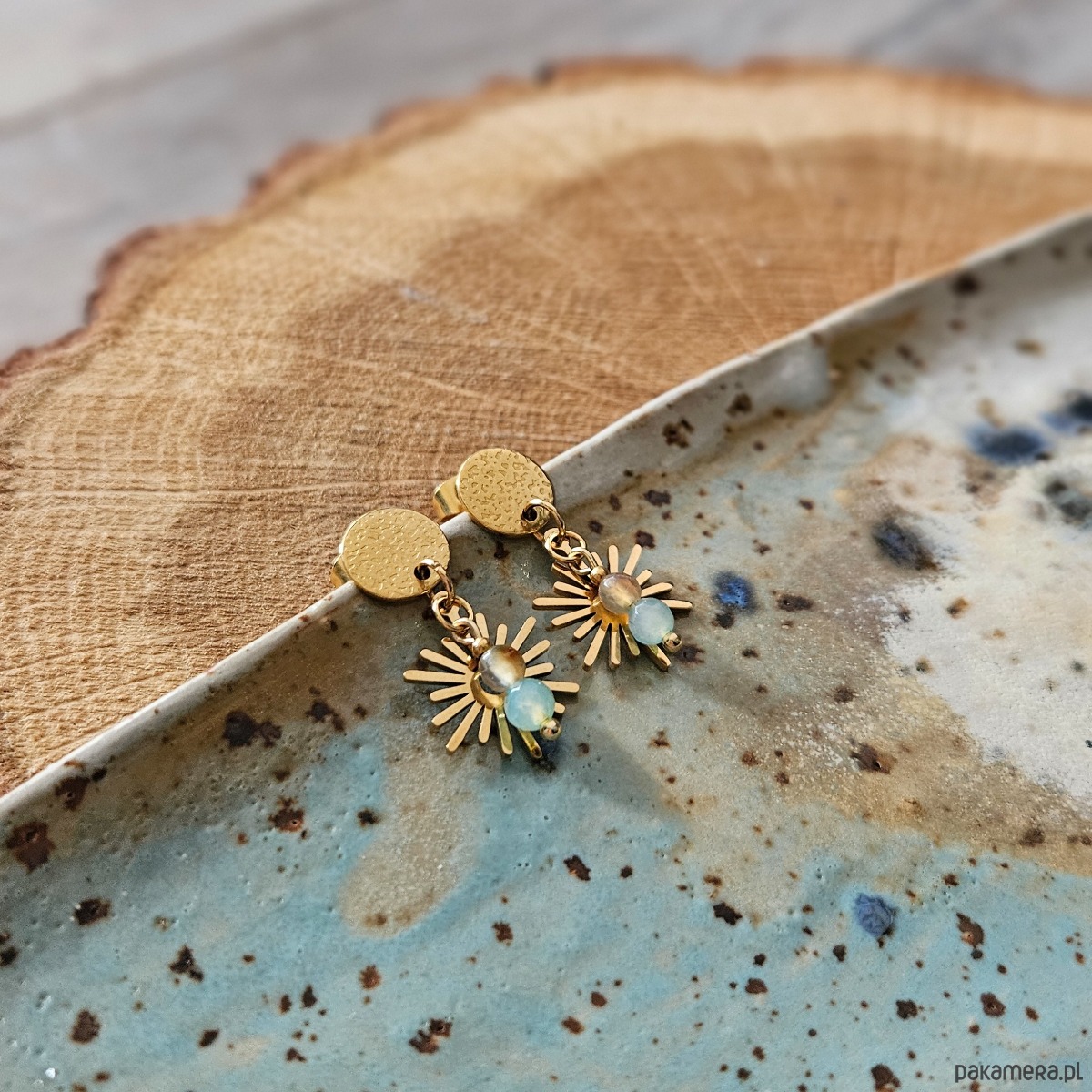 Kolczyki, w których gra świateł wydobywa z minerałów to co najpiękniejsze! Wyjątkowo wybarwione agaty łączą w sobie błękit i bursztynowe akcenty, co w połączeniu z zawieszką w kolorze złotym przypomina barwy zjawiskowego zachodu słońca. Całość osadzona została na delikatnych biglach o ciekawej fakturze.