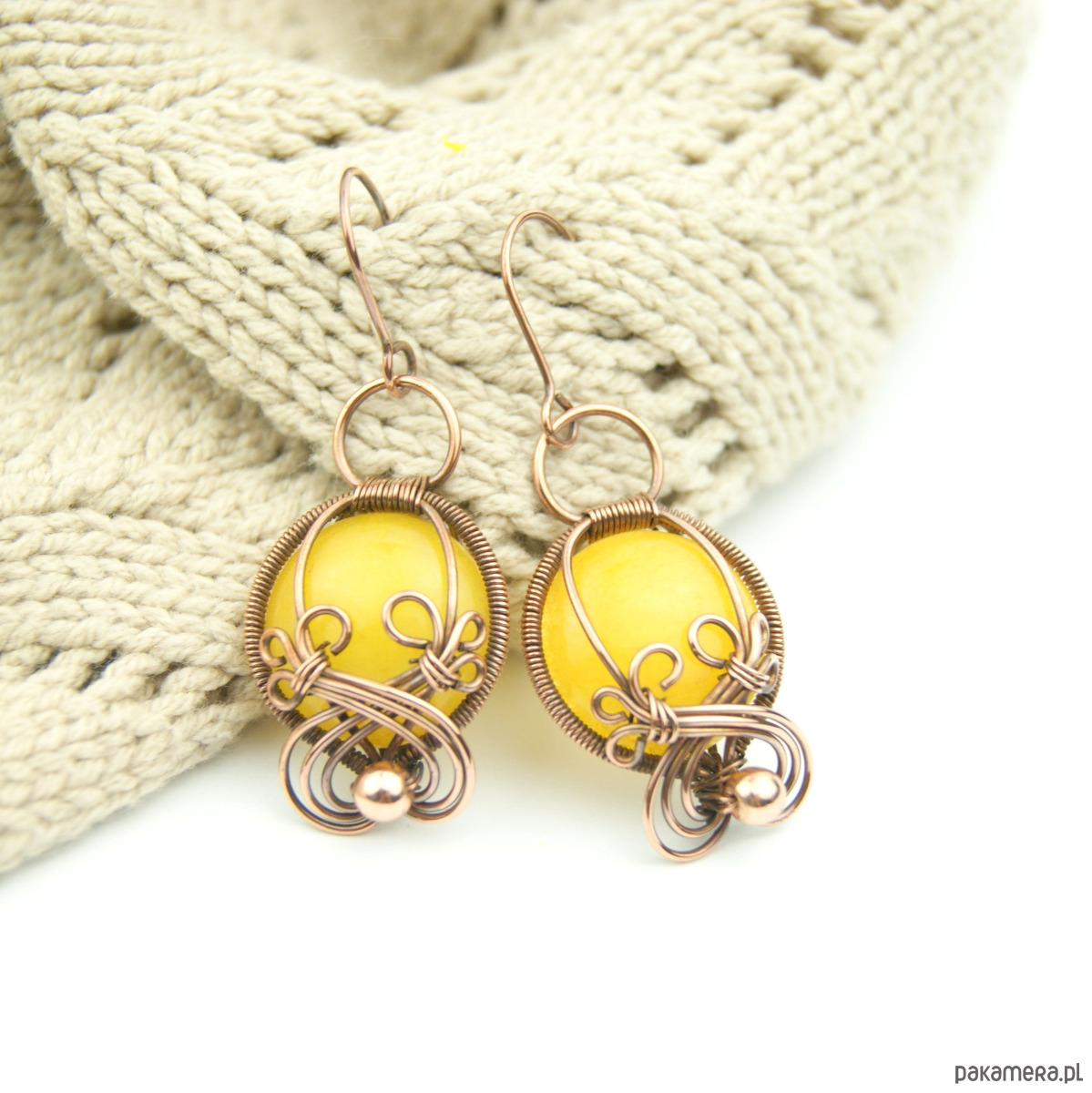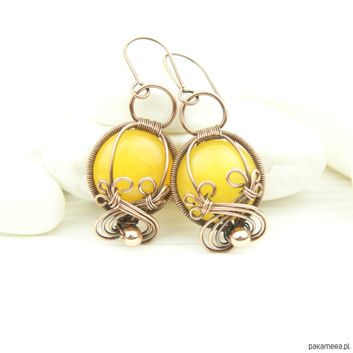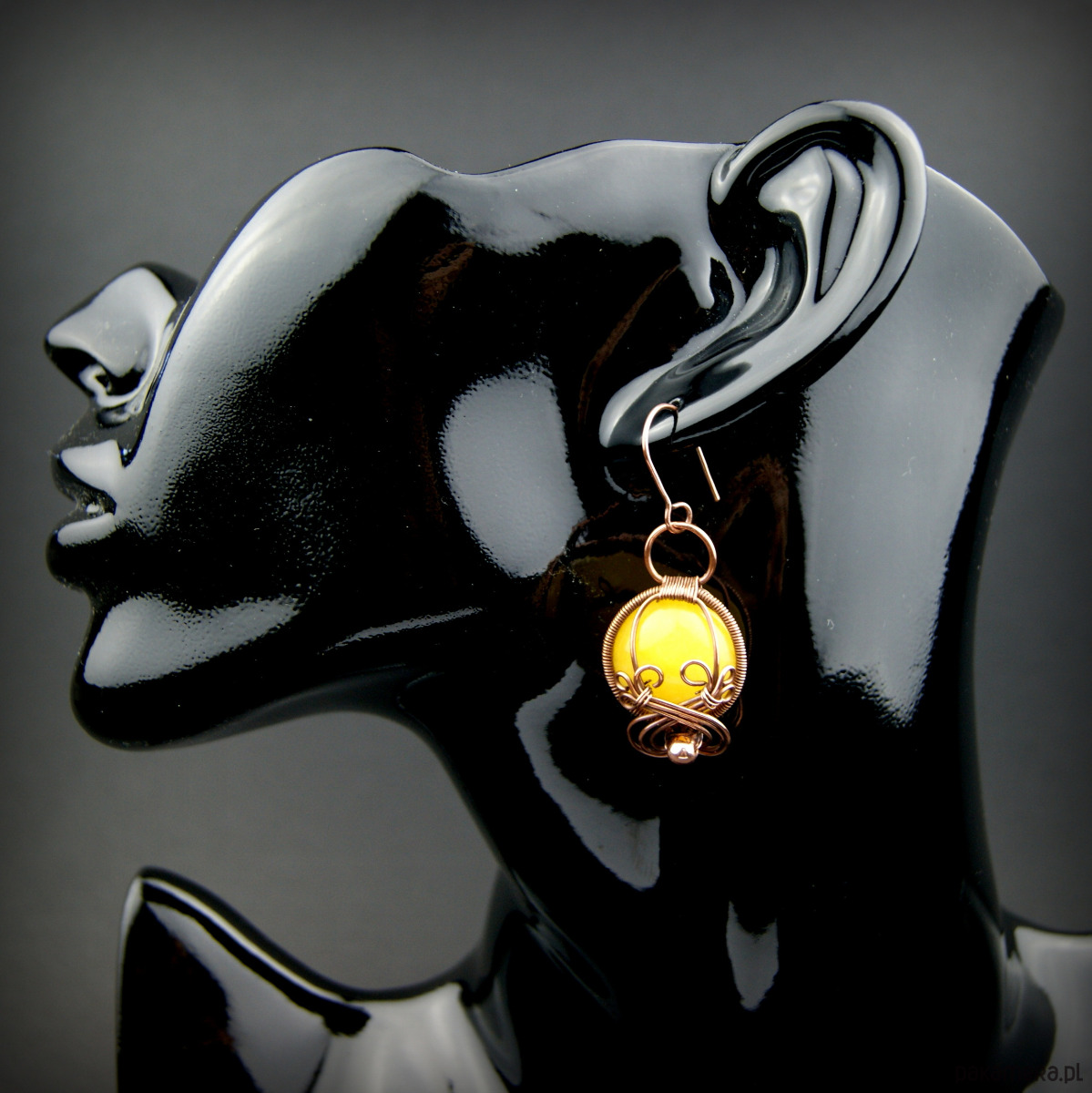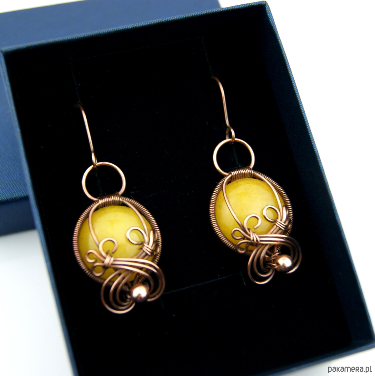 Kolczyki powstały z kamieni agatu, złotych hematytów oraz miedzi. Bigle miedziane.