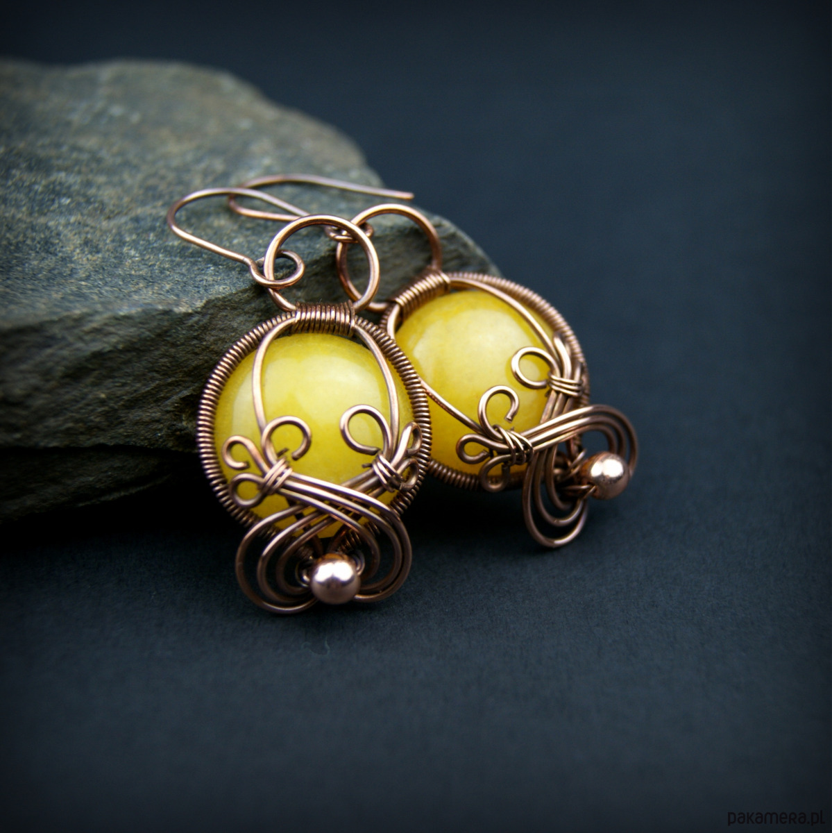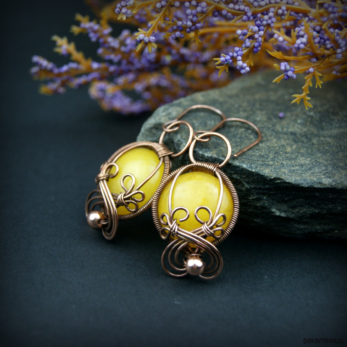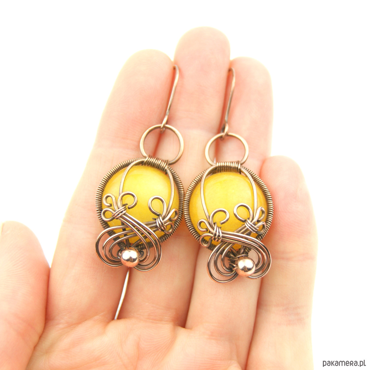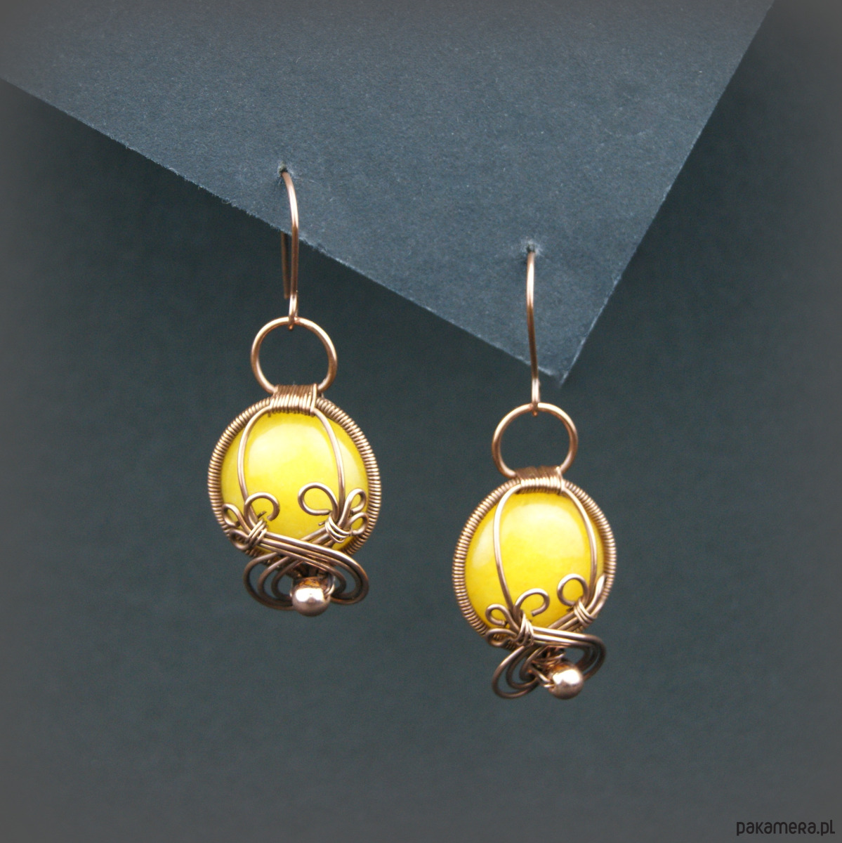 Kolczyki powstały z kamieni agatu, złotych hematytów oraz miedzi. Bigle miedziane.