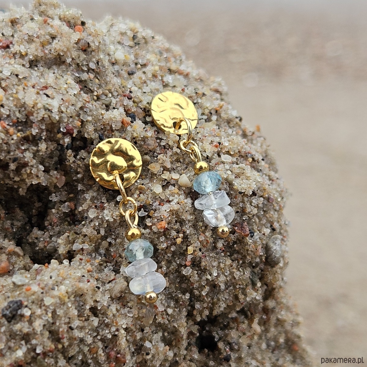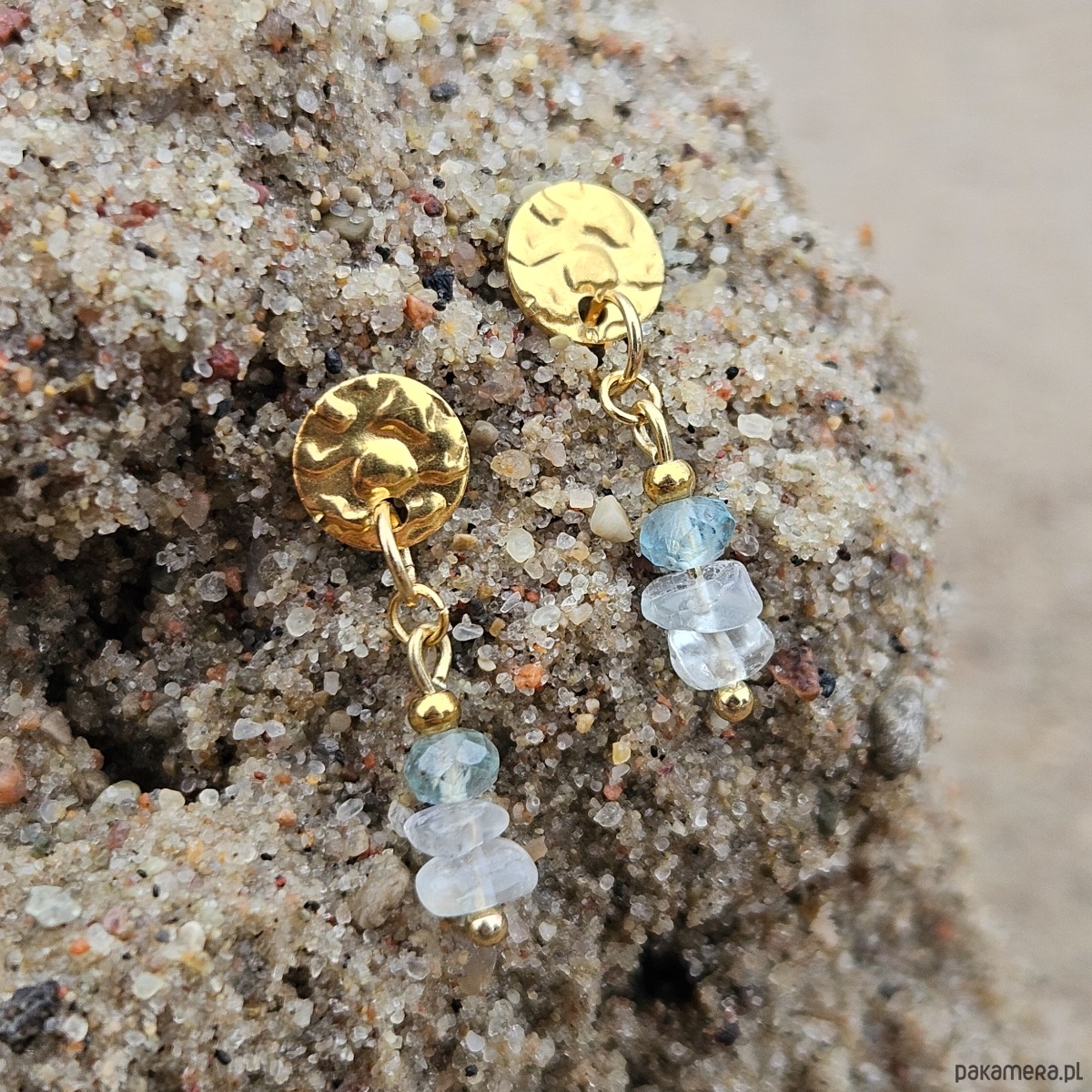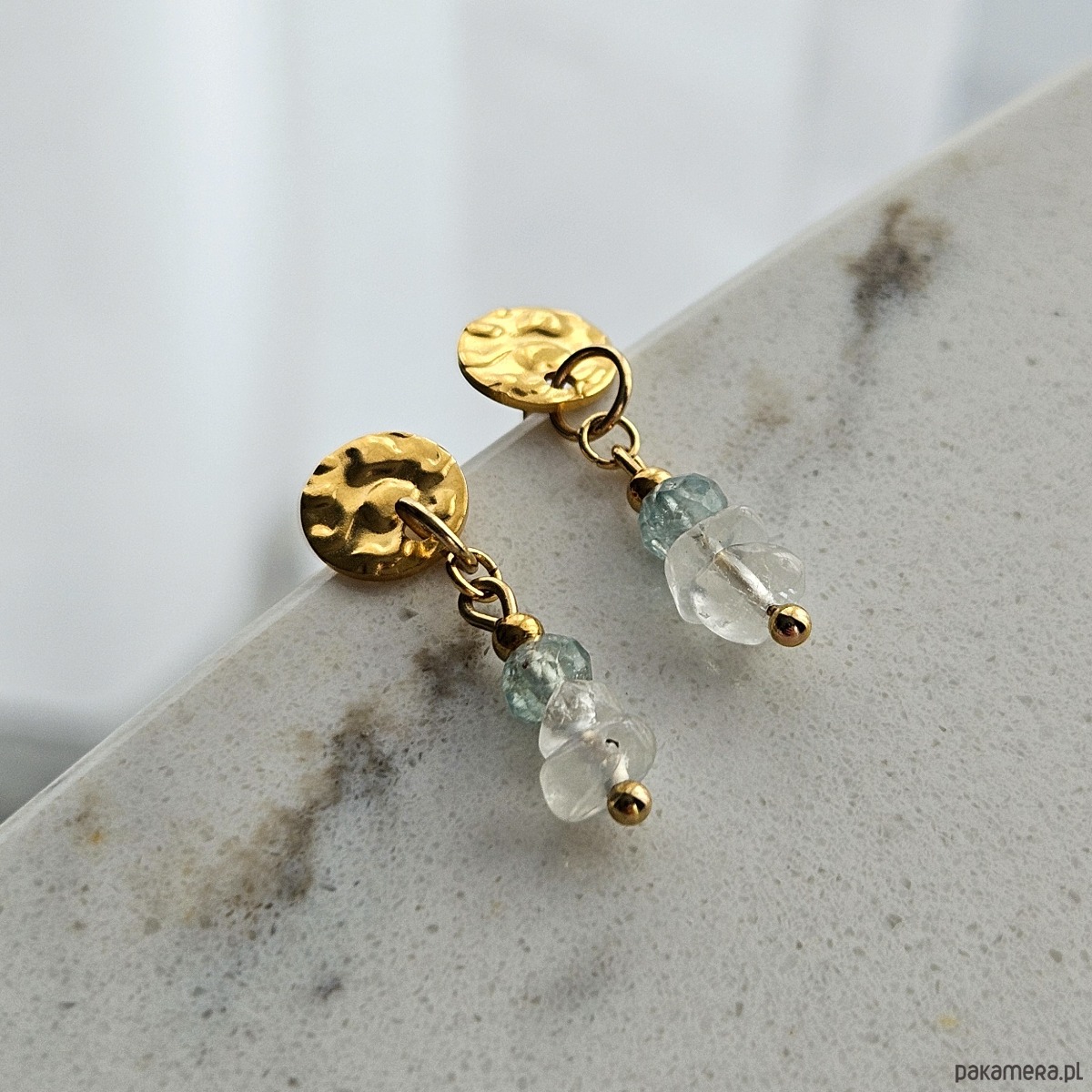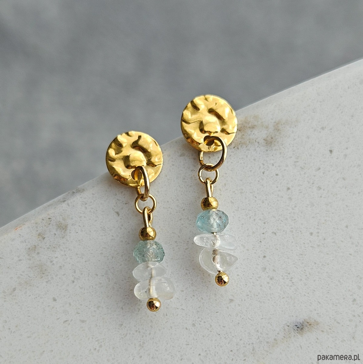 Inspirowane taflą wody kolczyki łączące modne wzornictwo z delikatnymi barwami kamieni naturalnych. Na biglach ze stali szlachetnej w formie gniecionej płytki zawieszone zostały szlifowany akwamaryn i kamień księżycowy w formie bryłek, zachwycający bliską naturze surowością kształtu. Kolczyki będą pięknie odbijać światło, podkreślając letnią opaleniznę.
