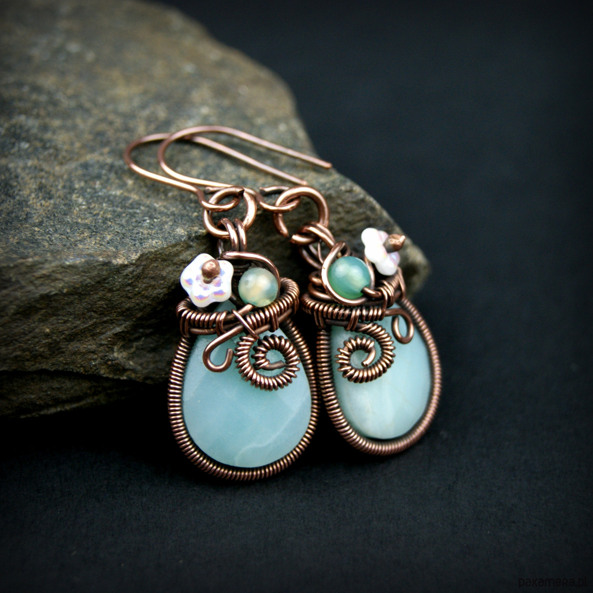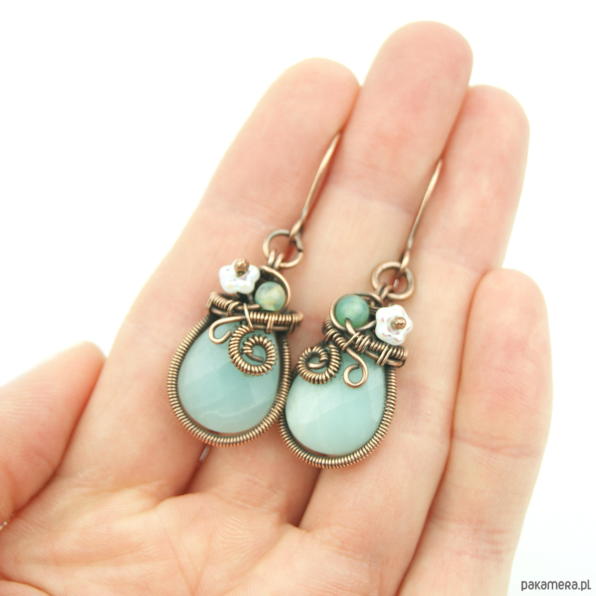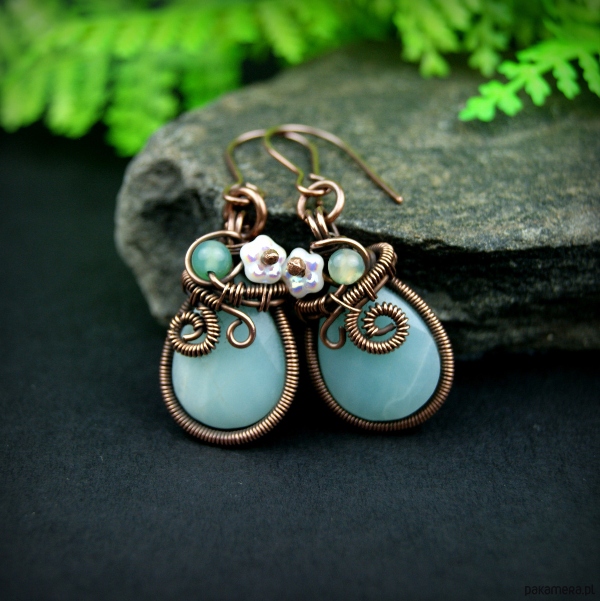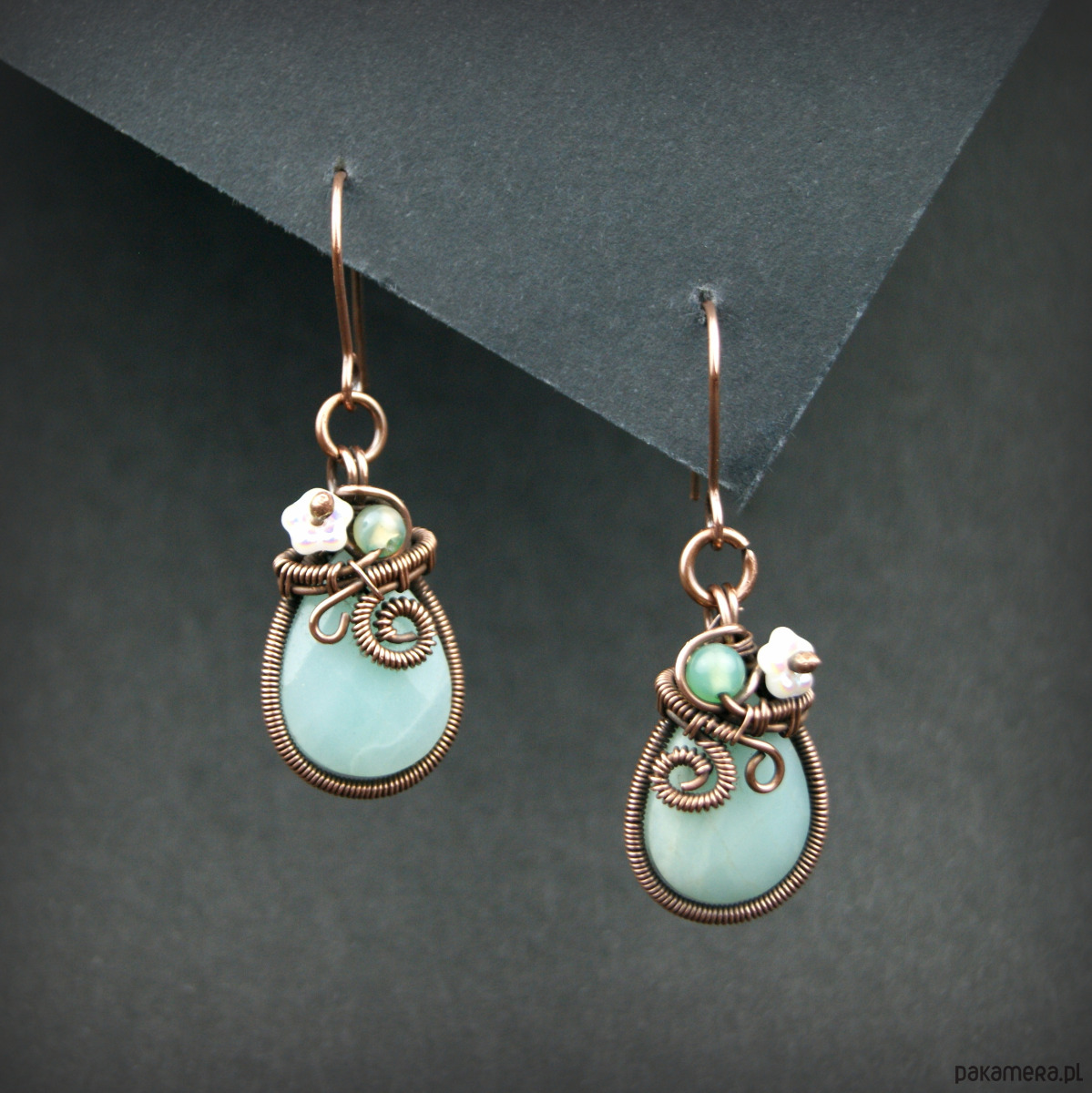 Wiszące kolczyki wykonane z miedzi oraz kamieni naturalnych. Do stworzenia kolczyków użyto kamieni amazonit o kształcie fasetowanej łezki, niewielkich kamieni agatu, szklanych kwiatków oraz drutu miedzianego, całość oksydowano.