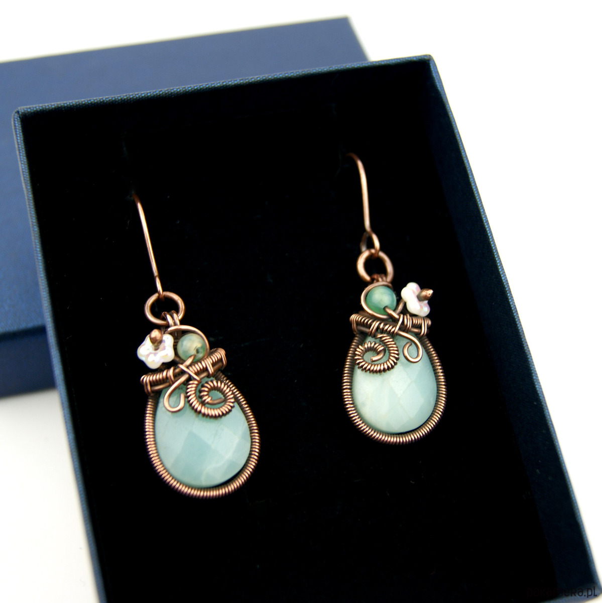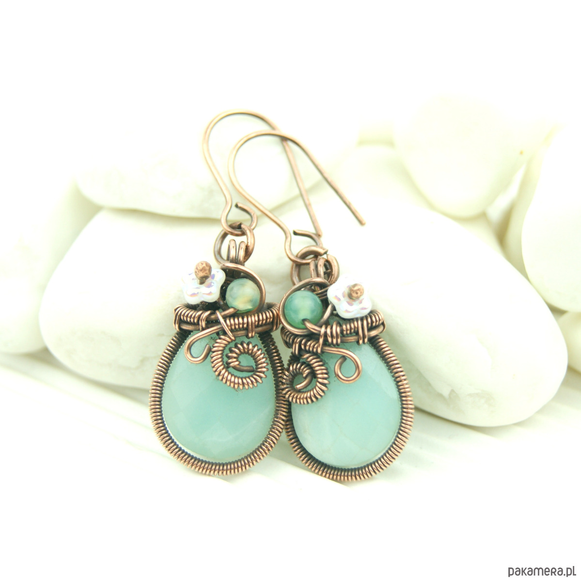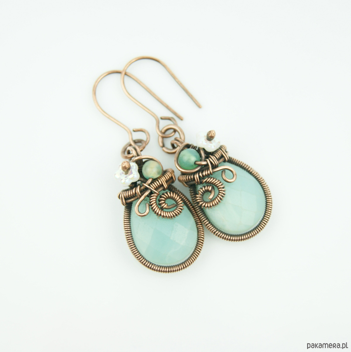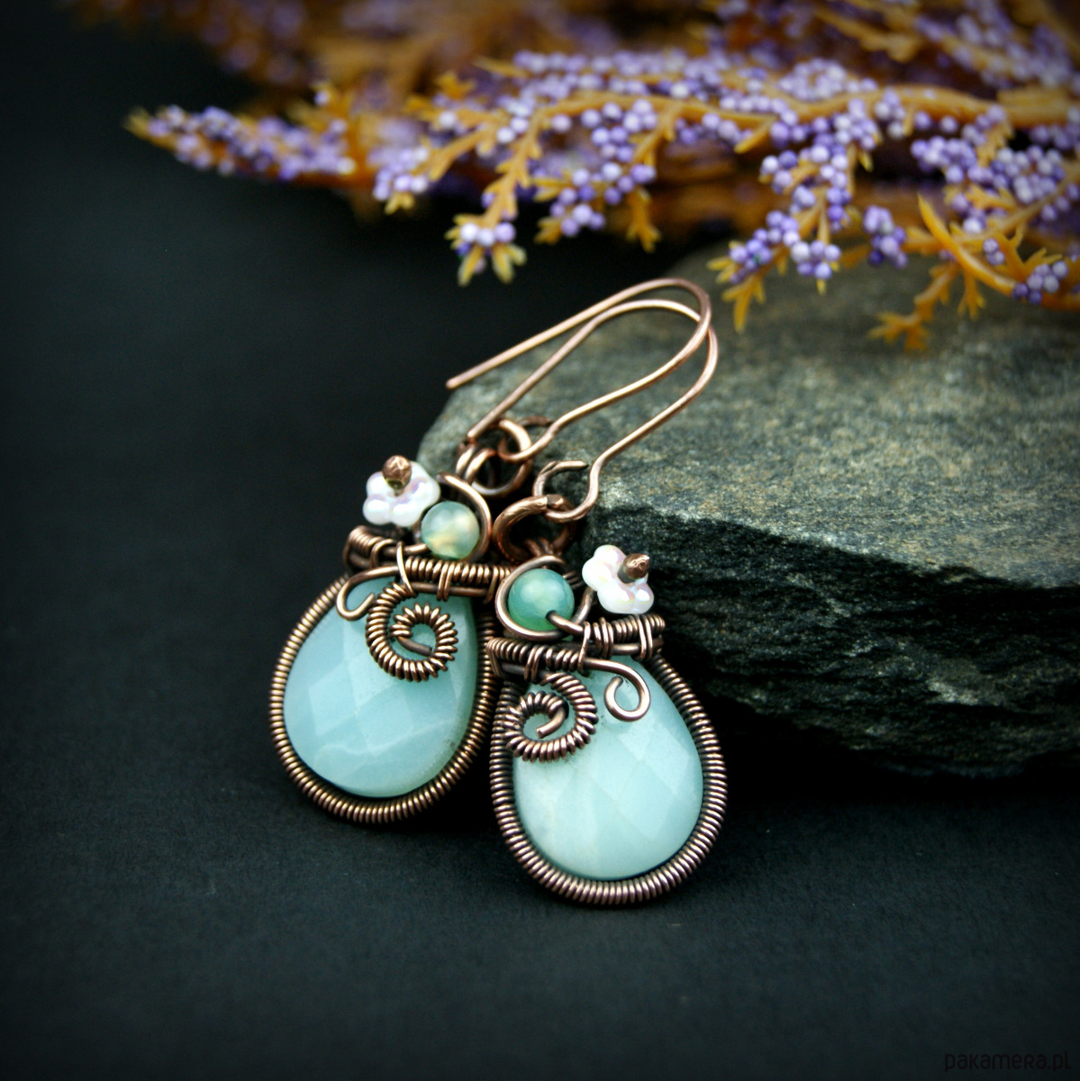 Wiszące kolczyki wykonane z miedzi oraz kamieni naturalnych. Do stworzenia kolczyków użyto kamieni amazonit o kształcie fasetowanej łezki, niewielkich kamieni agatu, szklanych kwiatków oraz drutu miedzianego, całość oksydowano.