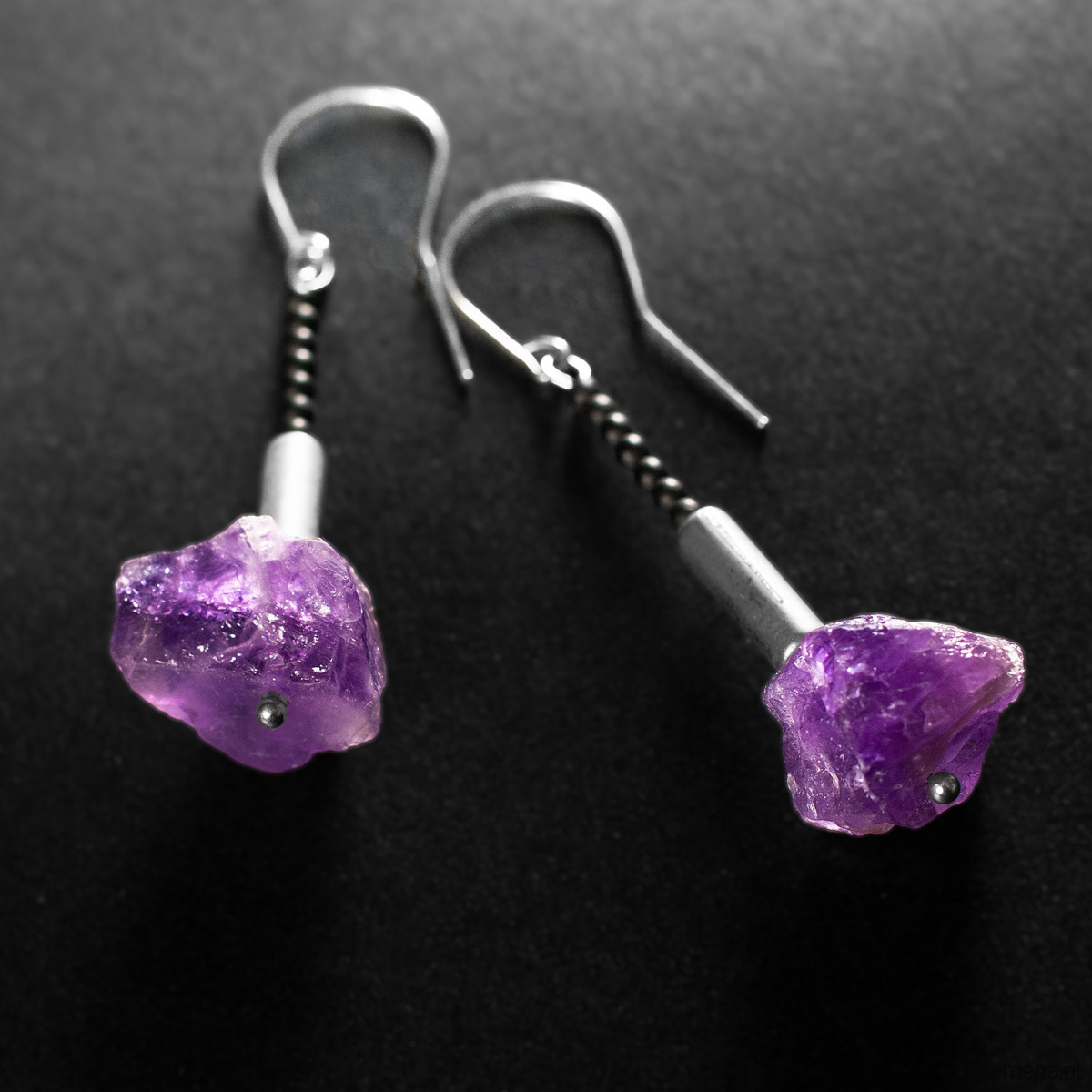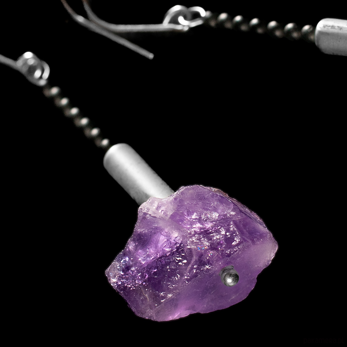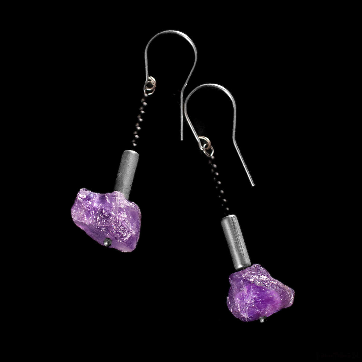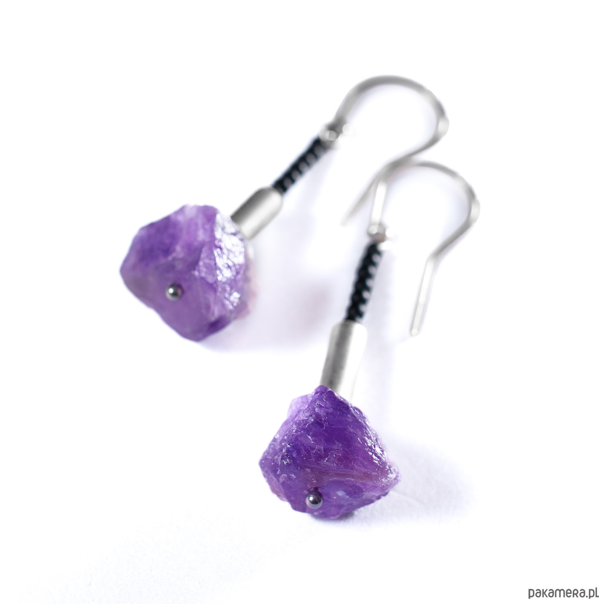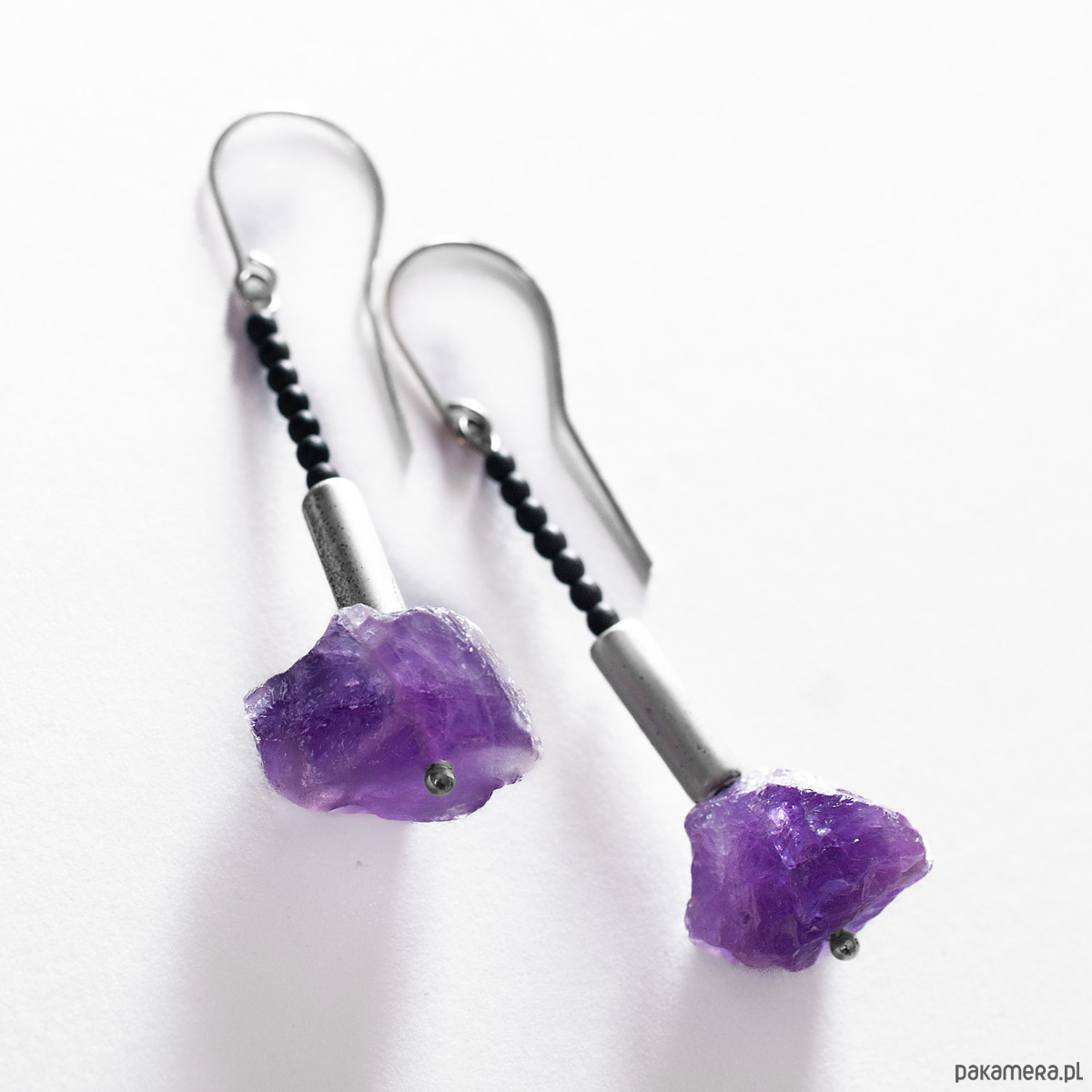 Kolczyki z kolekcji SZAMANKA z ametystem i hematytem. Przepiękne surowe bryłki ametystu zachwycają delikatną, fioletową barwą i naturalnym kształtem. Nad nimi satynowy wałeczek srebrnego hematytu i ciemne matowe kuleczki hematytu. Długość wraz z biglem 5,5 cm. Bigle - srebro 925. Kolczyki wykonane ręcznie według własnego projektu w pracowni Anillo. Biżuterię zapakujemy w elegancki kartonik.