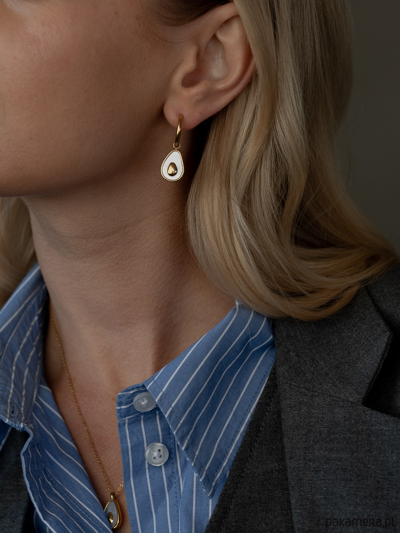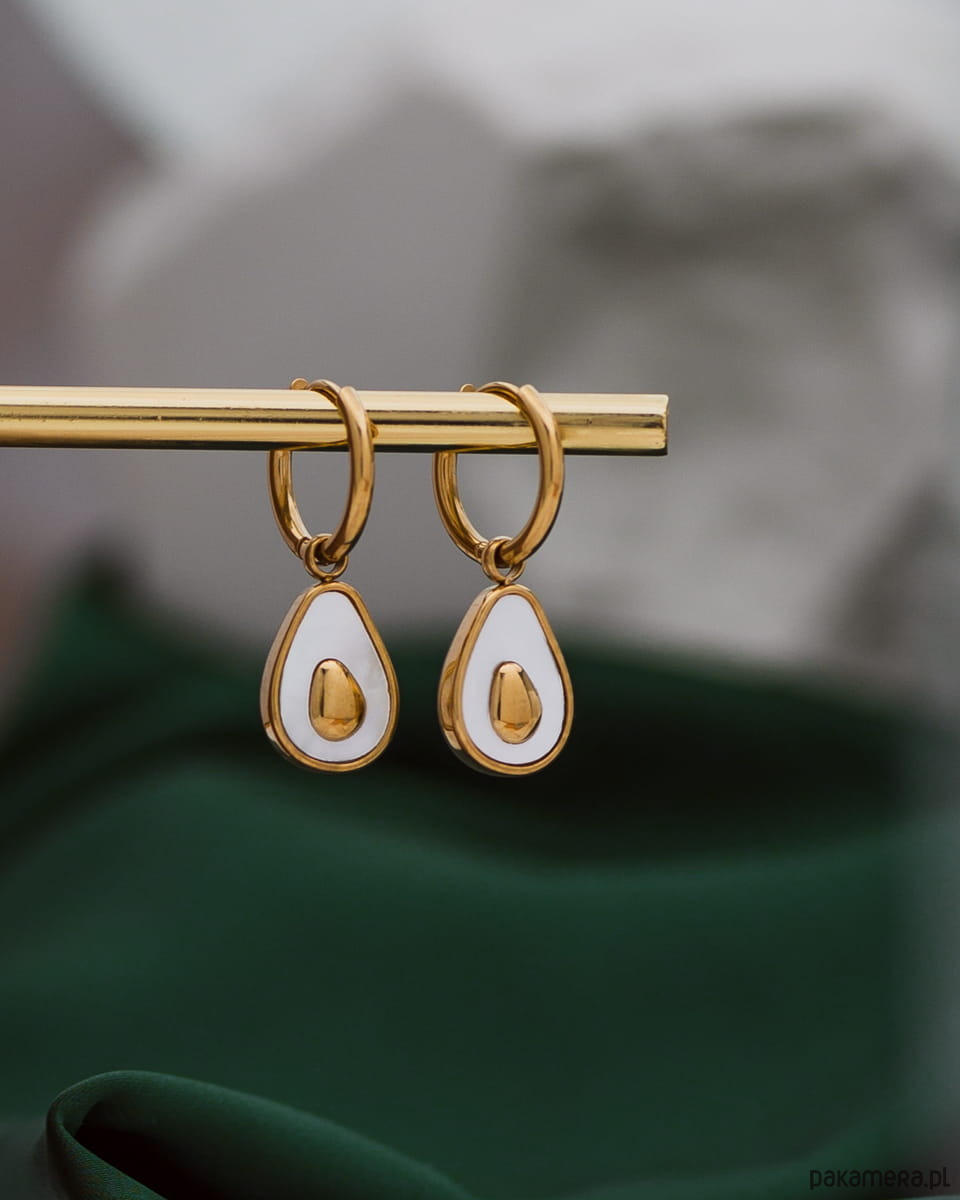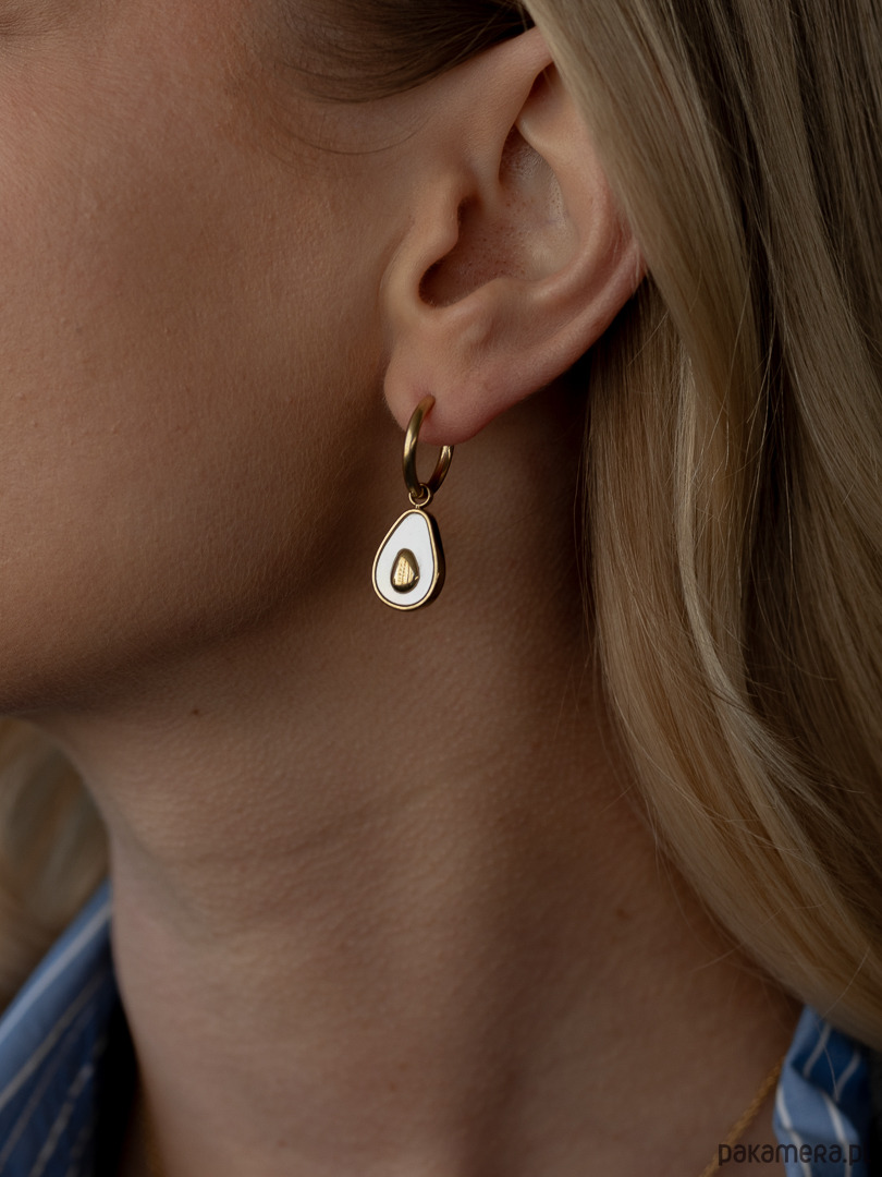 Kształt tych pięknych kolczyków przypominający awokado to hołd dla kreatywności i radości w modzie.