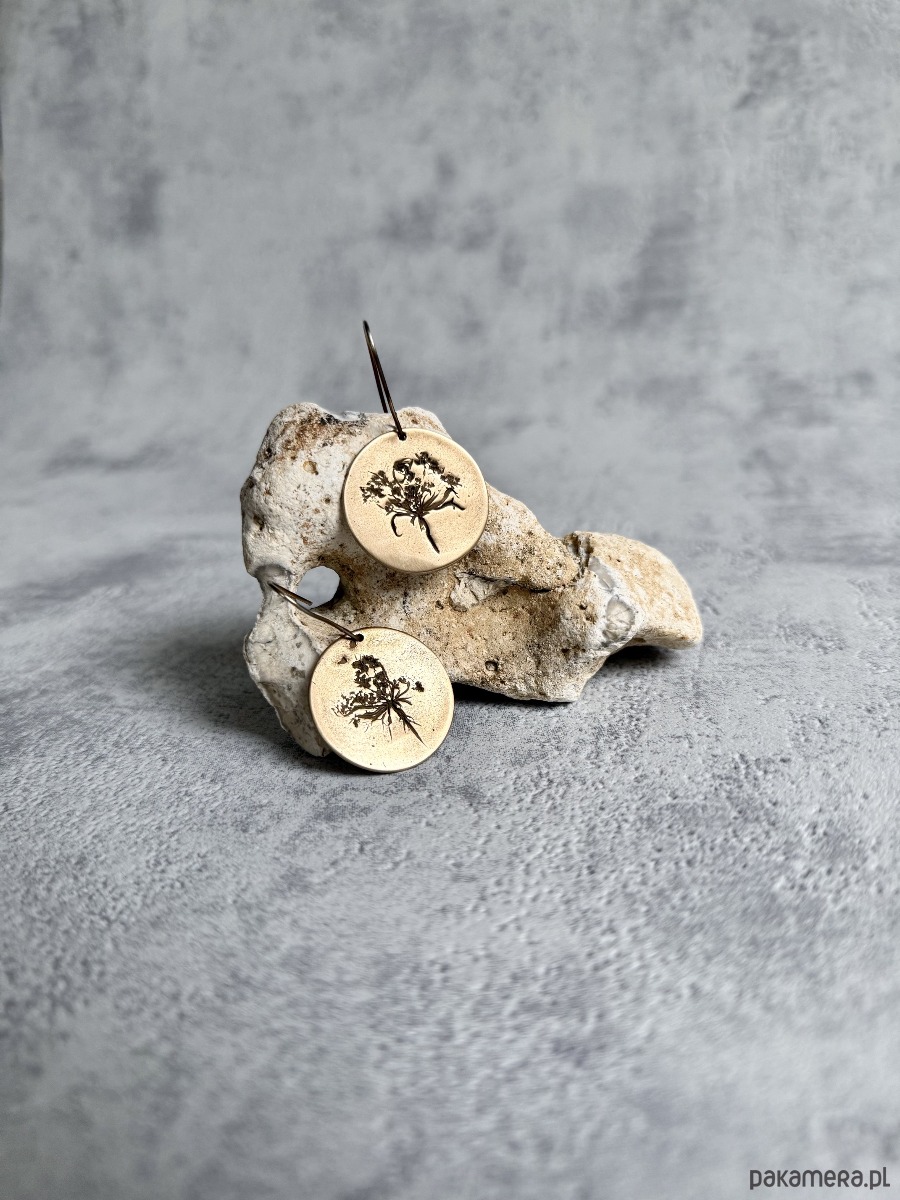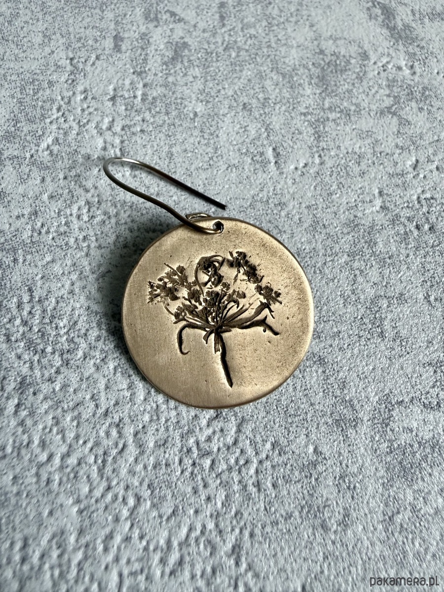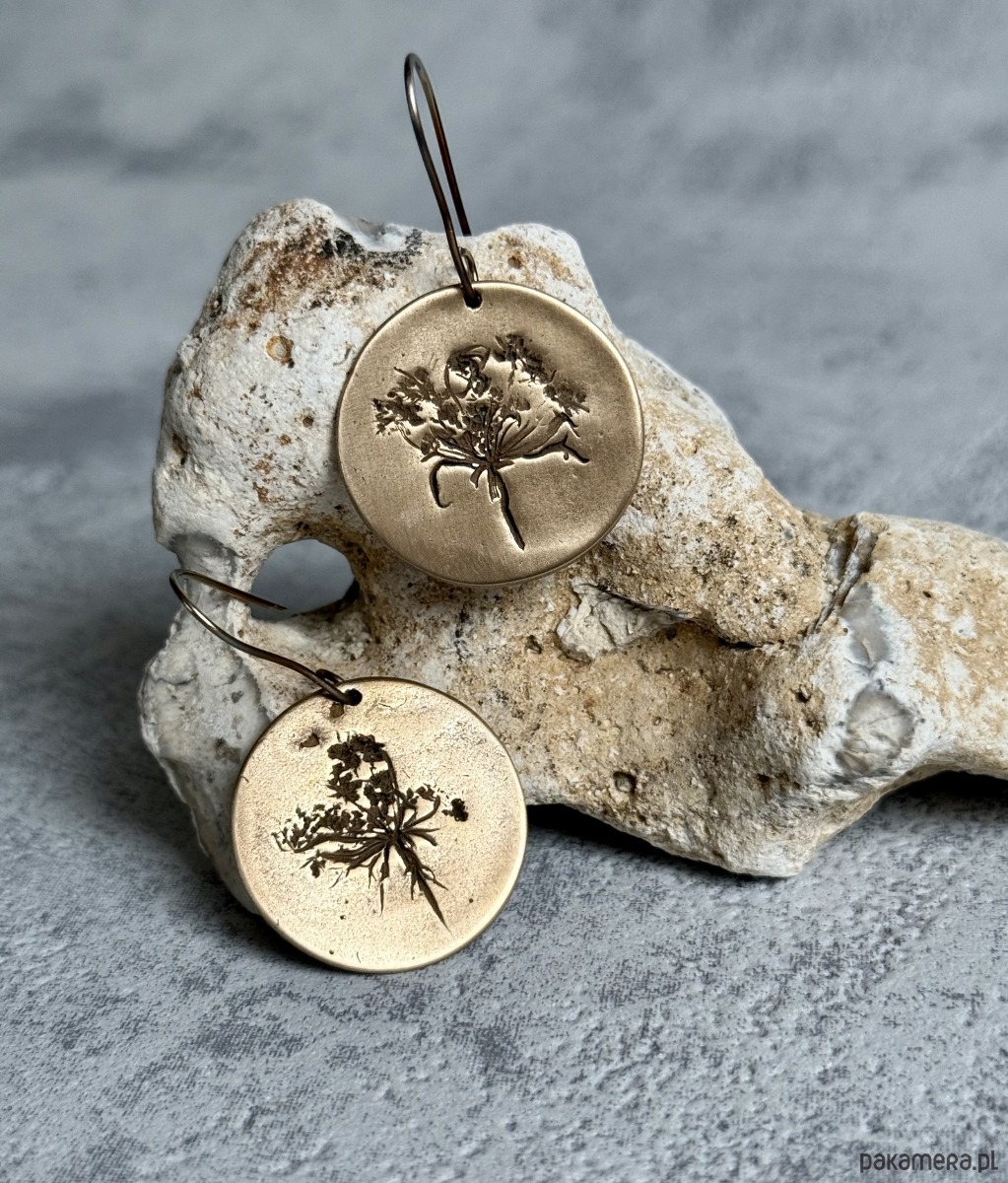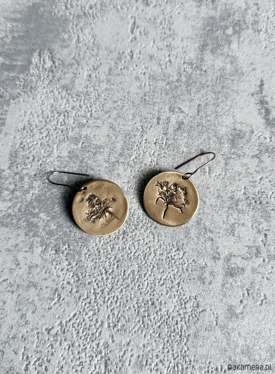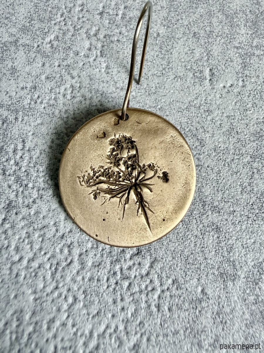 Element z brązu tworzę z glinki brązu i utrwalam w niej odcisk prawdziwych roślin - dlatego każdy kolczyk różni się od siebie i nie ma możliwości wykonania dwóch identycznych.