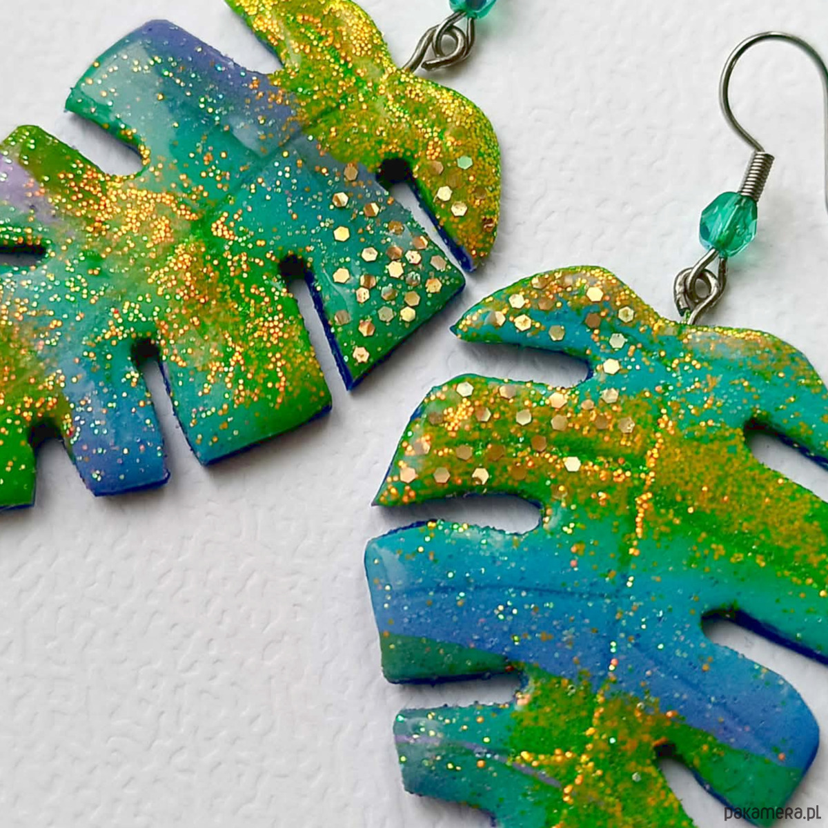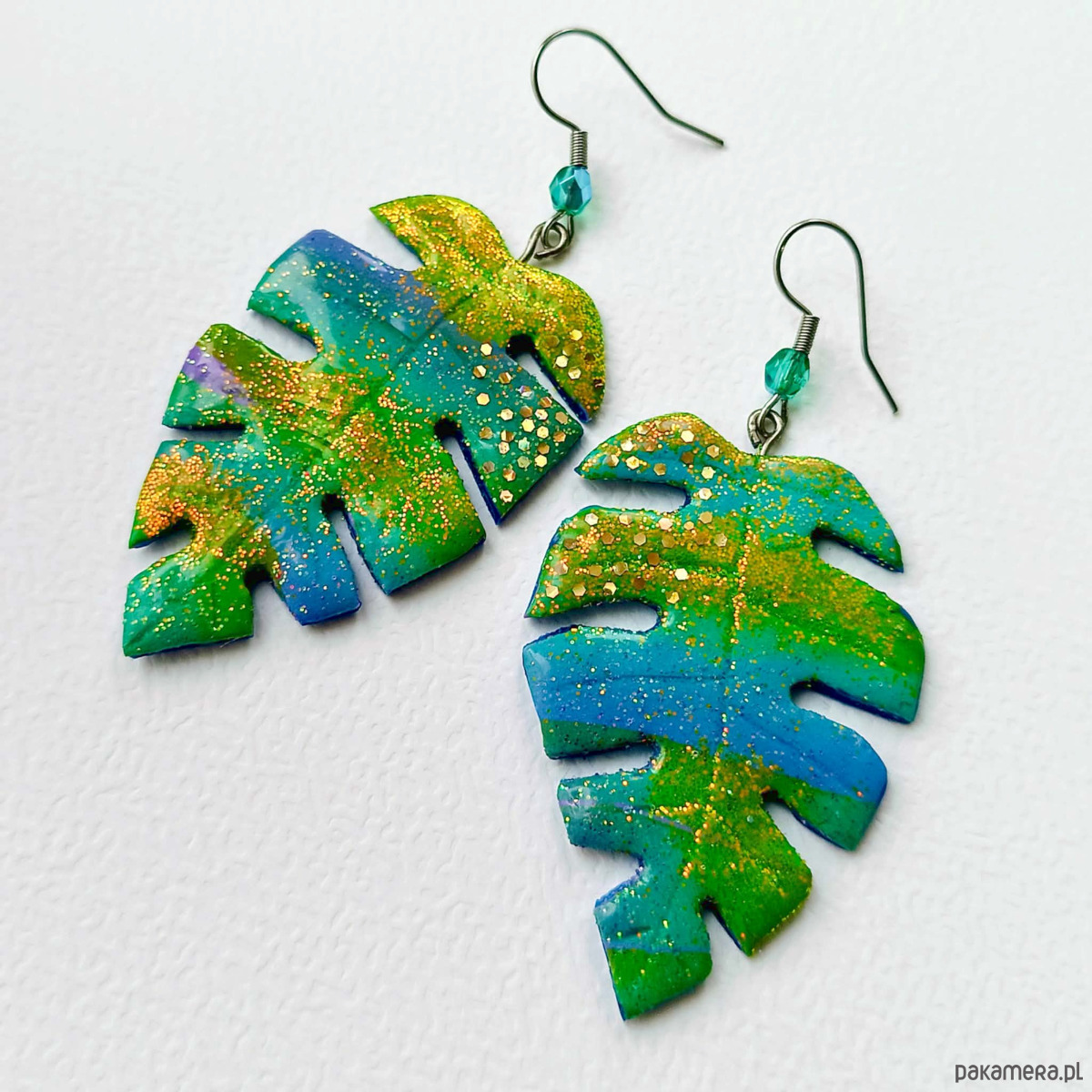 Ręcznie robione kolczyki w kształcie liści monstery, inspirowane naturą i kolorem.