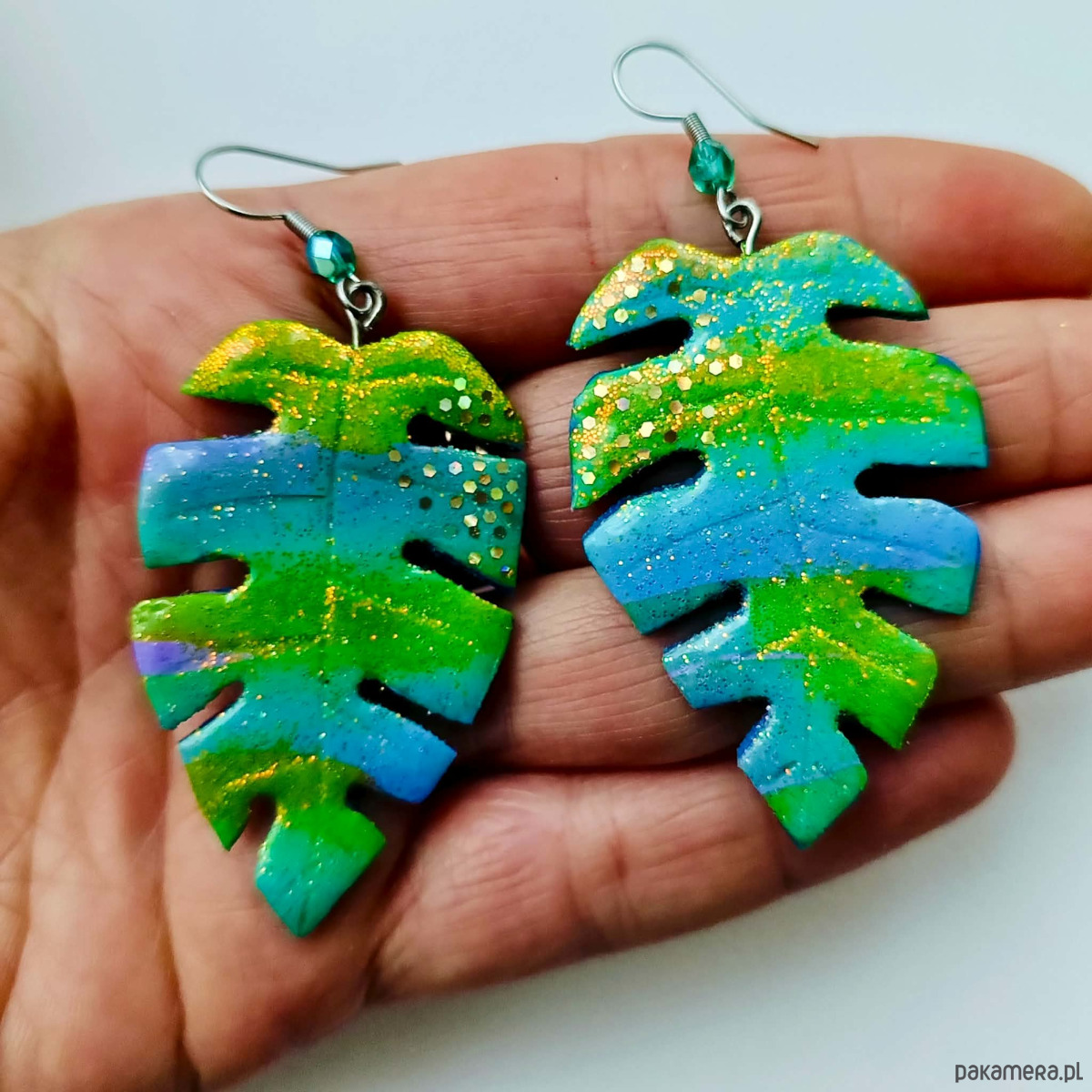 Ręcznie robione kolczyki w kształcie liści monstery, inspirowane naturą i kolorem.