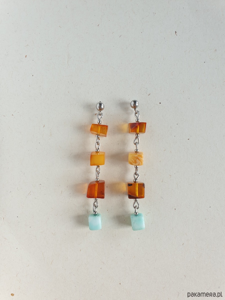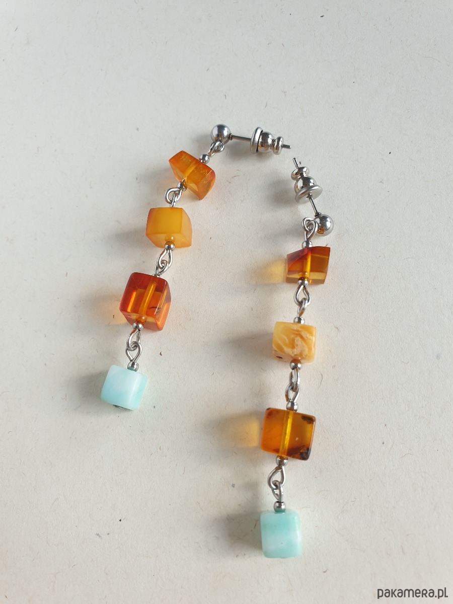 Kolczyki z bursztynem i amazonitem, kostki, wiszące
