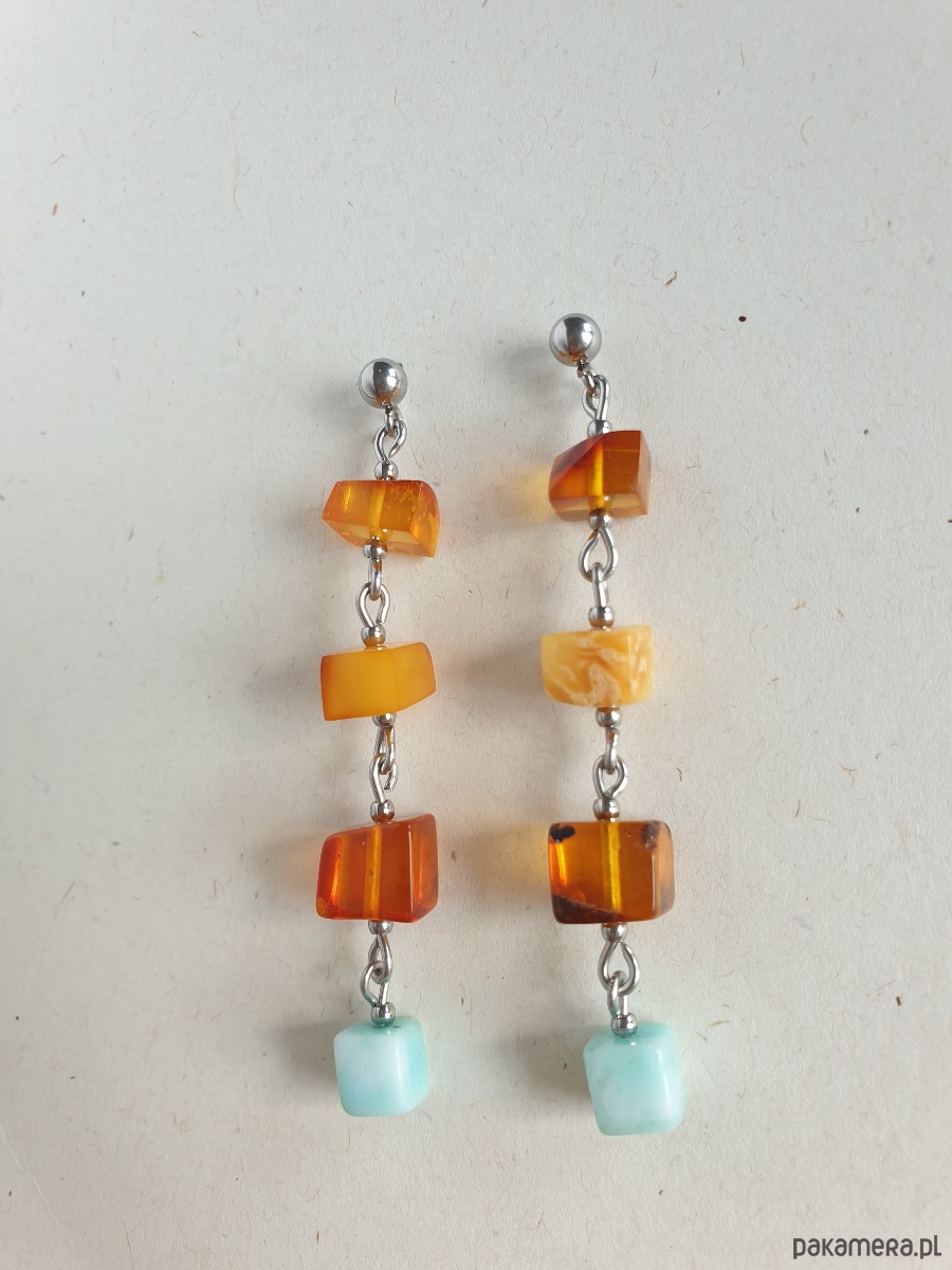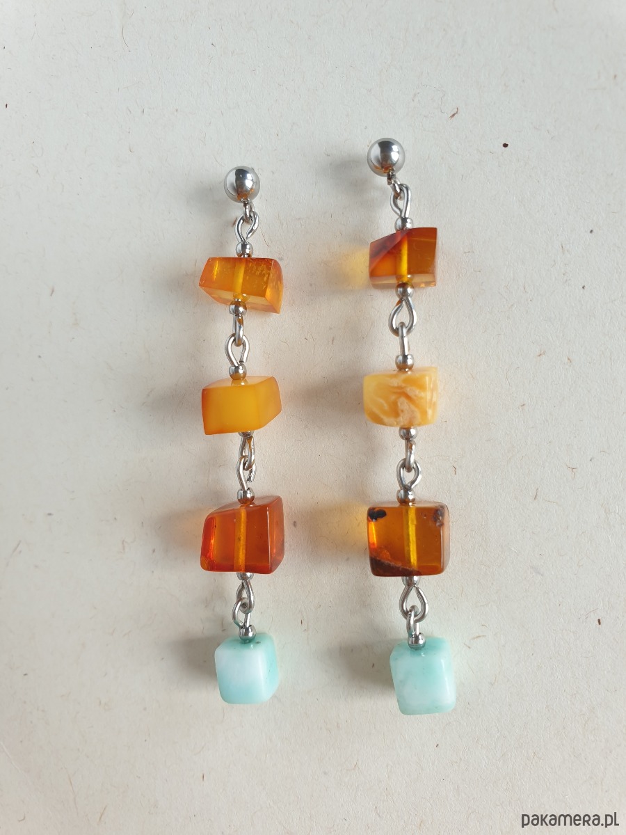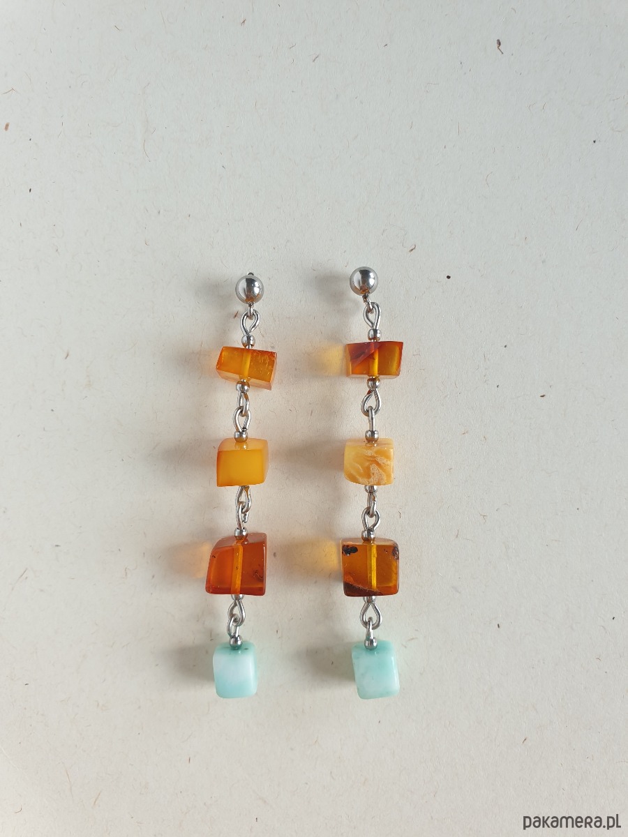 Kolczyki z bursztynem i amazonitem, kostki, wiszące