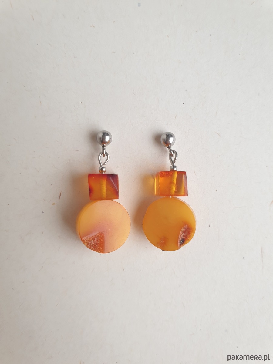 Wymiary: długość całego kolczyka ok 2,5 cm, kulka sztyftu średnica 3 mm, wielkość kostek ok 0,8 /0,8 cm , średnica bursztynowych talarków ok. 1 cm