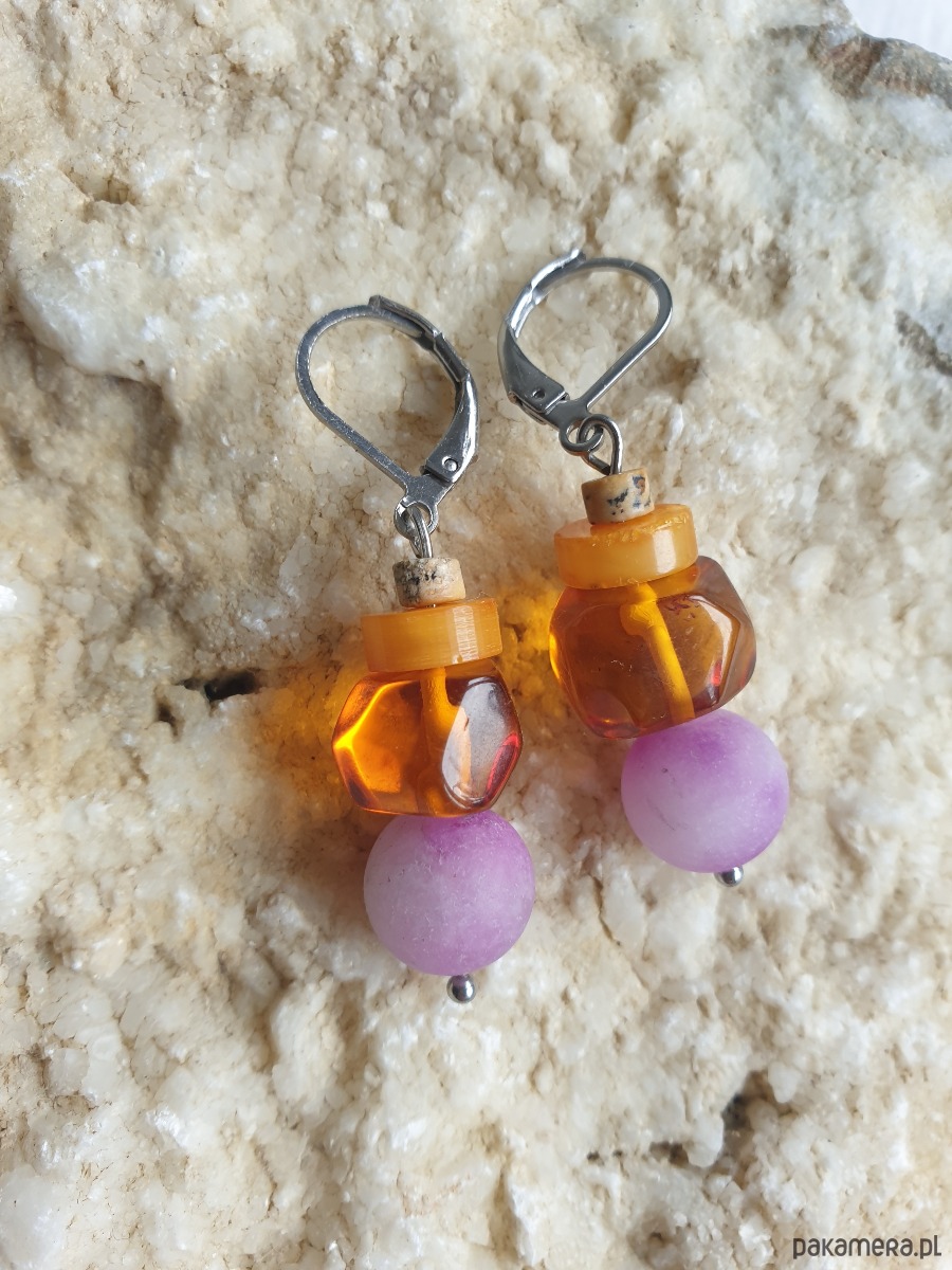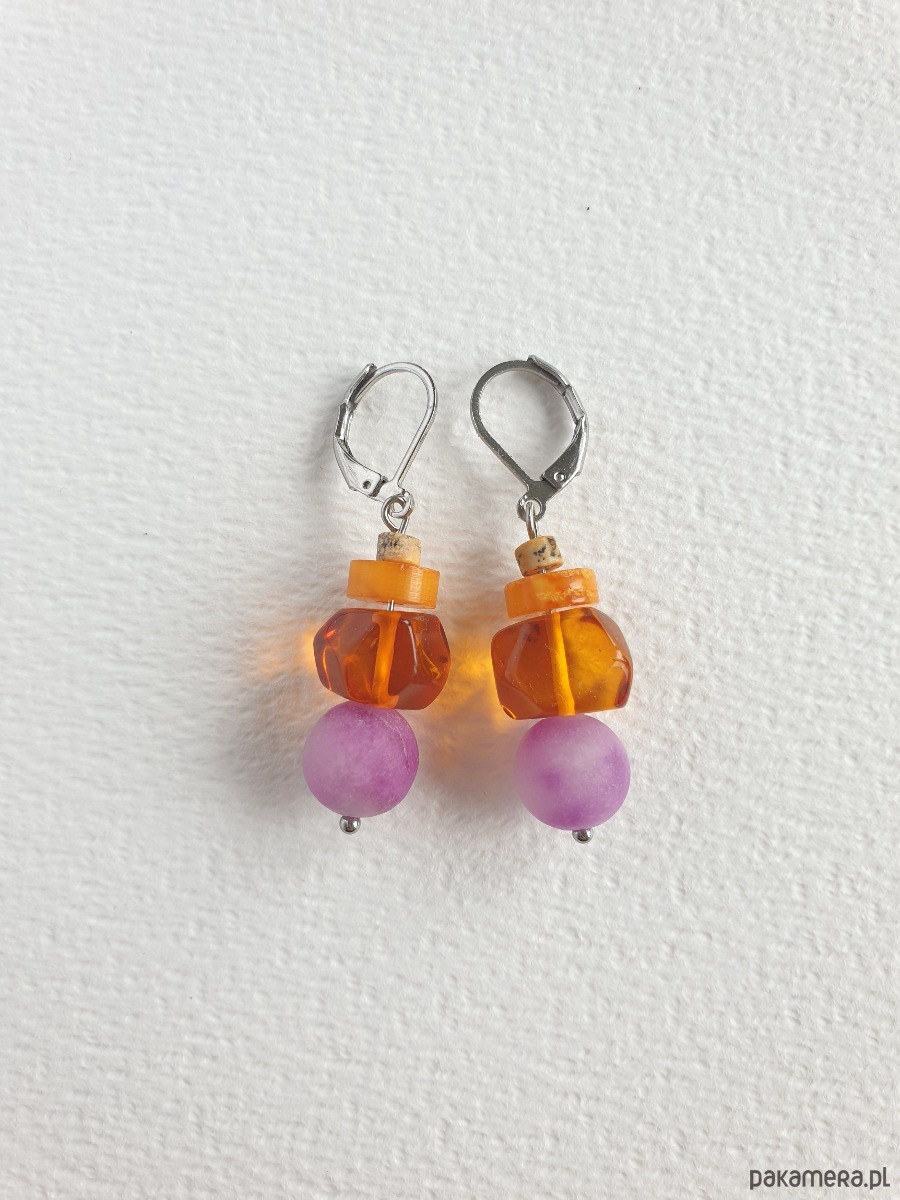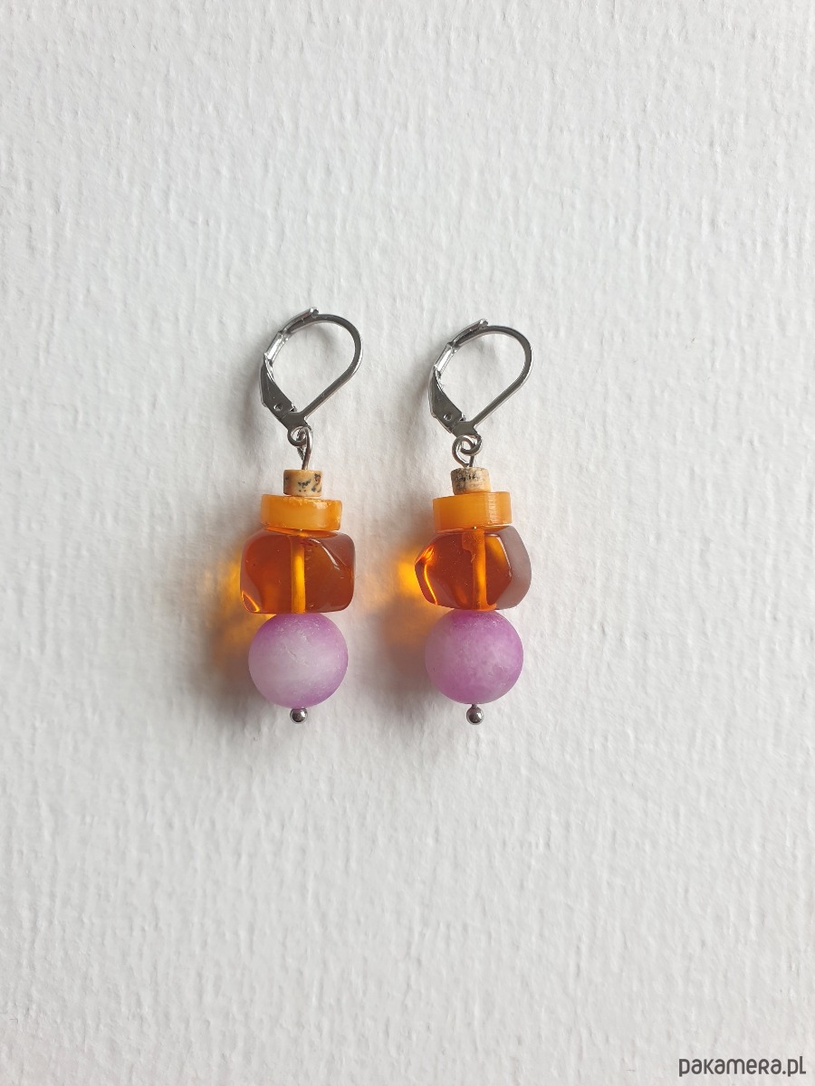 Kolczyki z bursztynem SZASZŁYK, wiszące, jadeit purpurowy