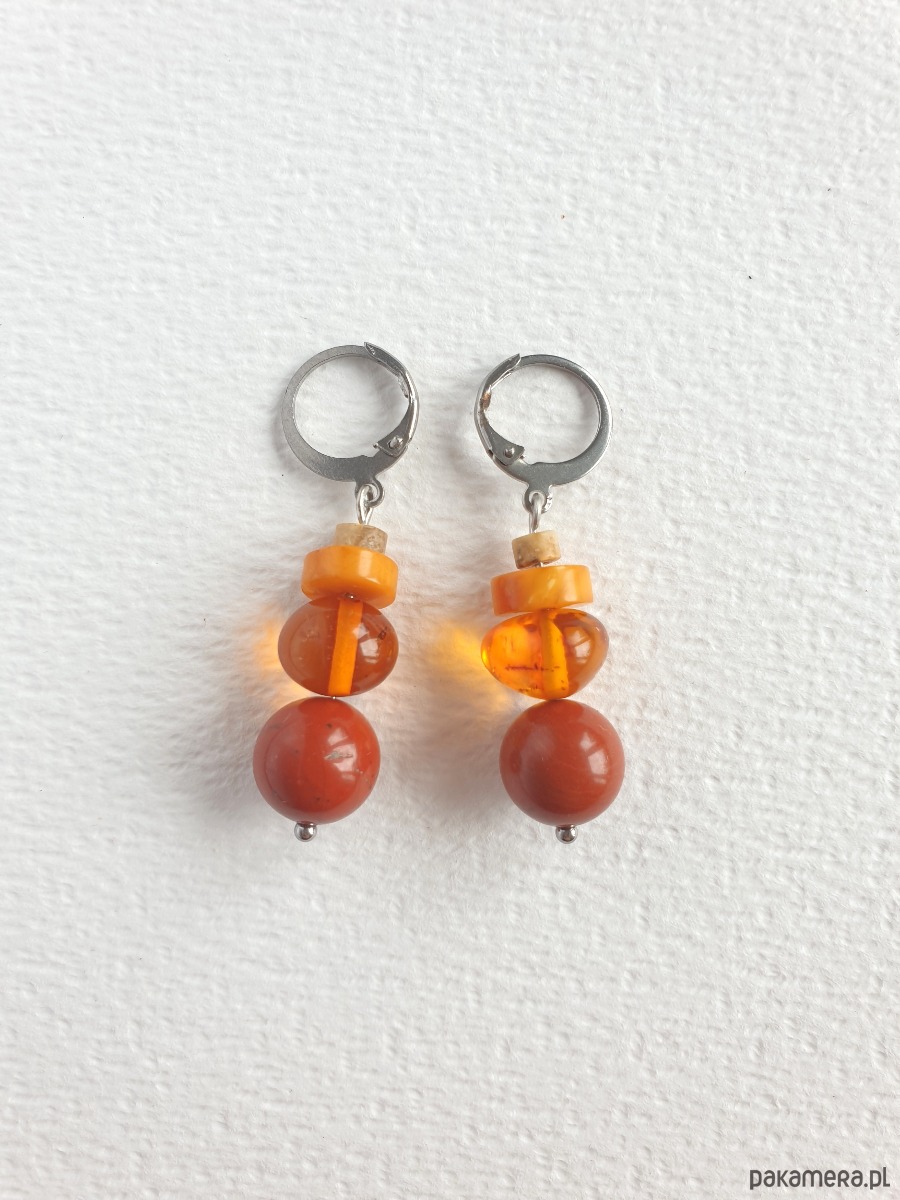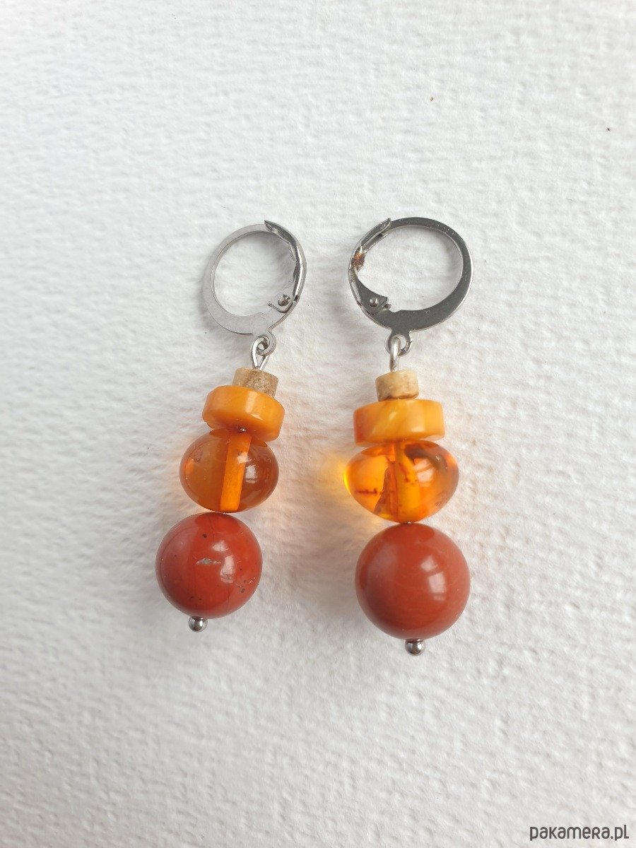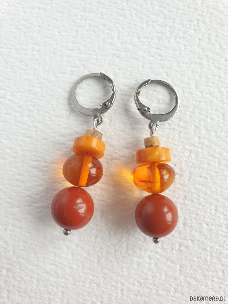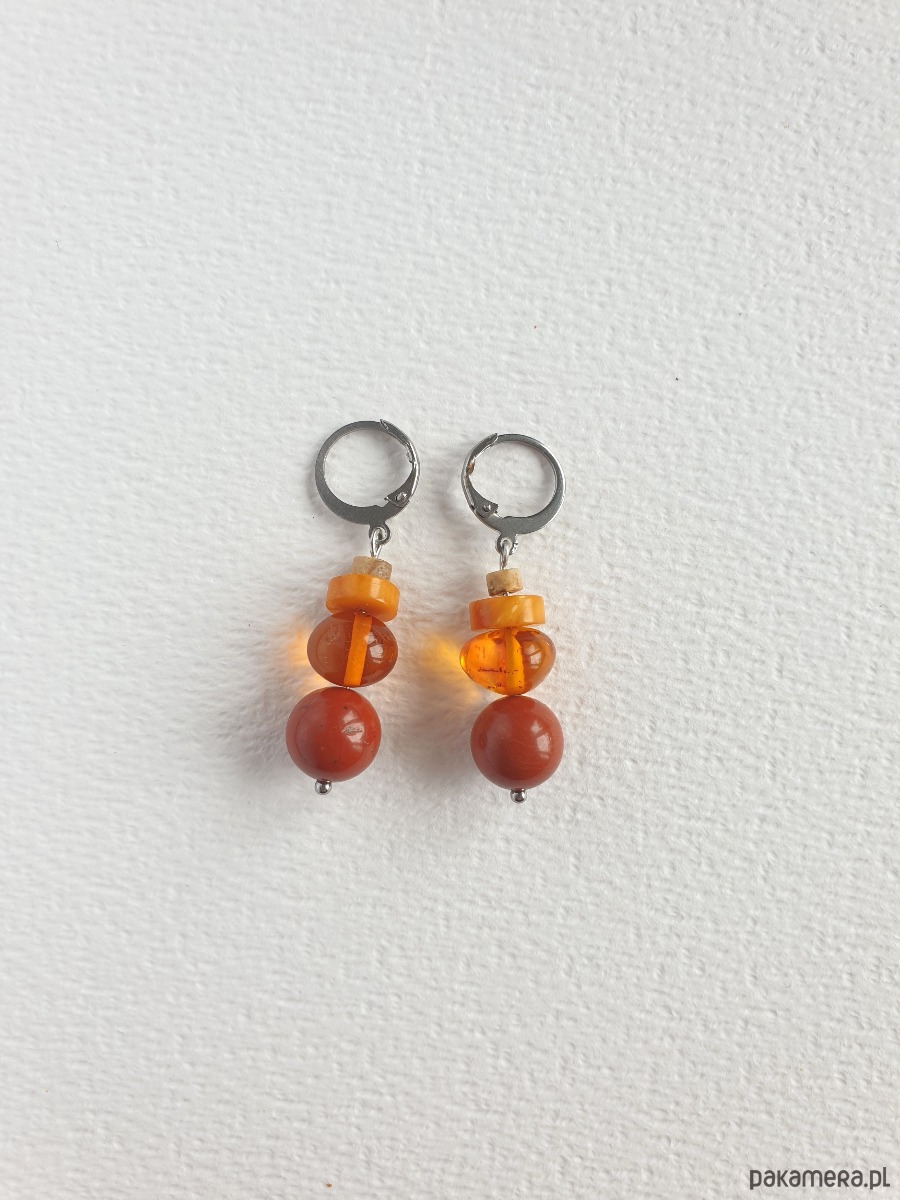 Okazałe kolczyki wiszące z bursztynem w nieregularnej formie, łączone z jaspisem królewskim czerwonym, jaspisem obrazkowym i elementami ze stali szlachetnej. Są bardzo lekkie bo bursztyn jest lekkim kamieniem. Idealne na co dzień, do jesiennych kolorów.