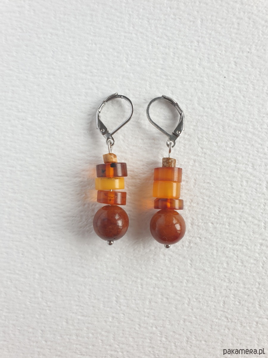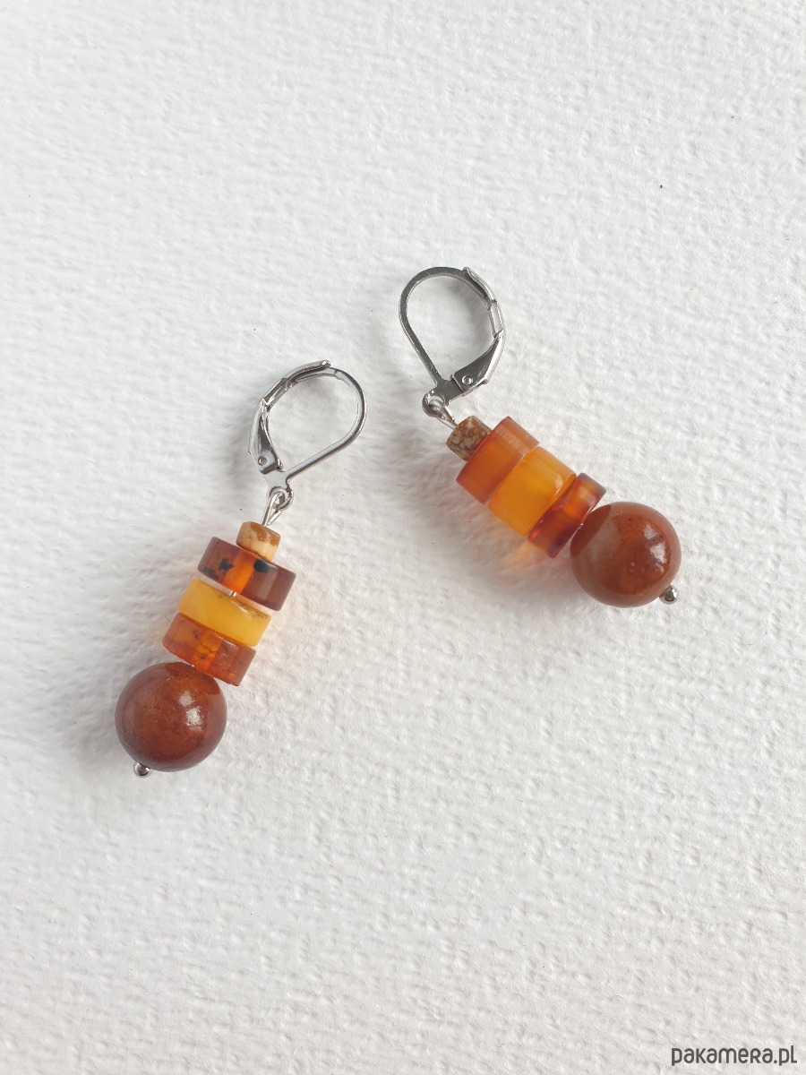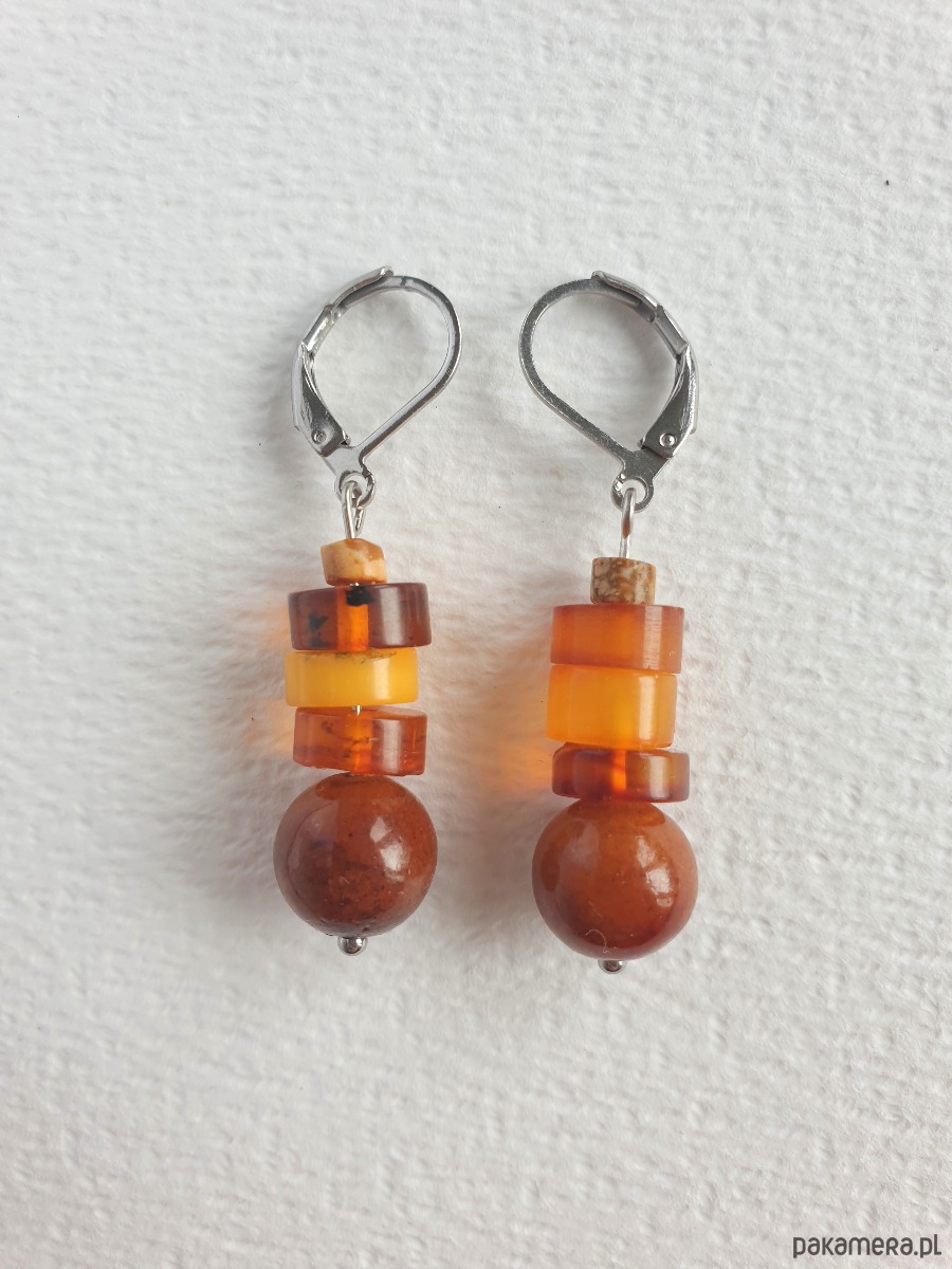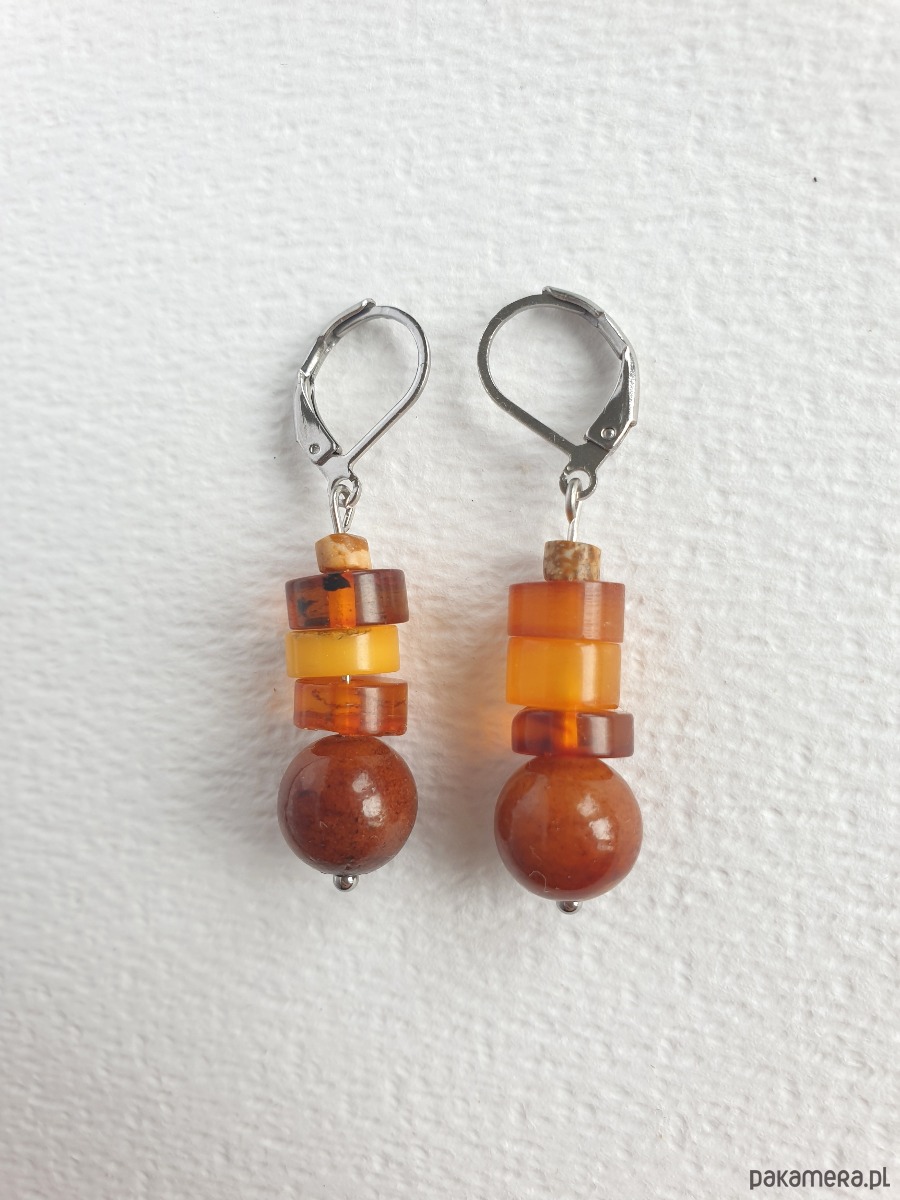 Okazałe kolczyki wiszące z bursztynem w nieregularnej formie, łączone z jadeitem barwionym na kasztanowy kolor, jaspisem obrazkowym i elementami ze stali szlachetnej. Są bardzo lekkie bo bursztyn jest lekkim kamieniem. Idealne na co dzień, do jesiennych kolorów.