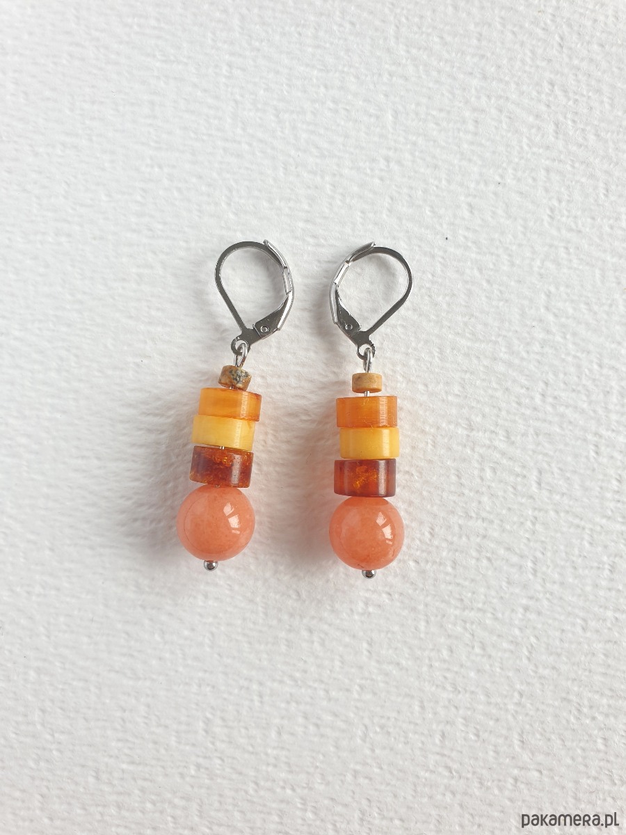 Okazałe kolczyki wiszące z bursztynem w nieregularnej formie, łączone z jadeitem barwionym na łososiowy kolor, jaspisem obrazkowym i elementami ze stali szlachetnej. Są bardzo lekkie bo bursztyn jest lekkim kamieniem. Idealne na co dzień, do jesiennych kolorów.