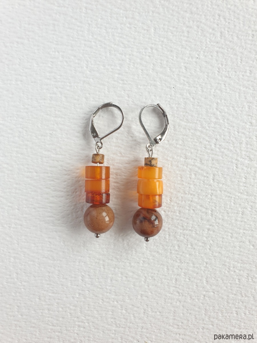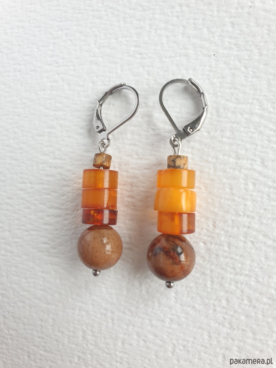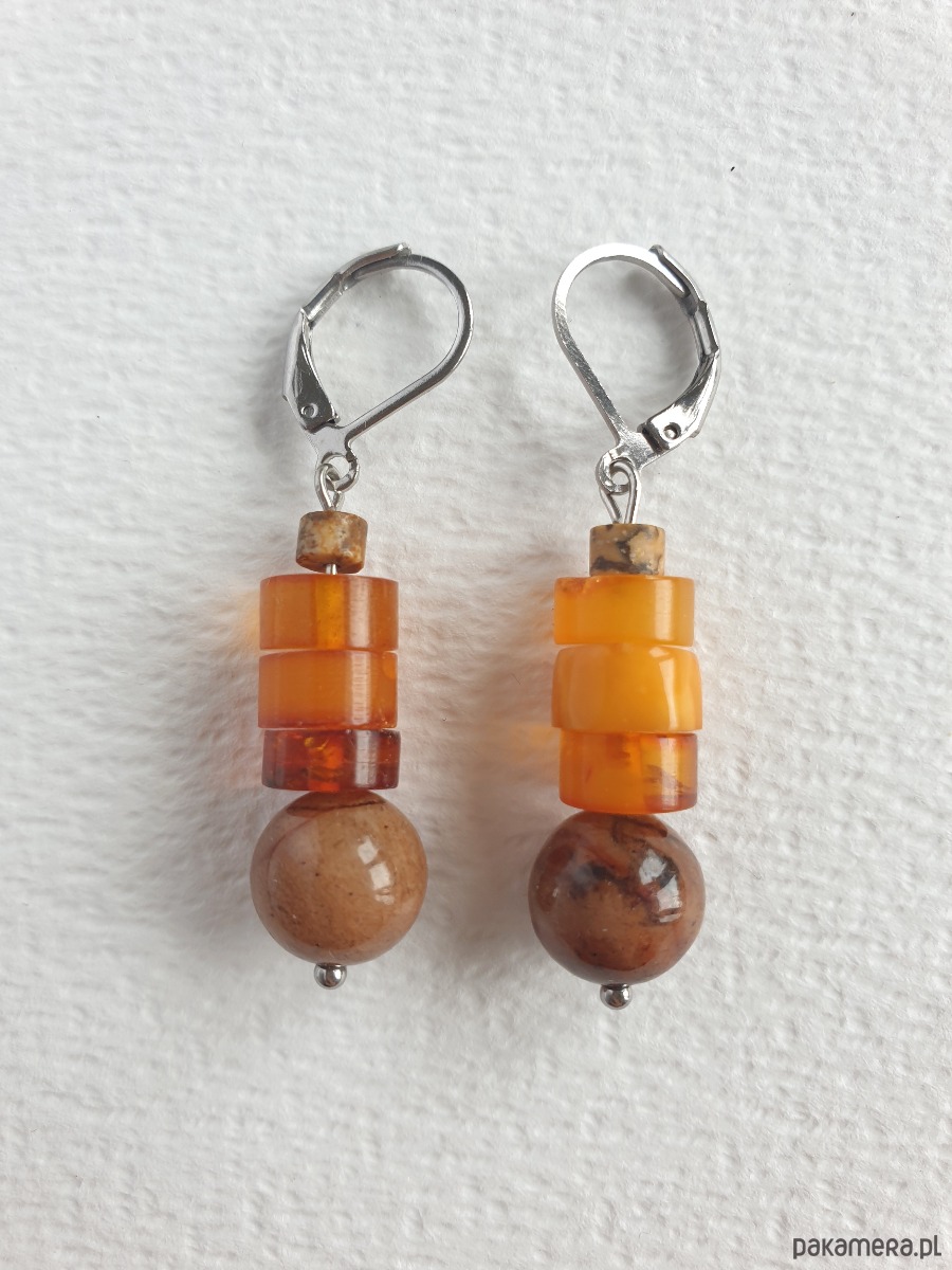 Okazałe kolczyki wiszące z bursztynem w nieregularnej formie, łączone z jadeitem barwionym na orzechowy kolor, jaspisem obrazkowym i elementami ze stali szlachetnej. Są bardzo lekkie bo bursztyn jest lekkim kamieniem. Idealne na co dzień, do jesiennych kolorów.