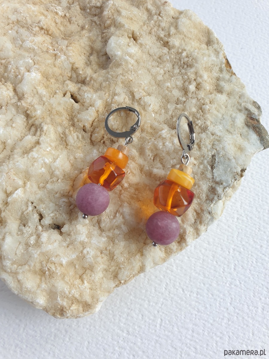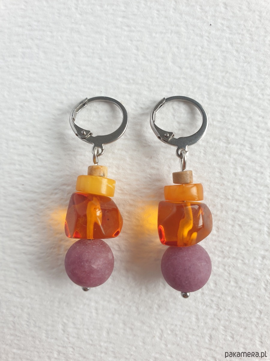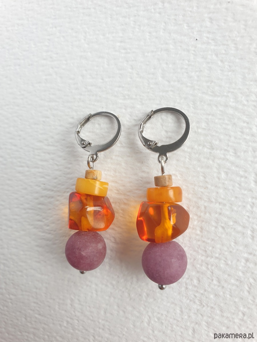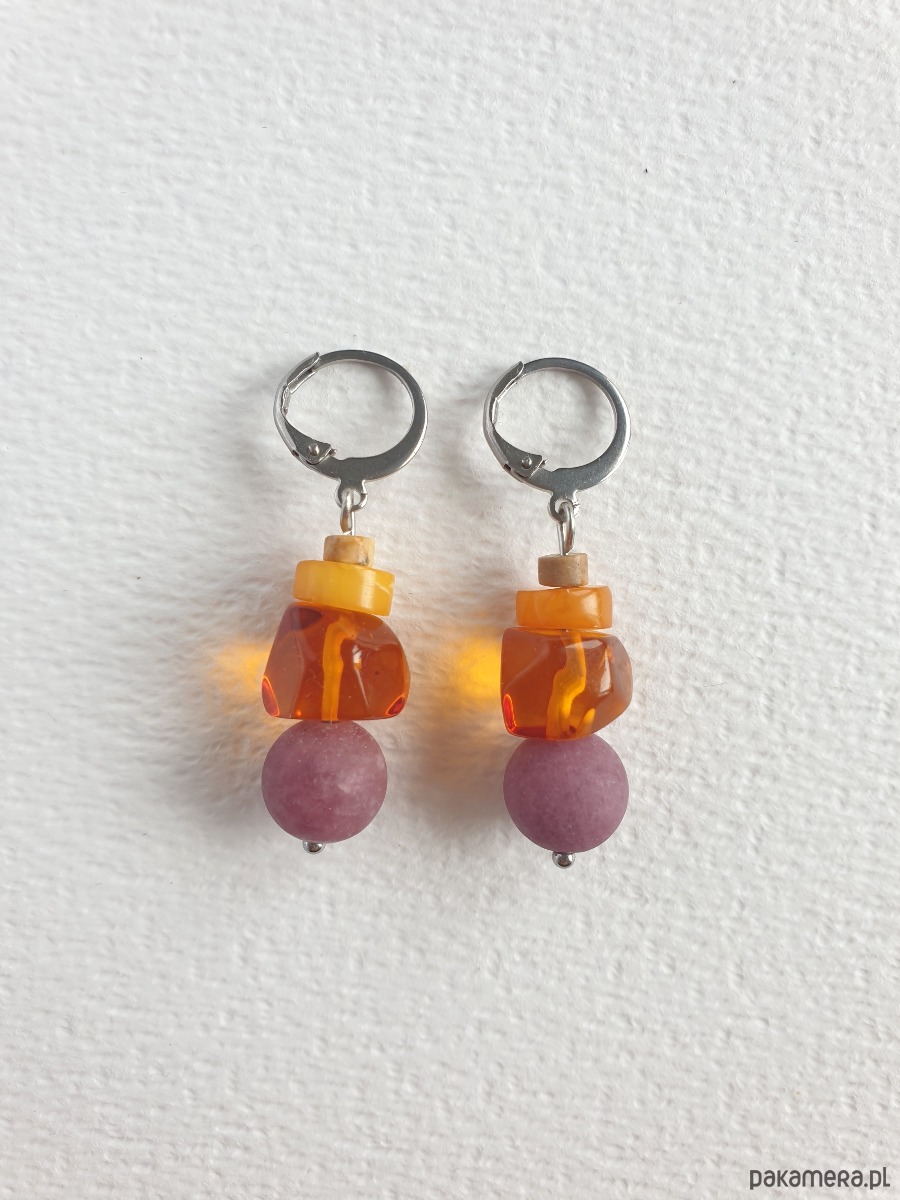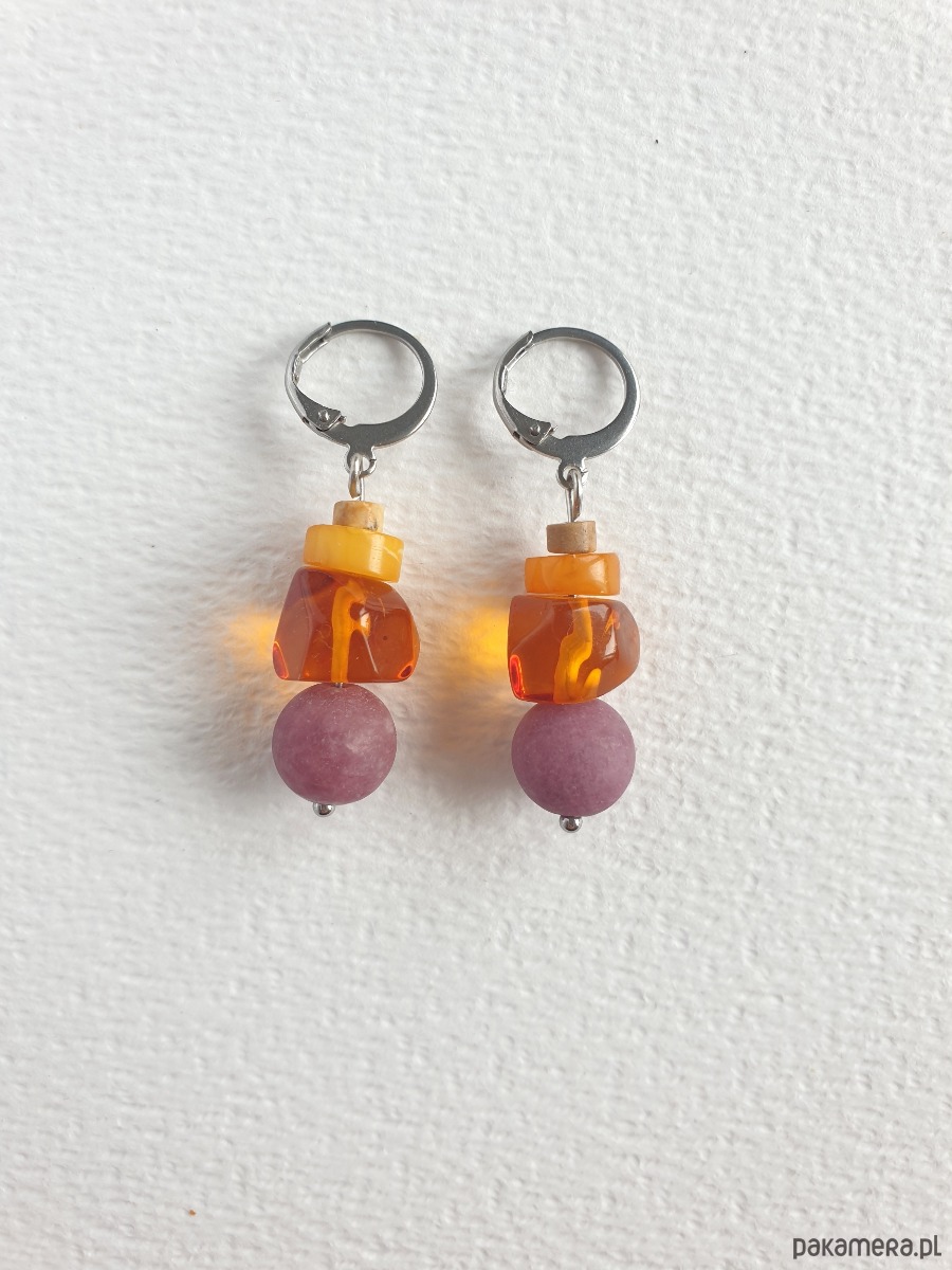 Okazałe kolczyki wiszące z bursztynem w nieregularnej formie, łączone z jadeitem barwionym na wrzosowy kolor, jaspisem obrazkowym i elementami ze stali szlachetnej. Są bardzo lekkie bo bursztyn jest lekkim kamieniem. Idealne na co dzień, do jesiennych kolorów.