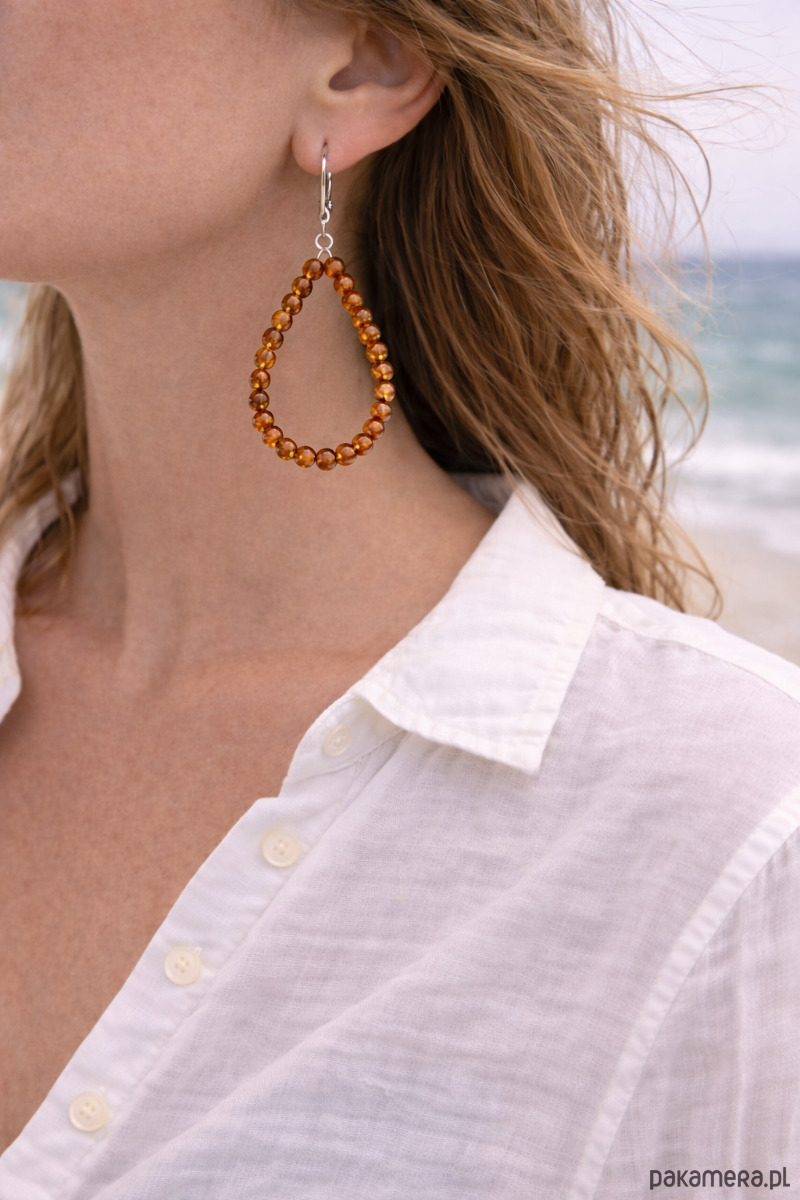 Kolczyki te zostały wykonane z bursztynowych, regularnych kulek w kolorze koniakowym Zapięcie zostało wykonane ze srebra próby 925. Kolczyki te doskonale wpisują się w estetykę boho.
