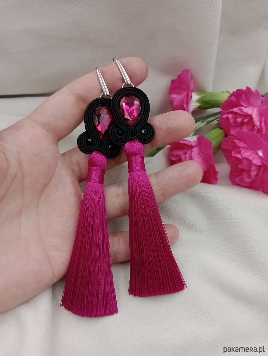 Kolczyki z chwostami fuksja, różowe chwosty, czarne klipsy